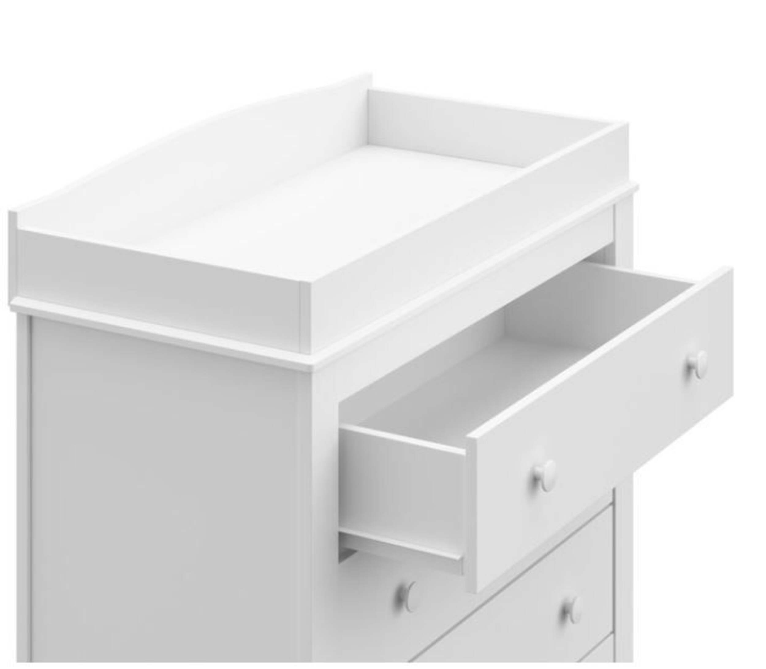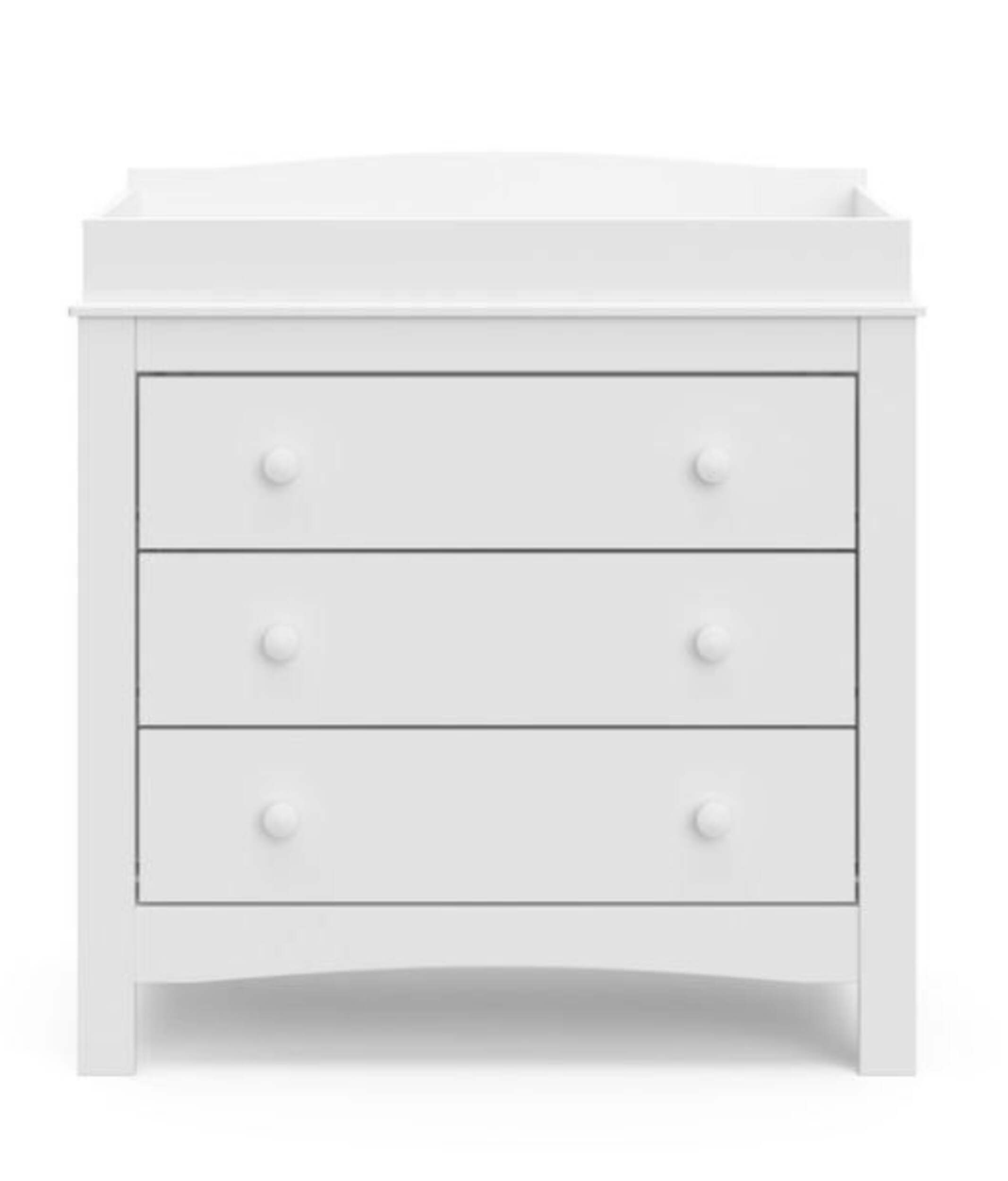 Getting your nursery essentials organized has never been easier with the Graco Noah 3 Drawer Dresser with Changing Topper, White. The 3 generous drawers provide plenty of storage for all your baby's clothing and accessories while the attached changing pad platform is perfect for diaper changes on the go. Built from durable, engineered wood that is warp and twist-resistant, this dresser is designed to last long. The Euro-glide drawers open and close smoothly with safety stops and German cam locks to keep little hands out. The stain-resistant surface wipes clean in a jiff with minimal effort, keeping it looking fresh for years. Matching the rest of the Graco Noah collection, this versatile dresser's timeless style and uncomplicated design ensure it blends seamlessly into any nursery or child's room. Rigorously tested to meet the highest safety standards, you can be confident this dresser will keep your growing family organized for years. "