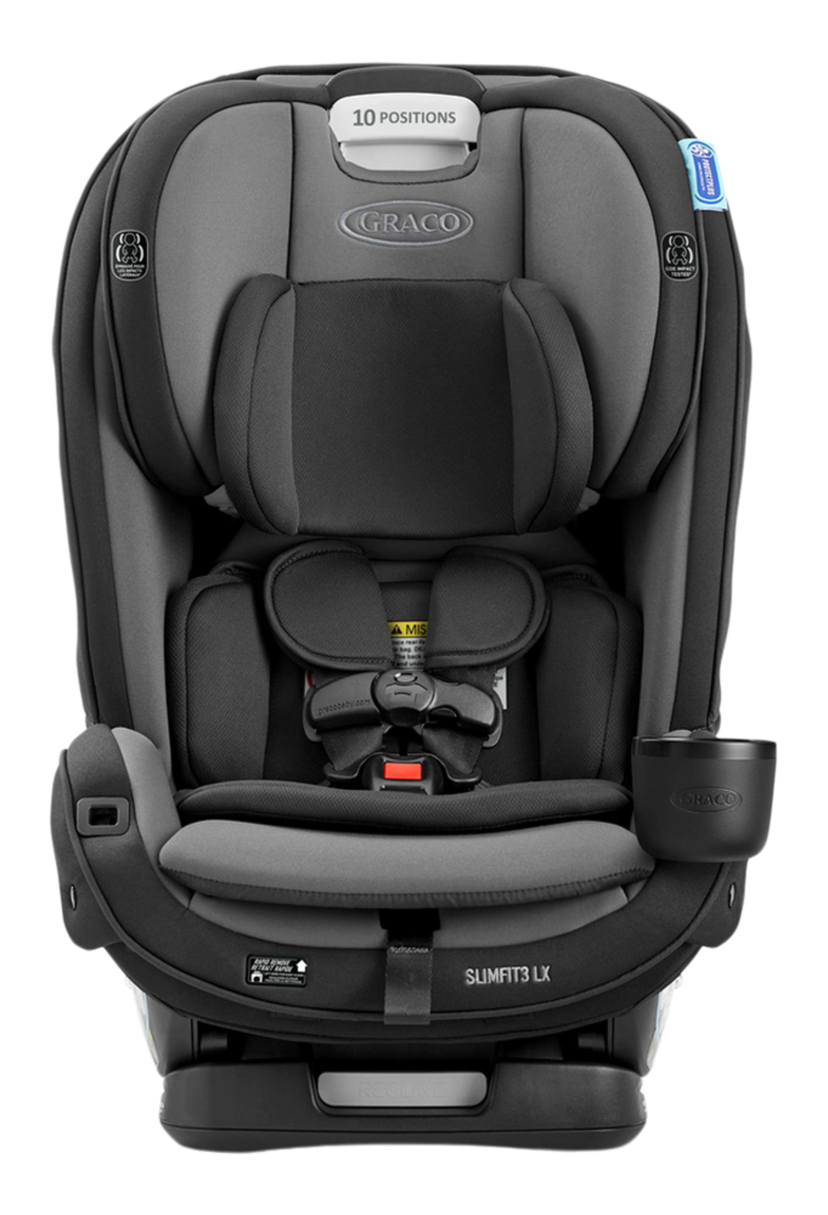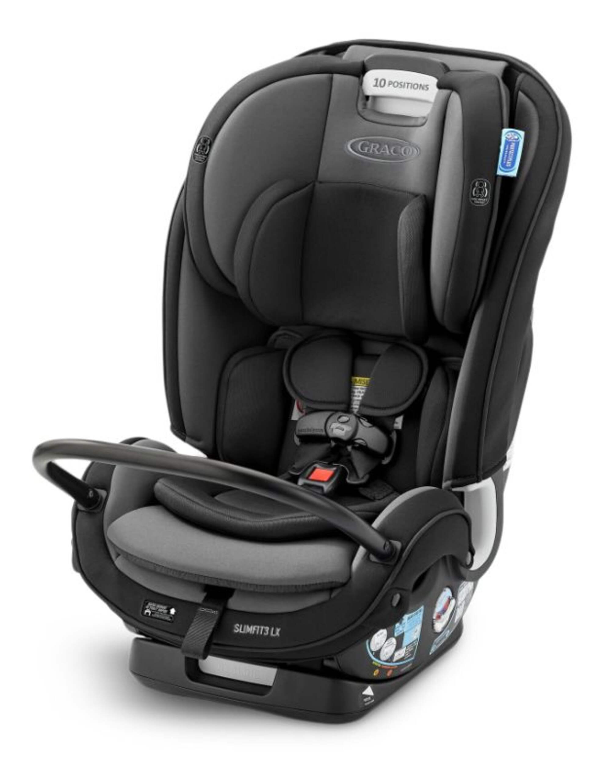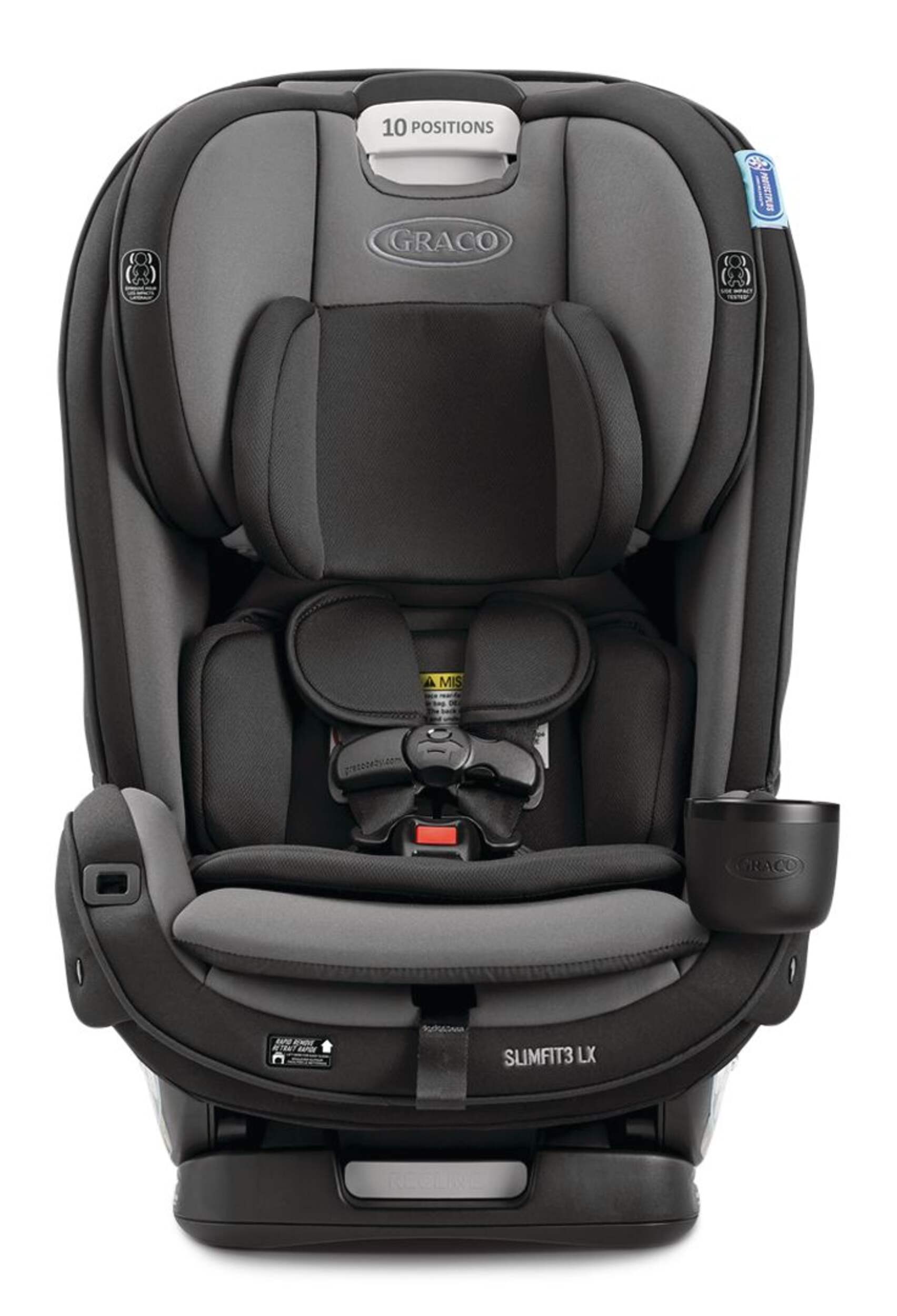 The Graco Slimfit3™ LX 3-in-1 Convertible Car Seat offers a space-saving design that grows with your child. It seamlessly transitions from a rear-facing harness to a forward-facing harness and then to a high-back booster. The no-rethread Simply Safe Adjust™ Harness System ensures easy adjustments as your child grows, while rotating cup holders and storage pockets add convenience. With a rapid-remove cover, this car seat makes cleaning hassle-free.