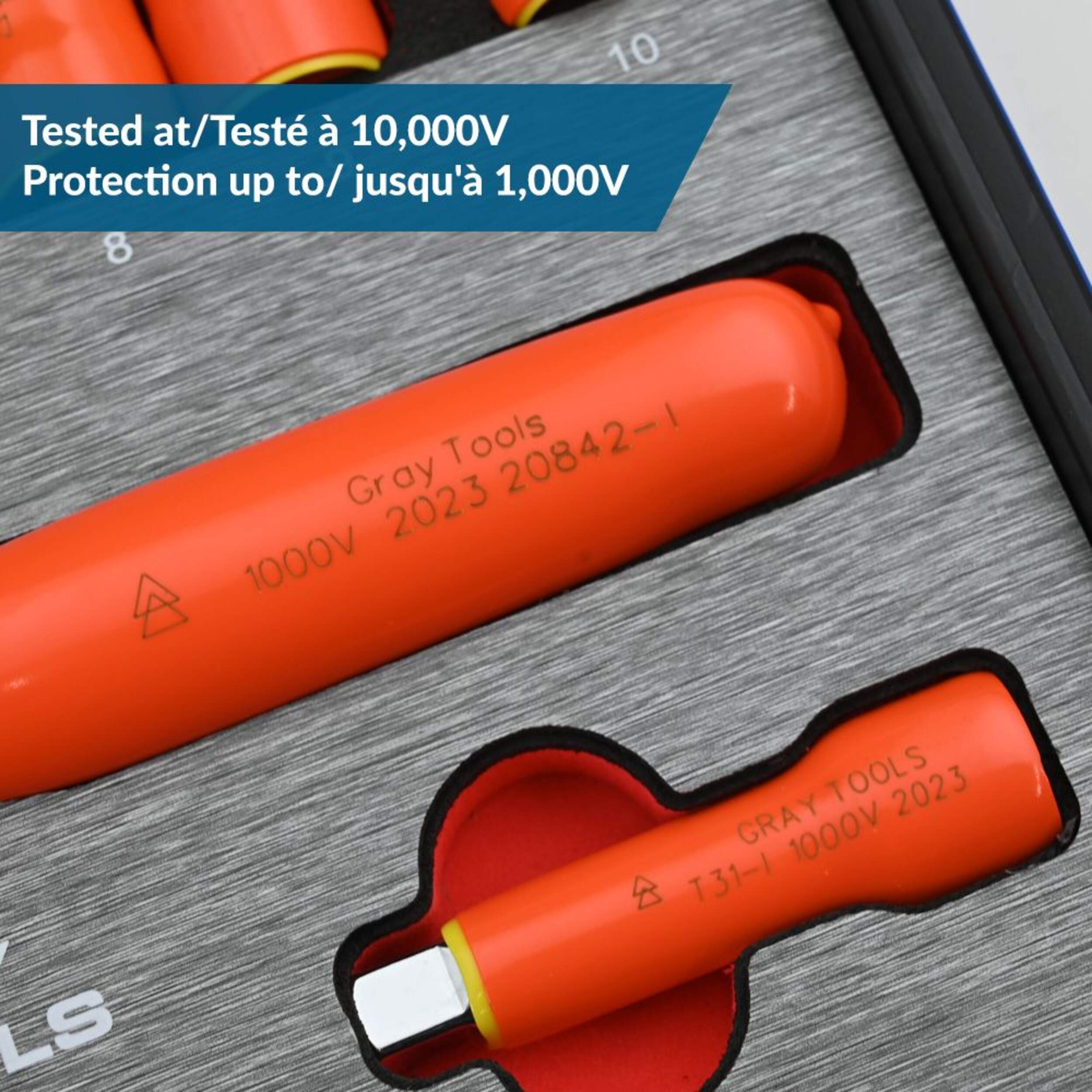 The Gray Tools® 1/2-in Drive Socket Extension is a 10-in long, insulated tool designed for safely handling electrical components. Its double-layered insulation features an orange top layer and a yellow under layer that serves as a visual safety indicator. A spring-loaded ball ensures a positive lock onto sockets. Individually insulated and tested to ASTM F1505 standards, this extension provides user protection for up to 1000V. With its durable insulation and secure socket connection, the Gray Tools® extension offers a safe and reliable option for electrical work.