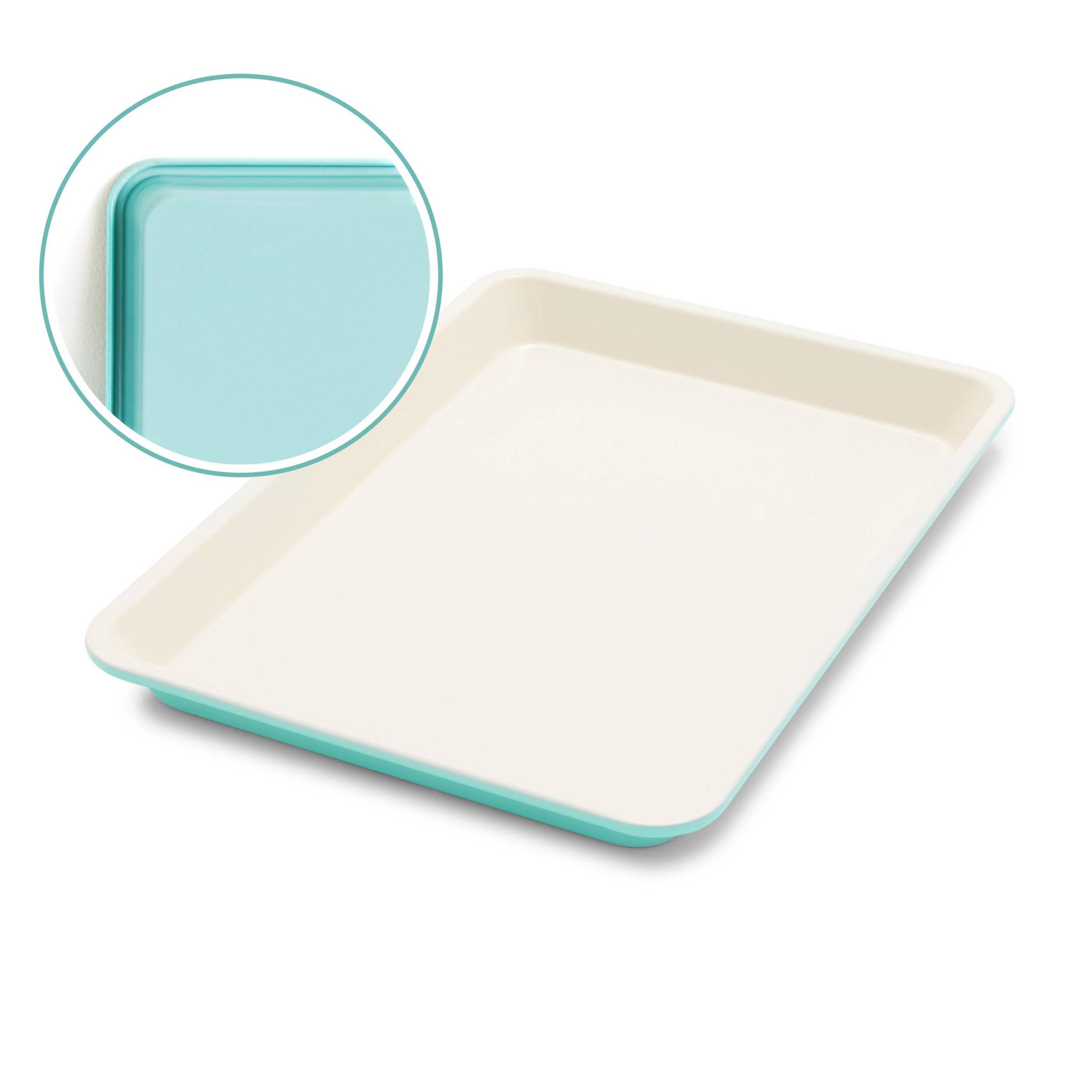 This turquoise quarter cookie sheet features a heavy gauge carbon steel body with healthy ceramic non-stick coating