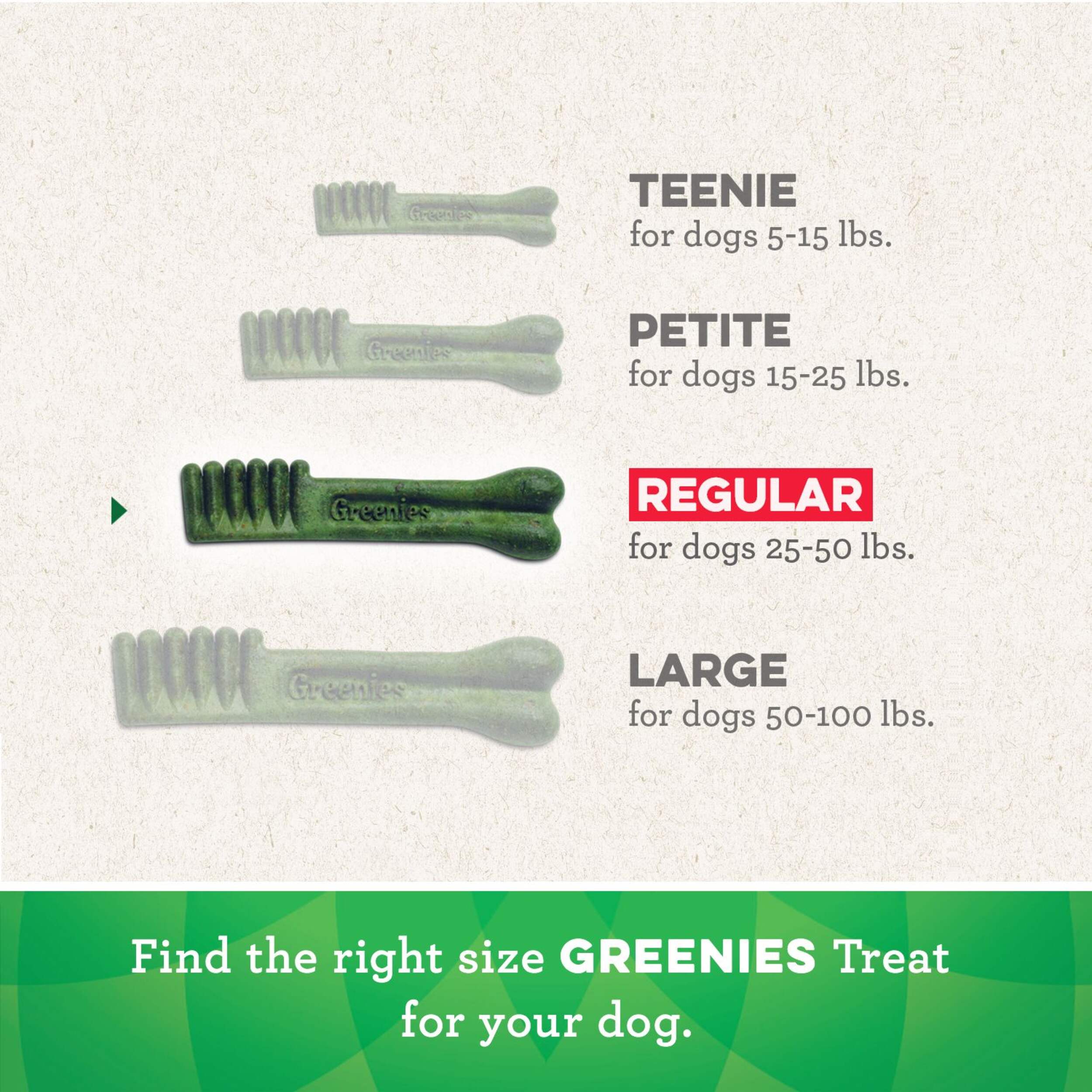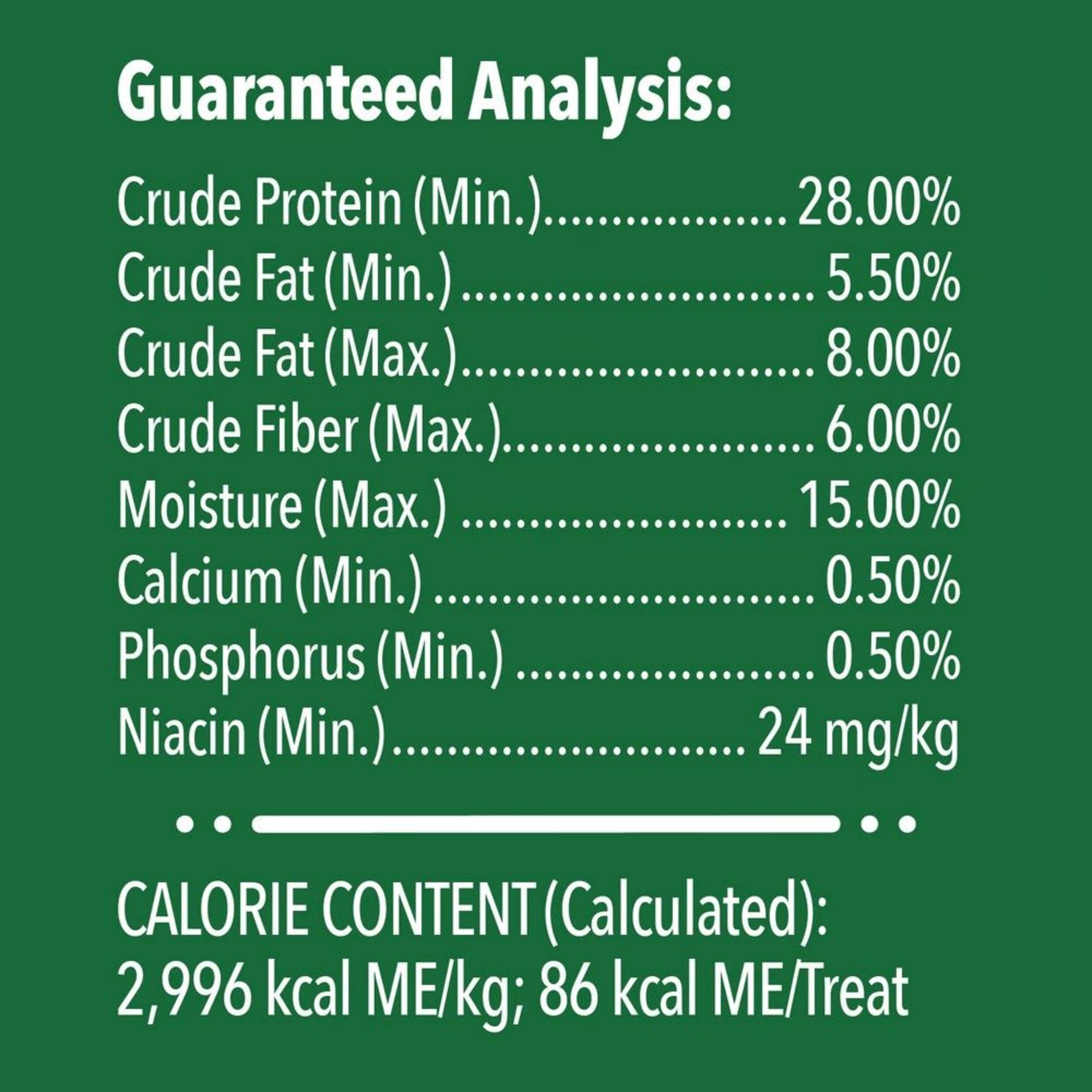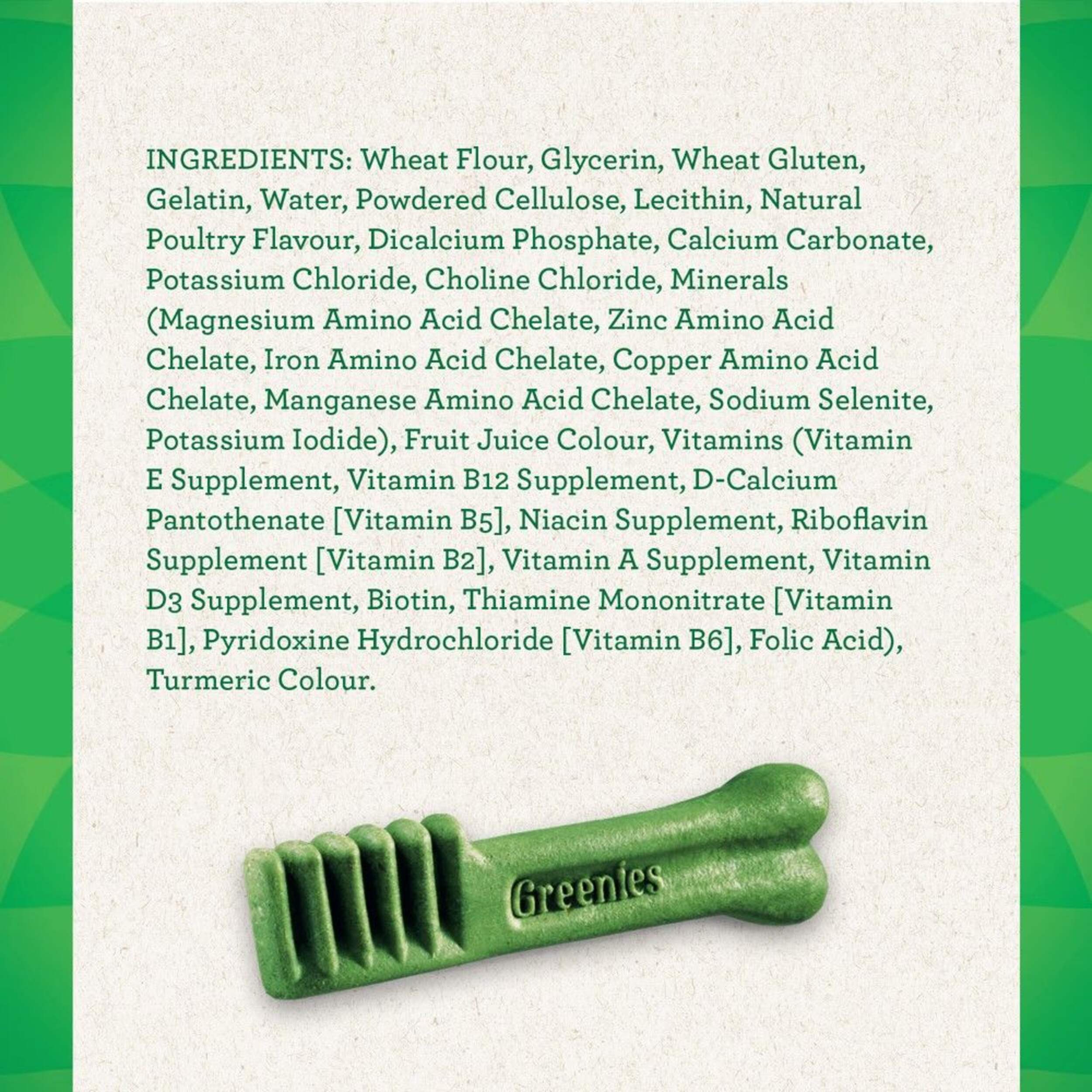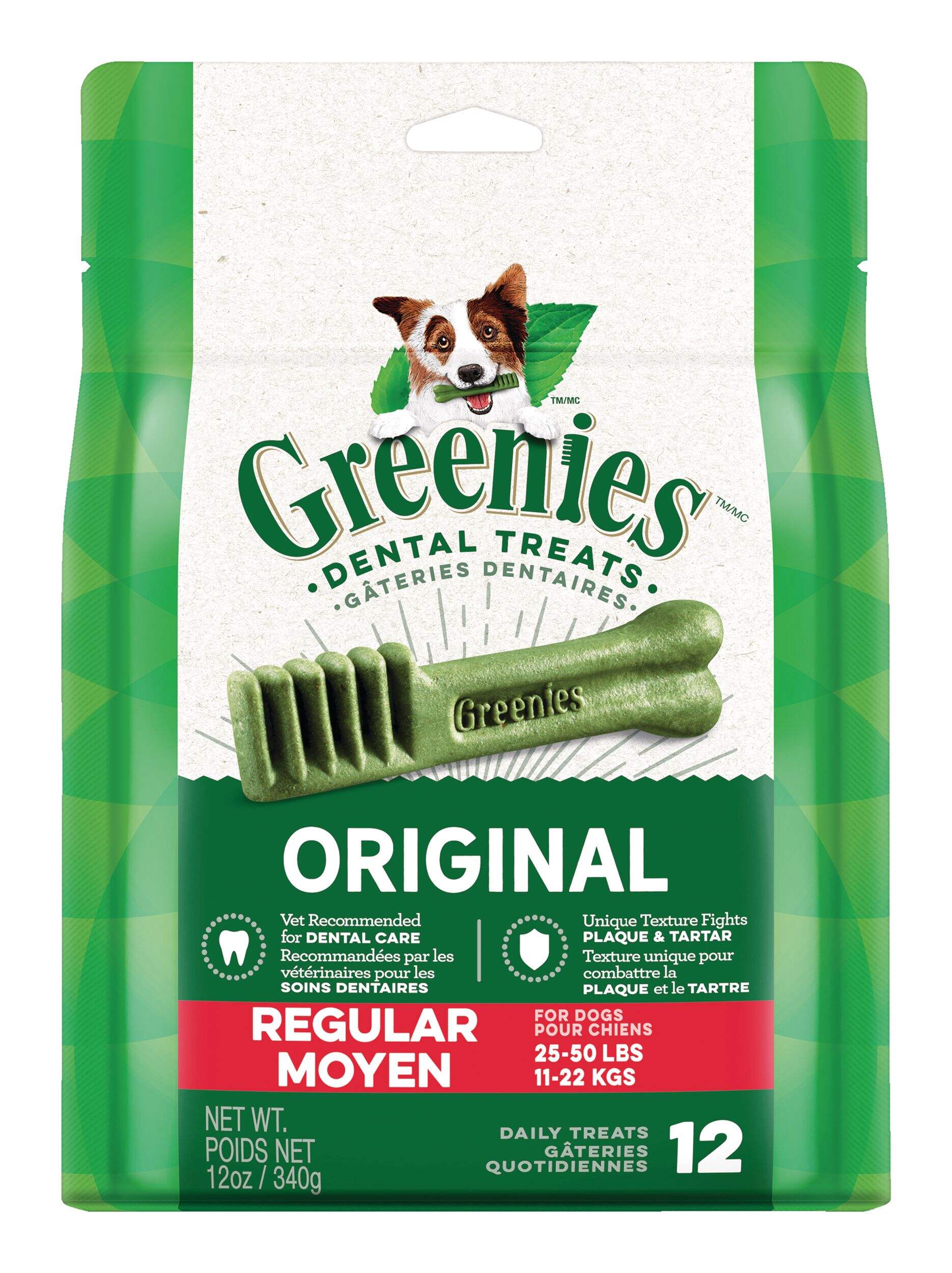 One GREENIES Original Dental Treat a day is all it takes for clean teeth, fresh breath, and a happy dog. Your dog will love sinking their teeth into these delicious, original-flavour dental chews, which have a delightfully chewy texture that fights plaque and tartar. Irresistibly tasty and incredibly effective, GREENIES Treats for Dogs are veterinarian-recommended for at-home dental care and approved by the Veterinary Oral Health Council (VOHC). Best of all, these natural dog treats not only freshen breath but are also made with highly soluble ingredients that are safe and easy to digest. Give your canine the mouth-wowing treat that promotes their oral hygiene and overall health with GREENIES Dog Treats. These treats are especially great for small breeds and dogs weighing between 25 and 50 pounds and also contain added vitamins, minerals, and other essential nutrients.