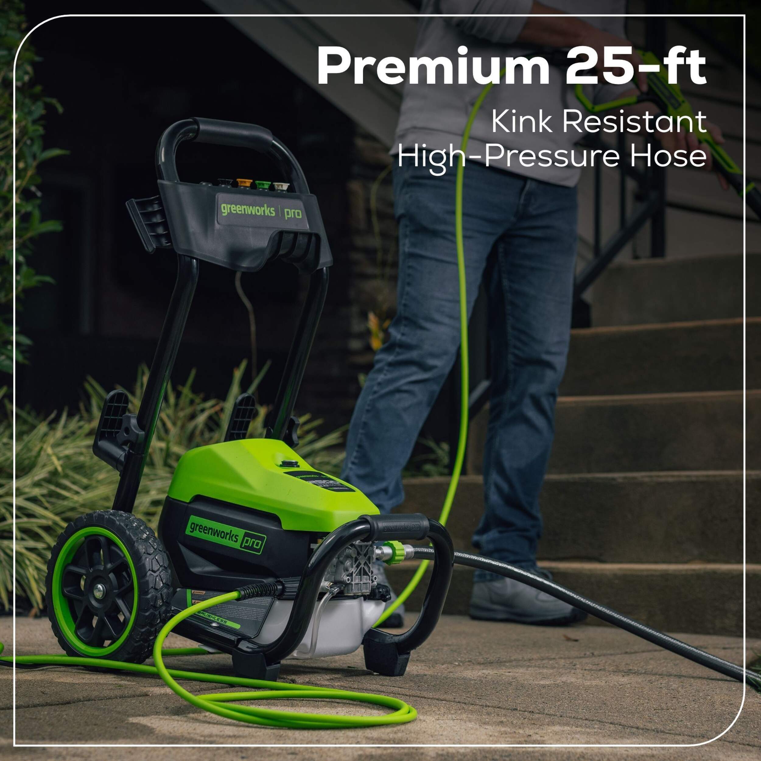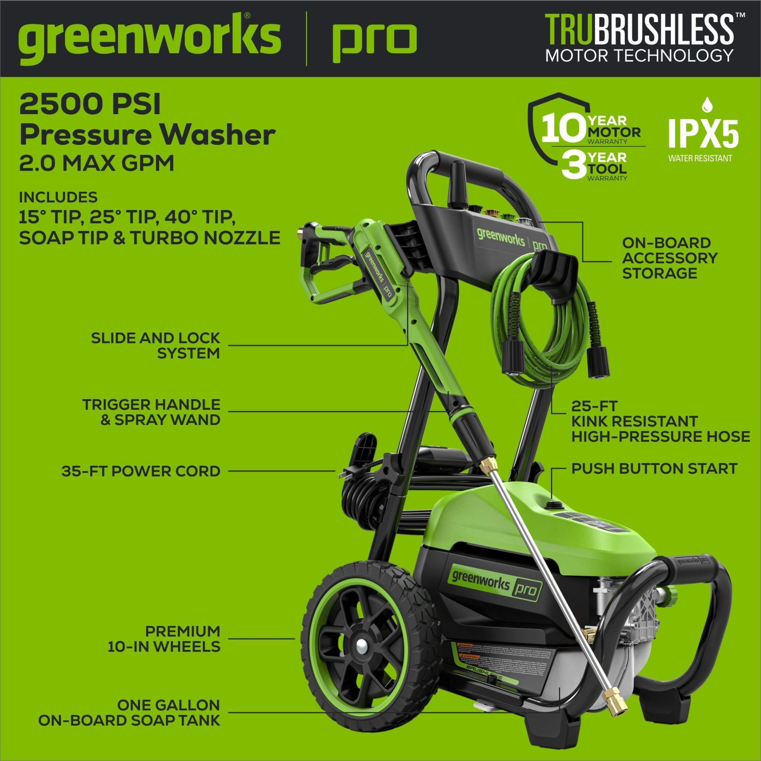 Includes: rugged metal gun and 25-ft kink-resistant hose, 5 Spray nozzles - Turbo, Soap, 15°, 25° and 40°