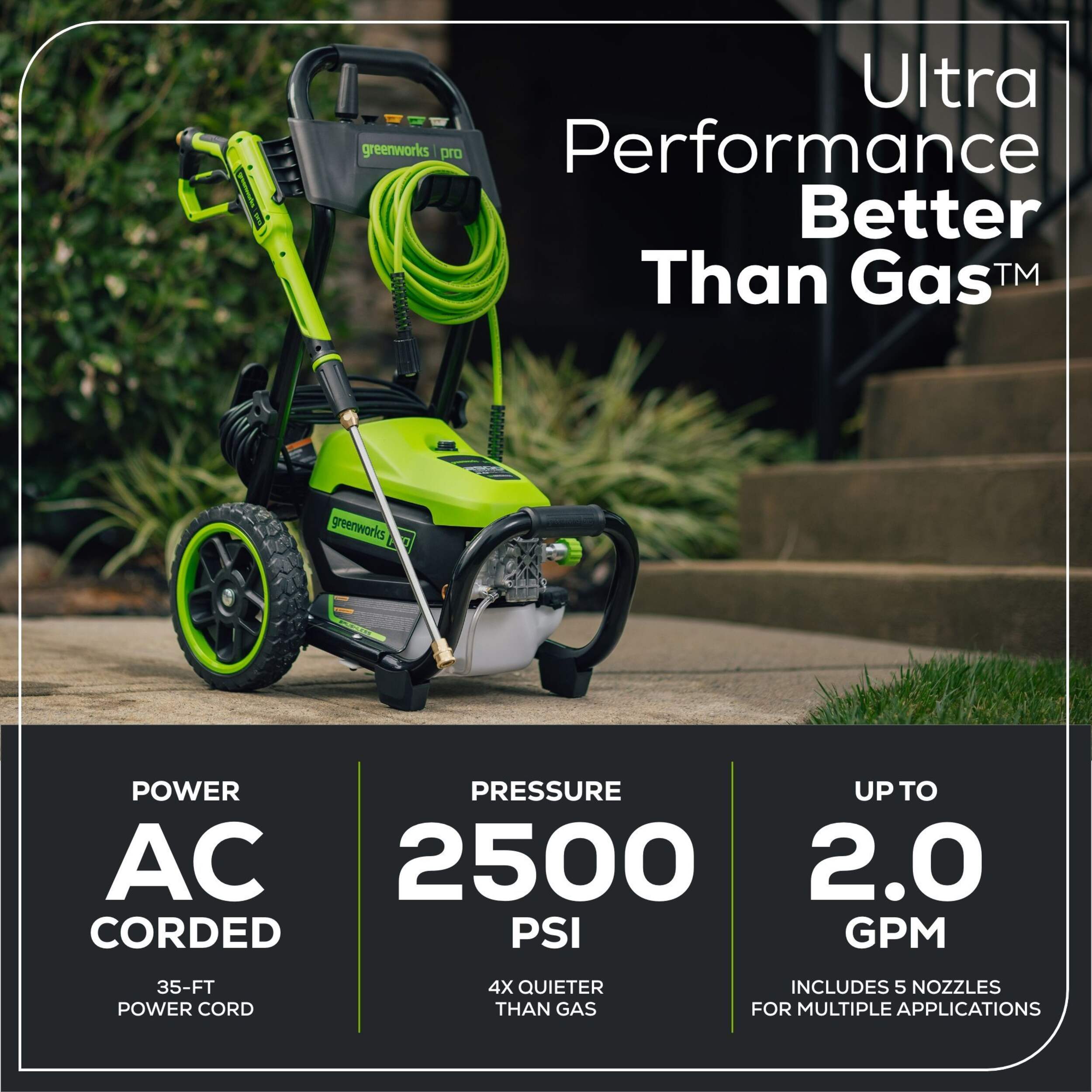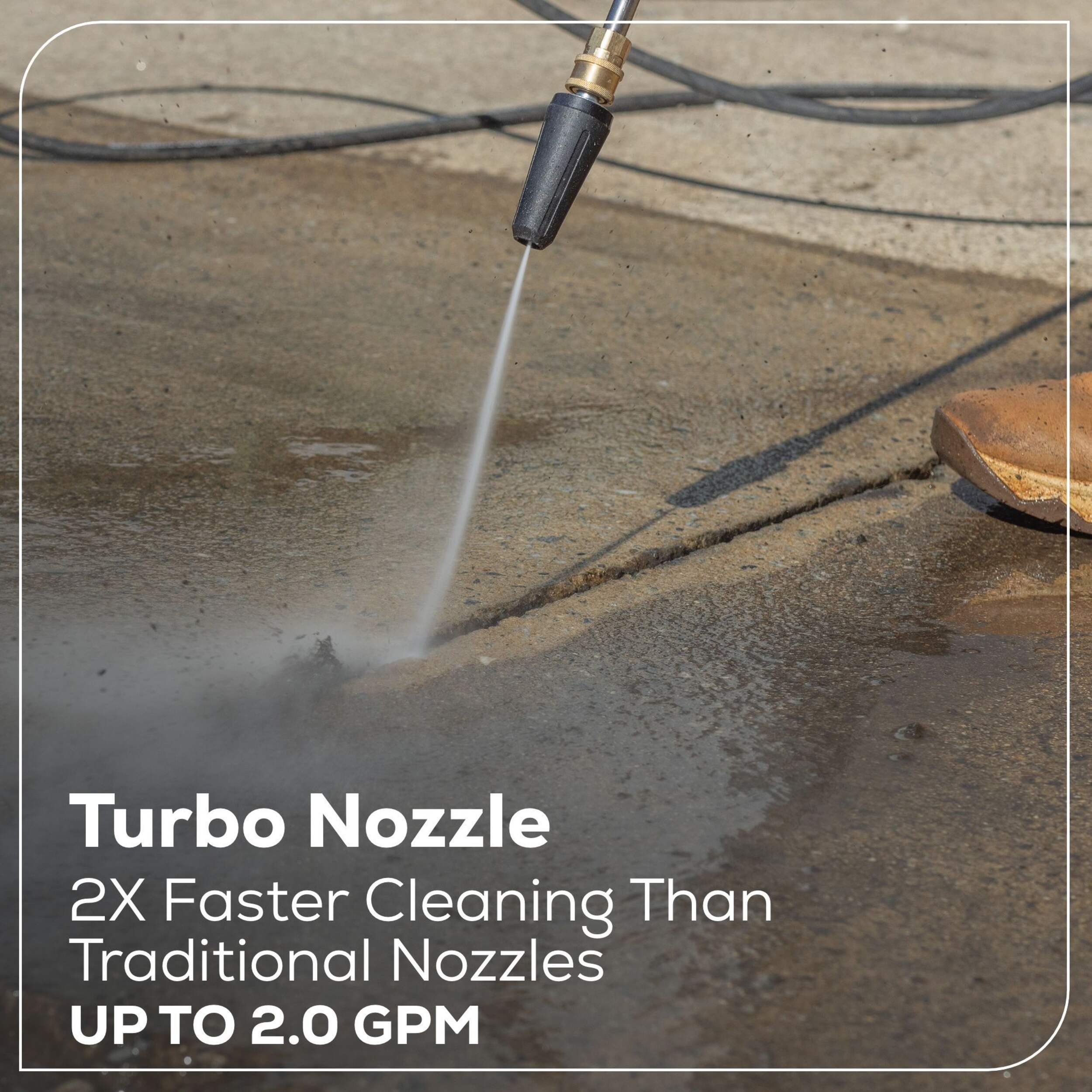 Powerful residential electric pressure washer with 2500 MAX PSI, 2.0 MAX GPM (GPM ranges from 1.2 GPM to 2.0 GPM with included nozzles)