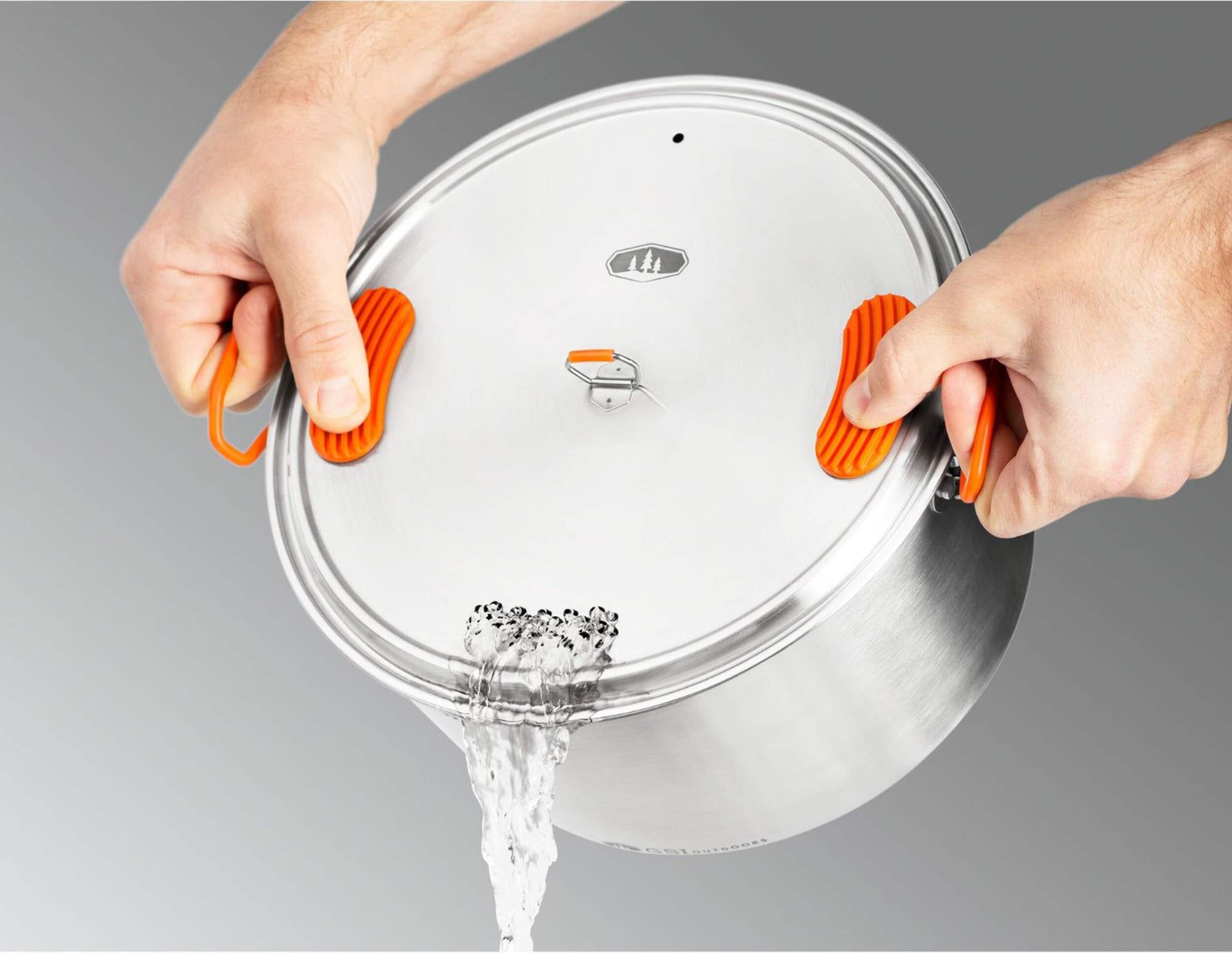 • Integrated straining holes in the lightweight, stainless steel lid make straining water simple while the silicone thumb pads insulate hands from the heat