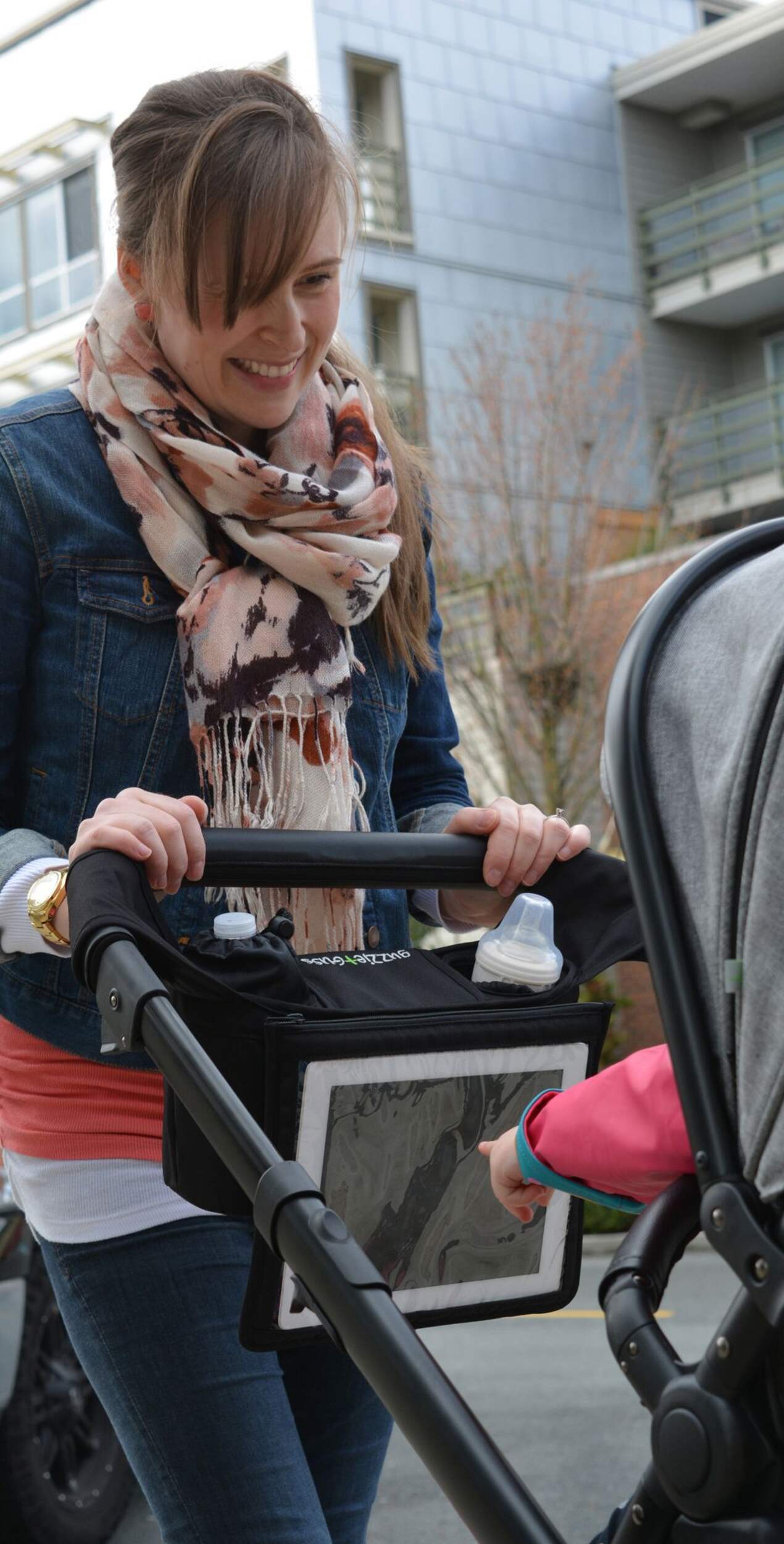 guzzie+Guss Media Console will attach to most stroller handles and will provide you with everything you need to be accessible at your finger tips