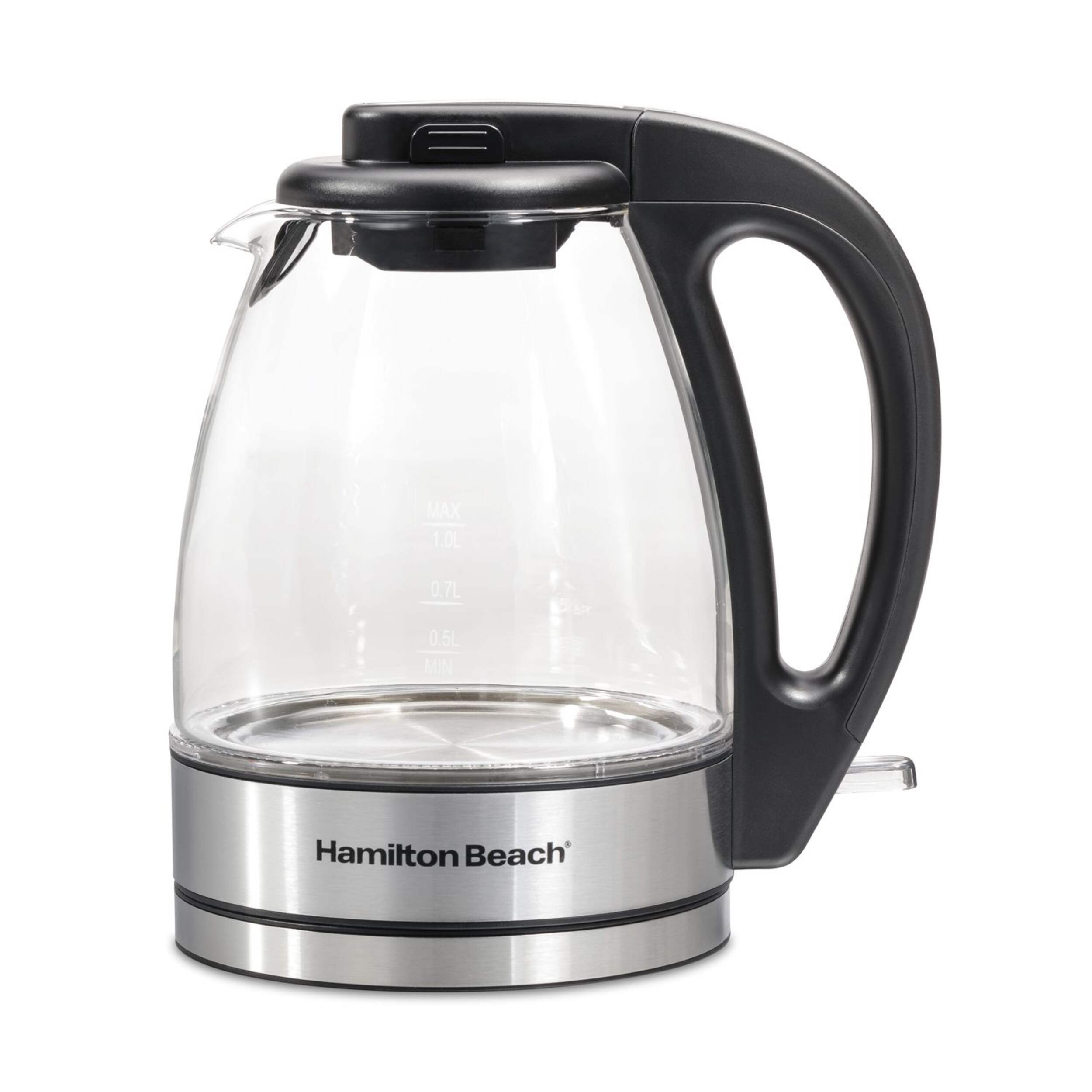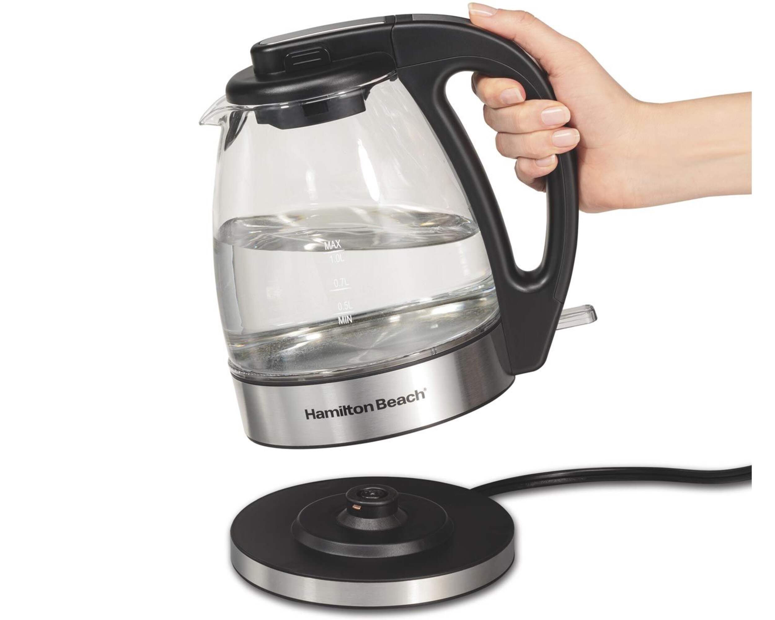 Hamilton Beach Glass Kettle features blue LED lights that illuminate the kettle when in use