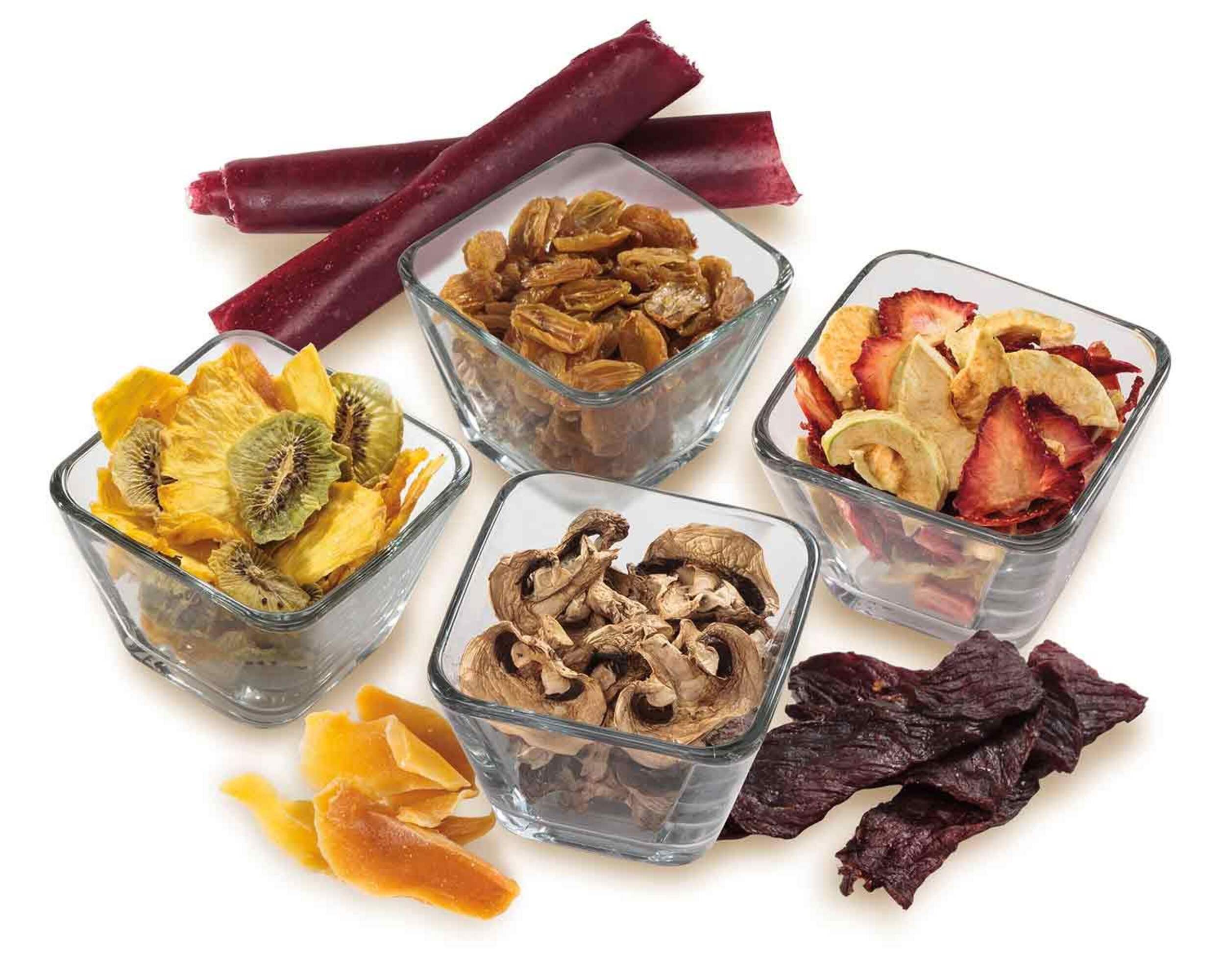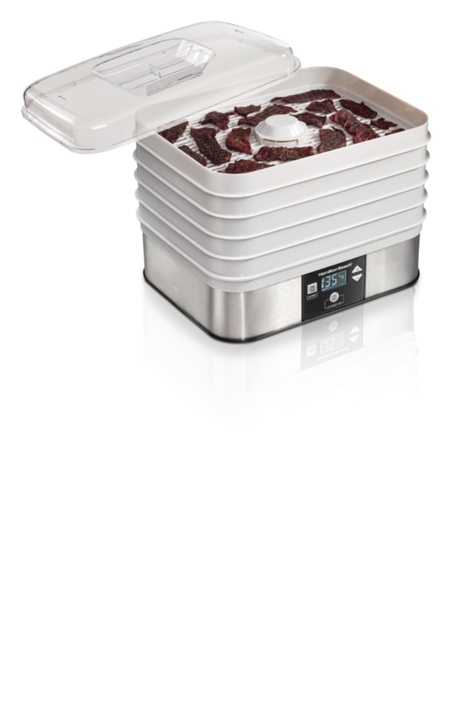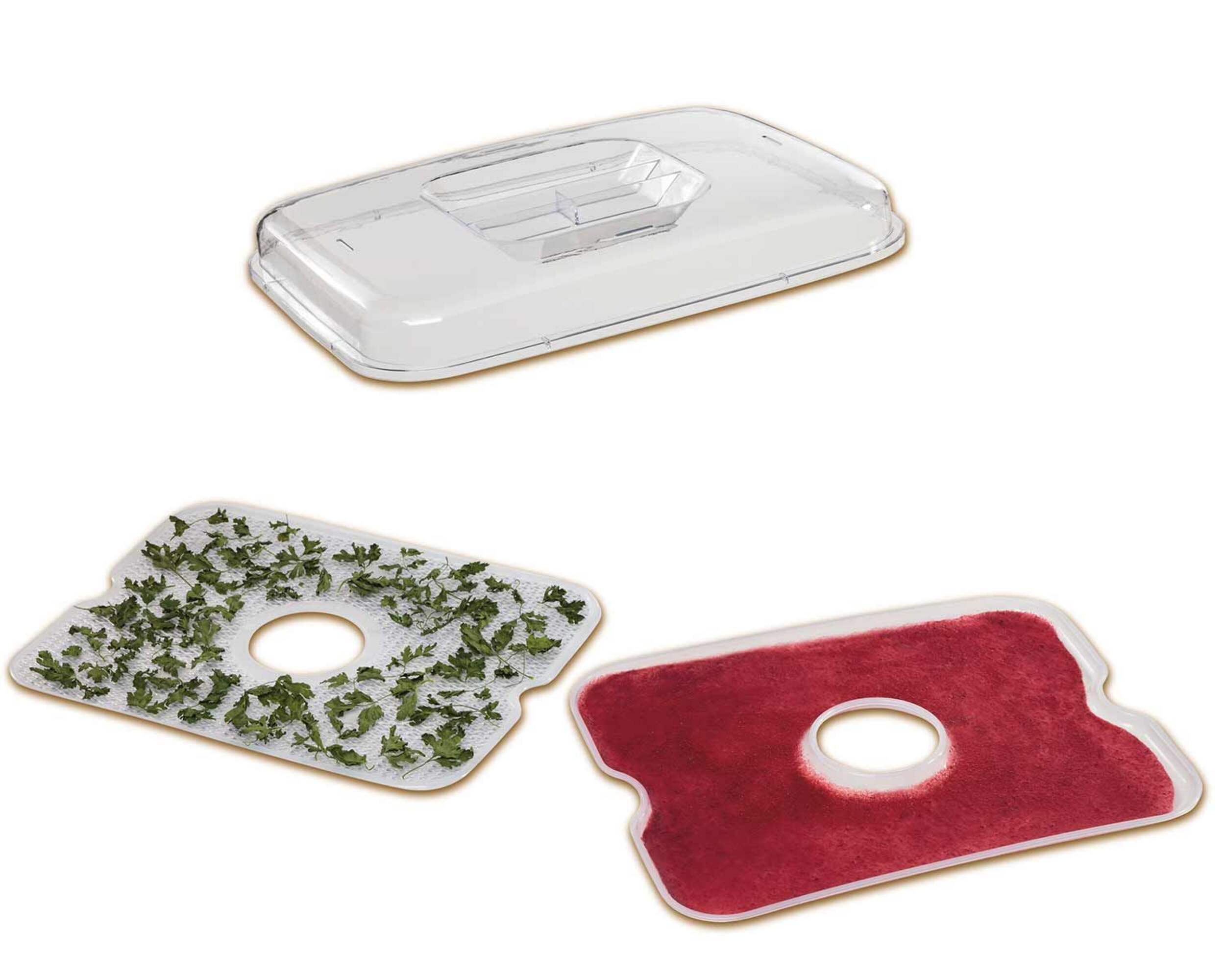 Includes (5) stackable drying trays, (1) fine-mesh sheet for small foods like herbs and (1) solid fruit roll sheet