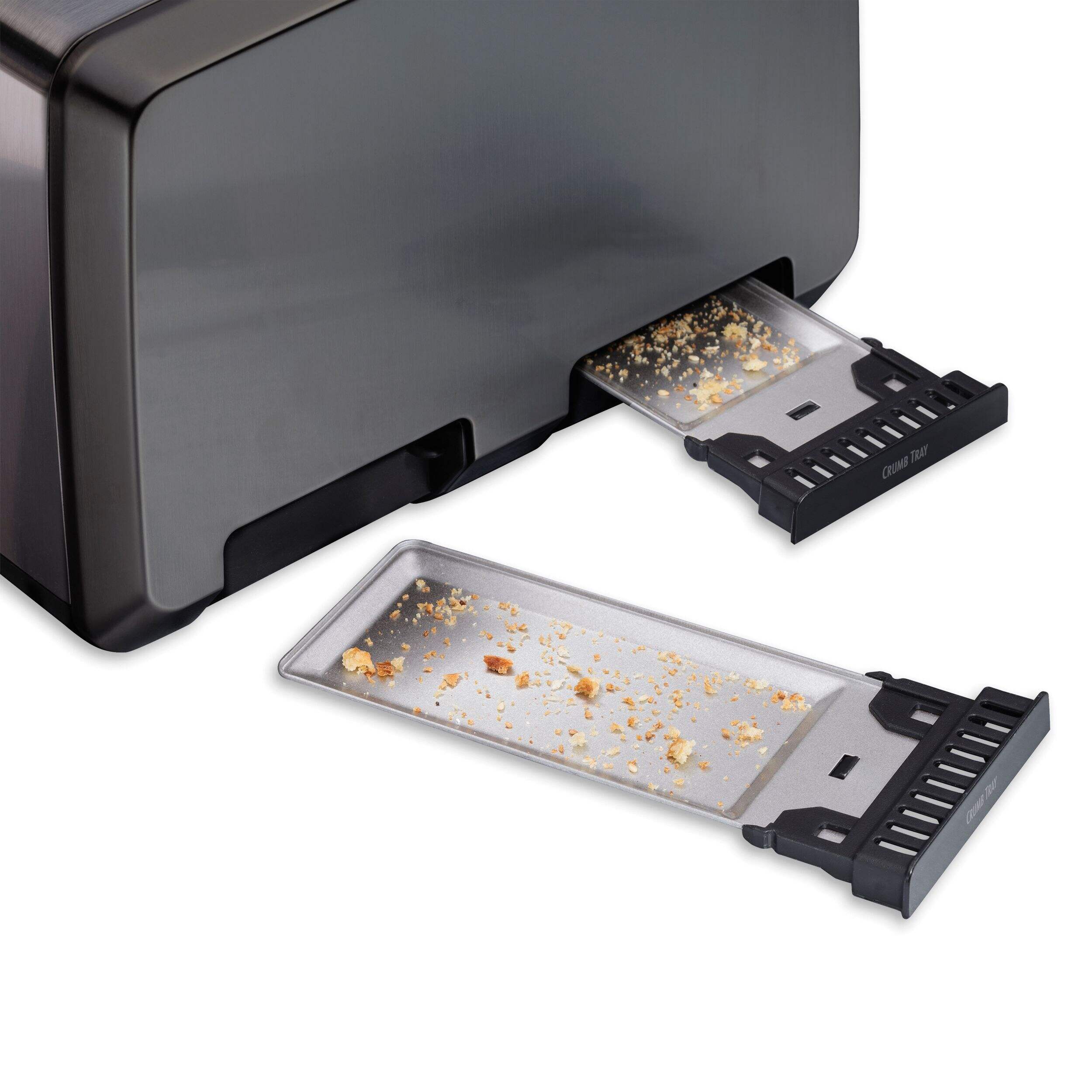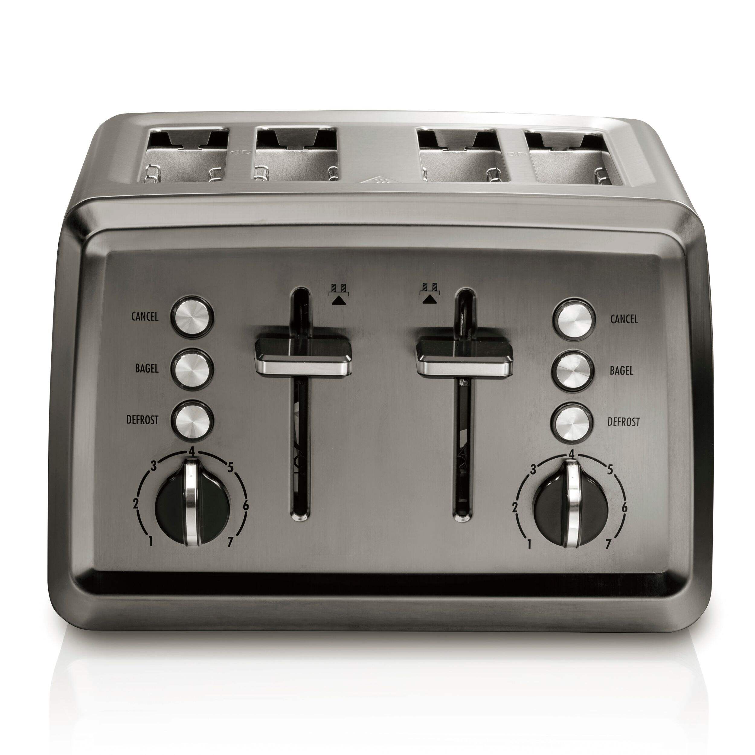 Make perfect toast your way with the Hamilton Beach Elite Extra Wide Slots Toaster. This 4-slice toaster features extra-wide slots to easily accommodate bagels, pastries, and artisan breads. The innovative Bagel Technology toasts just the cut side while warming the round side for ideal texture. With 7 shade settings, defrost, and cancel buttons, you're in complete control of your ideal toast. A slide-out crumb tray keeps your toaster's cleanup simple, and automatic shutoff provides safety and peace of mind. With a sleek black stainless steel exterior, this high-performing toaster will be your go-to every morning.