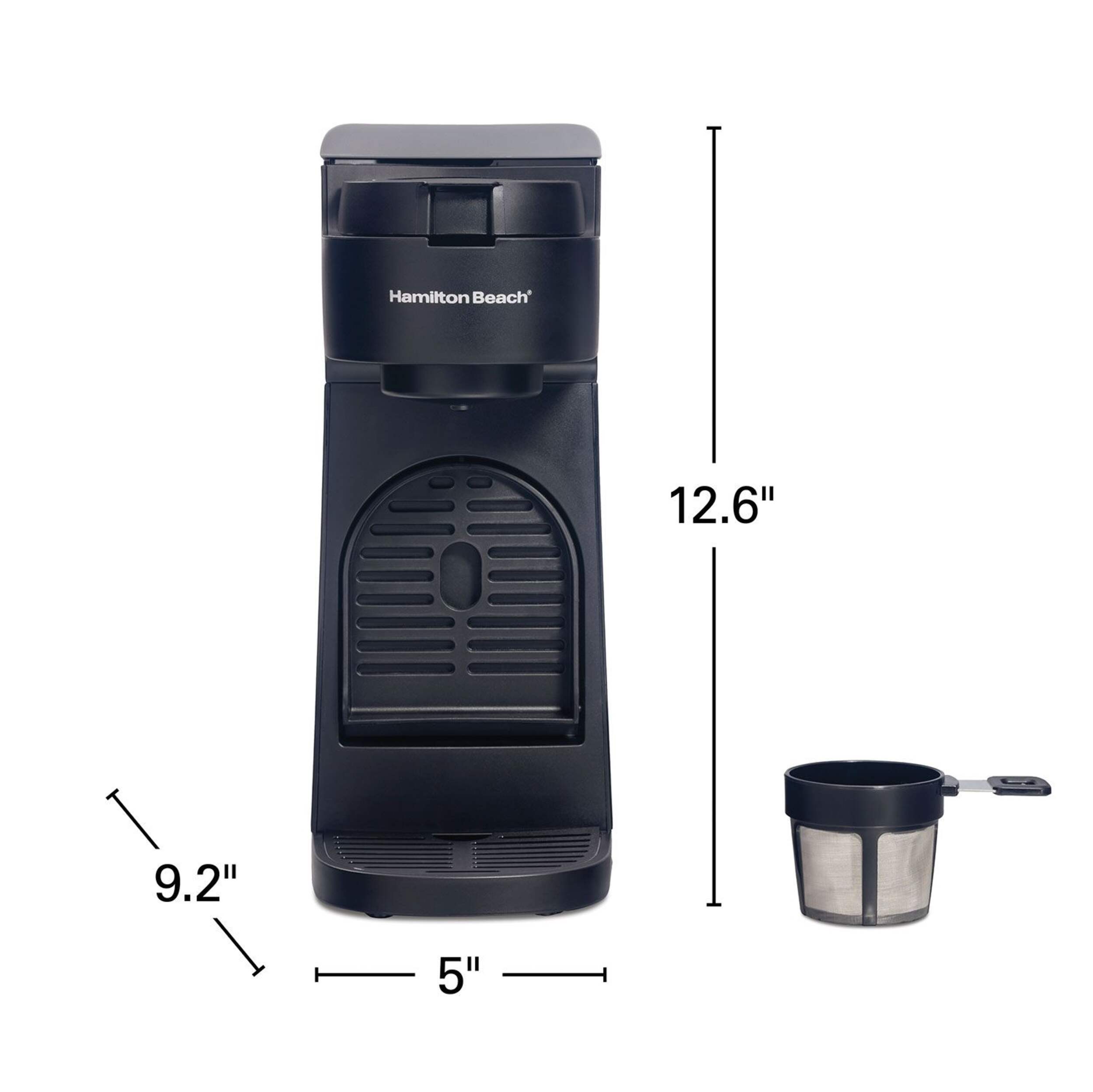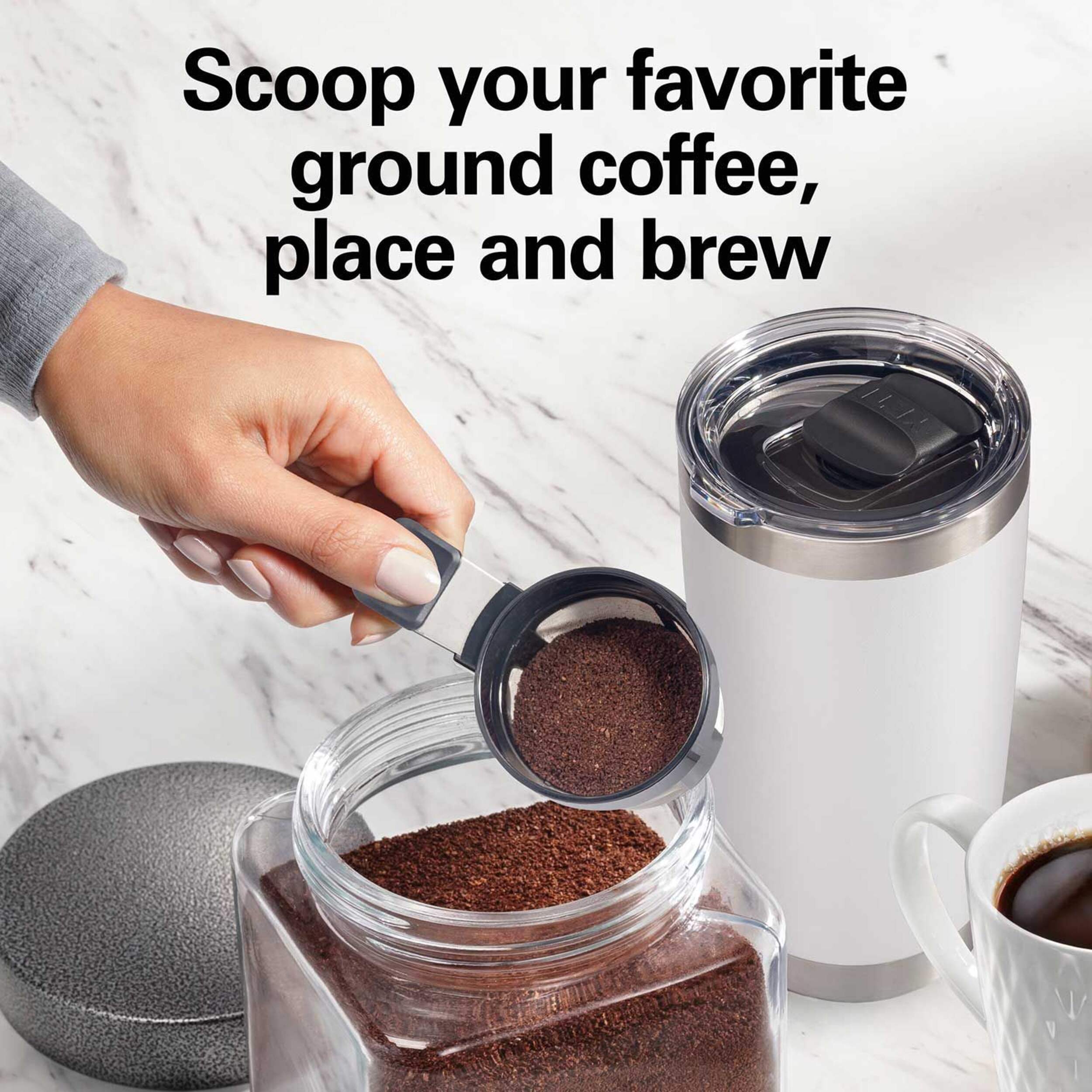 The Scoop Single-Serve Coffee Maker by Hamilton Beach makes fresh, flavourful coffee in an easy way. Simply scoop your preferred ground coffee directly into the filter basket, place your mug and brew. It doesn't require pods or filters, letting you brew an 8 oz. cup or 14 oz. travel mug. Perfect for the coffee lover who wants a fast and simple way to make delicious coffee without the hassle of filters or pods.