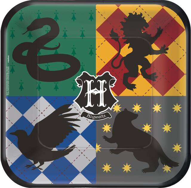 These Harry Potter Square Paper Lunch Plates feature logos of the four houses of Hogwarts: Gryffindor, Hufflepuff, Ravenclaw, and Slytherin