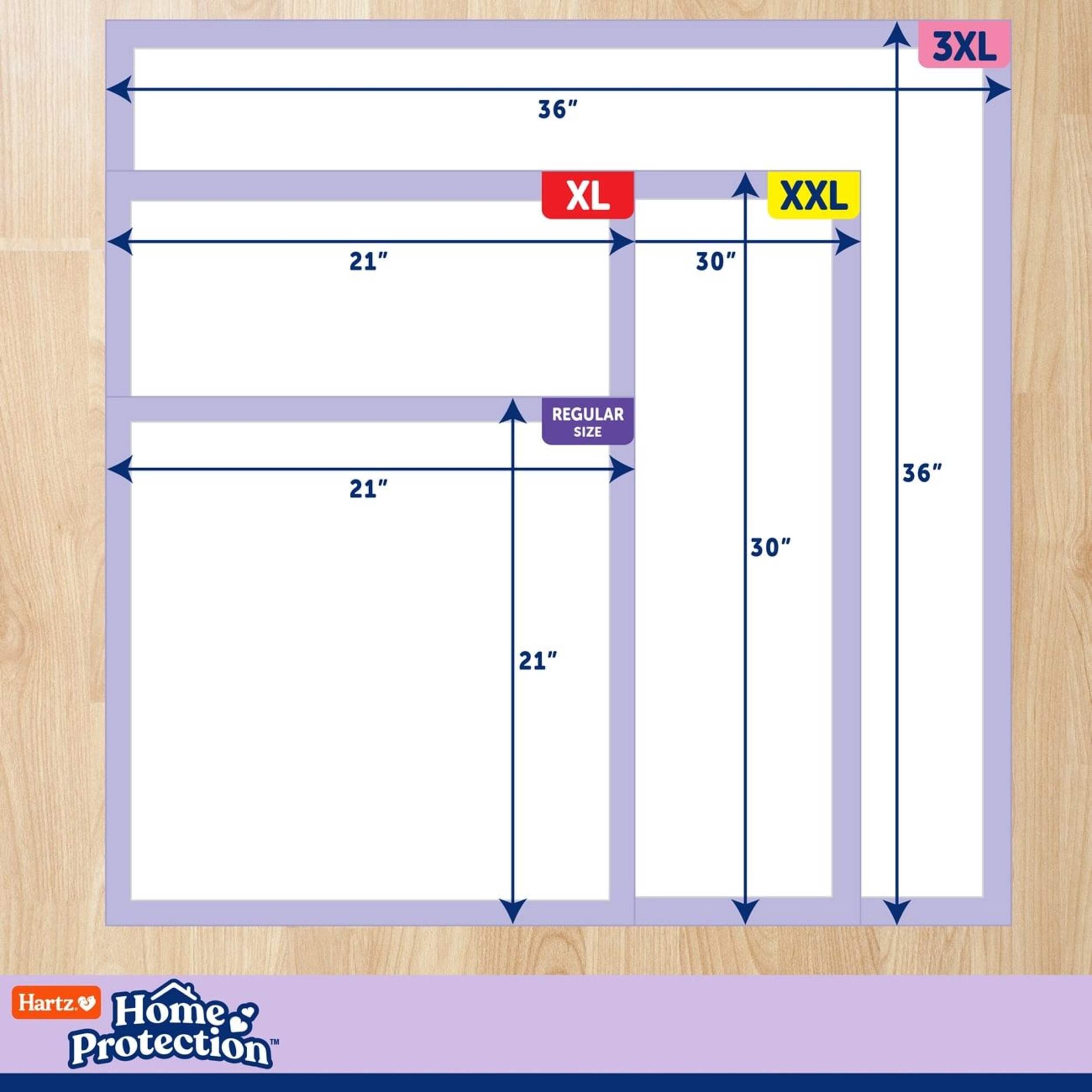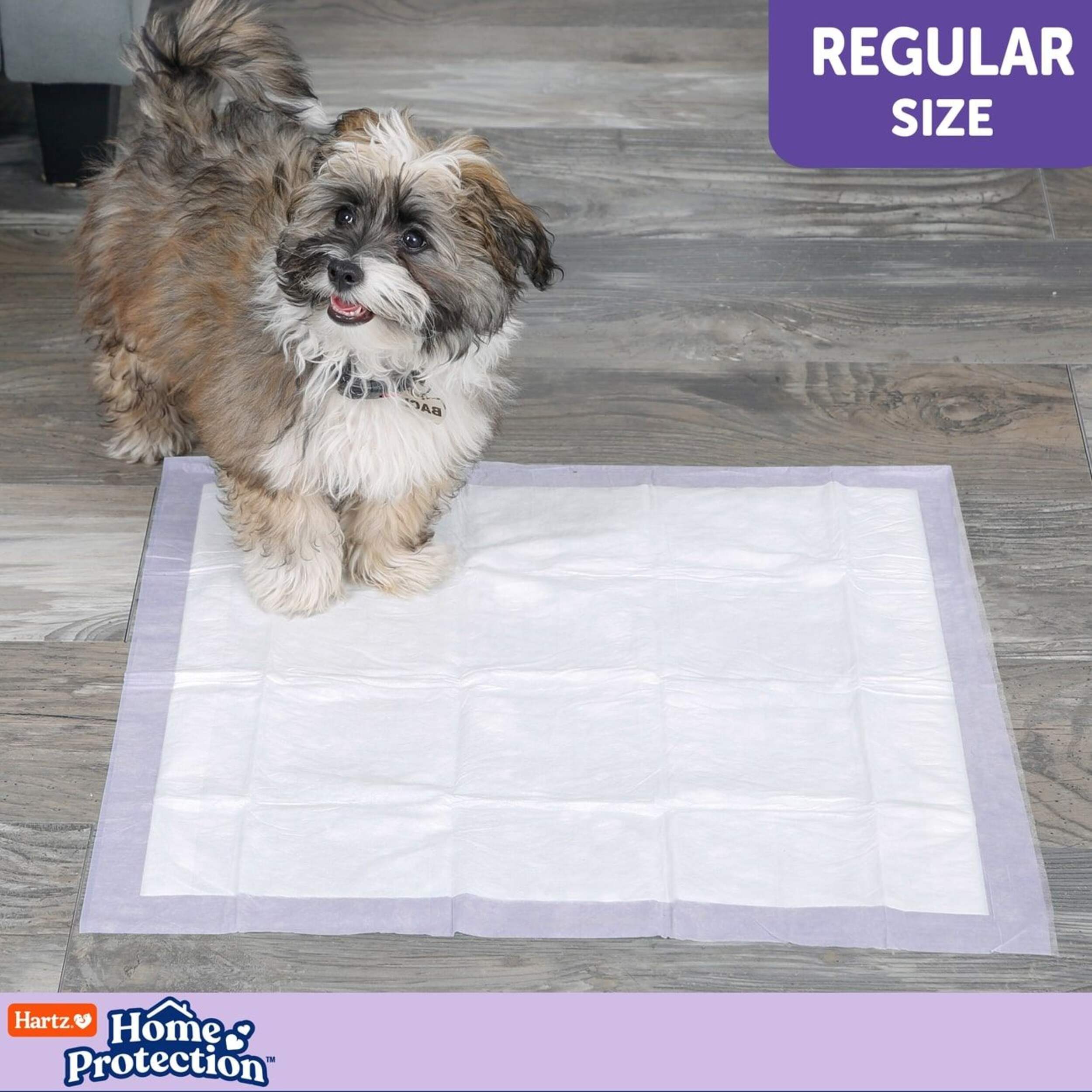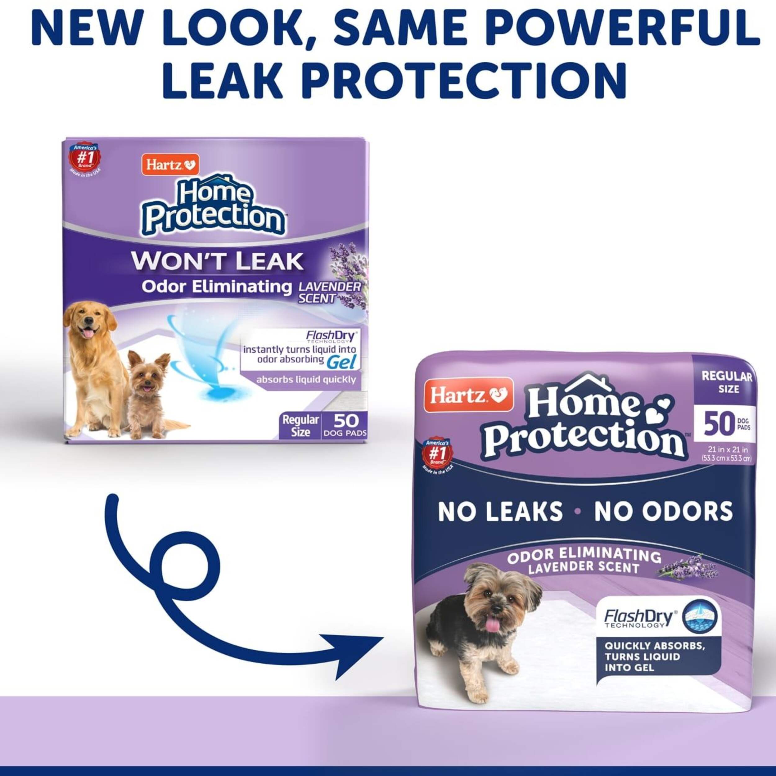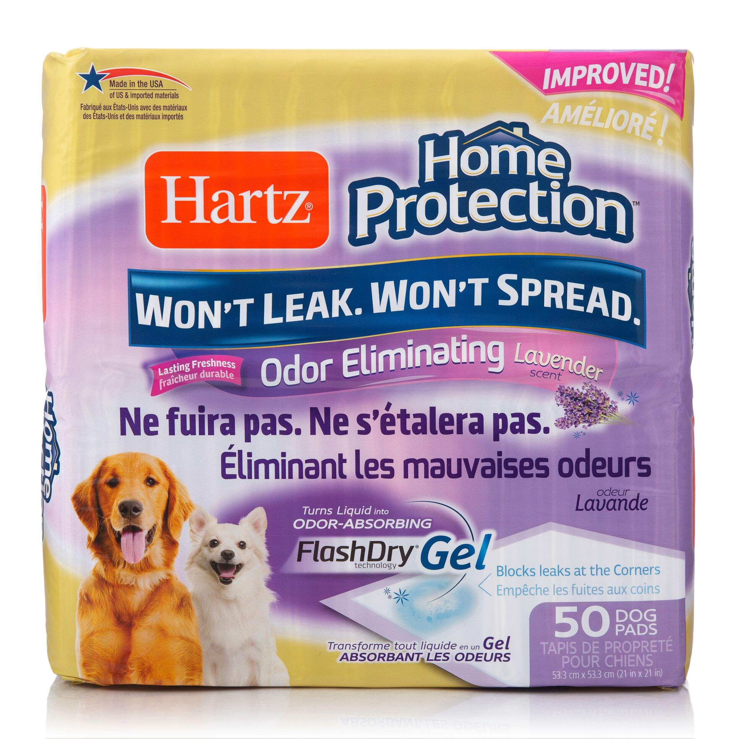 Coming home to pet messes is not how anyone likes to unwind after a long day, which is why we set out to create the ultimate dog pad. The Hartz Home Protection line of training pads make clean-up simpler, pad replacement and disposal easy, and safeguard flooring from unpleasant accidents. Excellent for dogs living in homes with limited access to the outdoors, senior pups with restricted movement, puppies in training or sick dogs, Home Protection has you covered at every corner. Our absorption experts analyzed urine distribution and designed a pad with 6 layers, containing our Flash-Dry® technology which creates a smaller urine spot and allows for multiple uses per pad. When nature calls, Home Protection instantly turns urine into gel to reduce tracking and make clean up a breeze. A water-proof plastic backing and borders ensure our pads won’t leak or spread. The special odor eliminating capability within all our lavender scented pads traps and neutralizes stinky smells left behind, turning eww to phew.