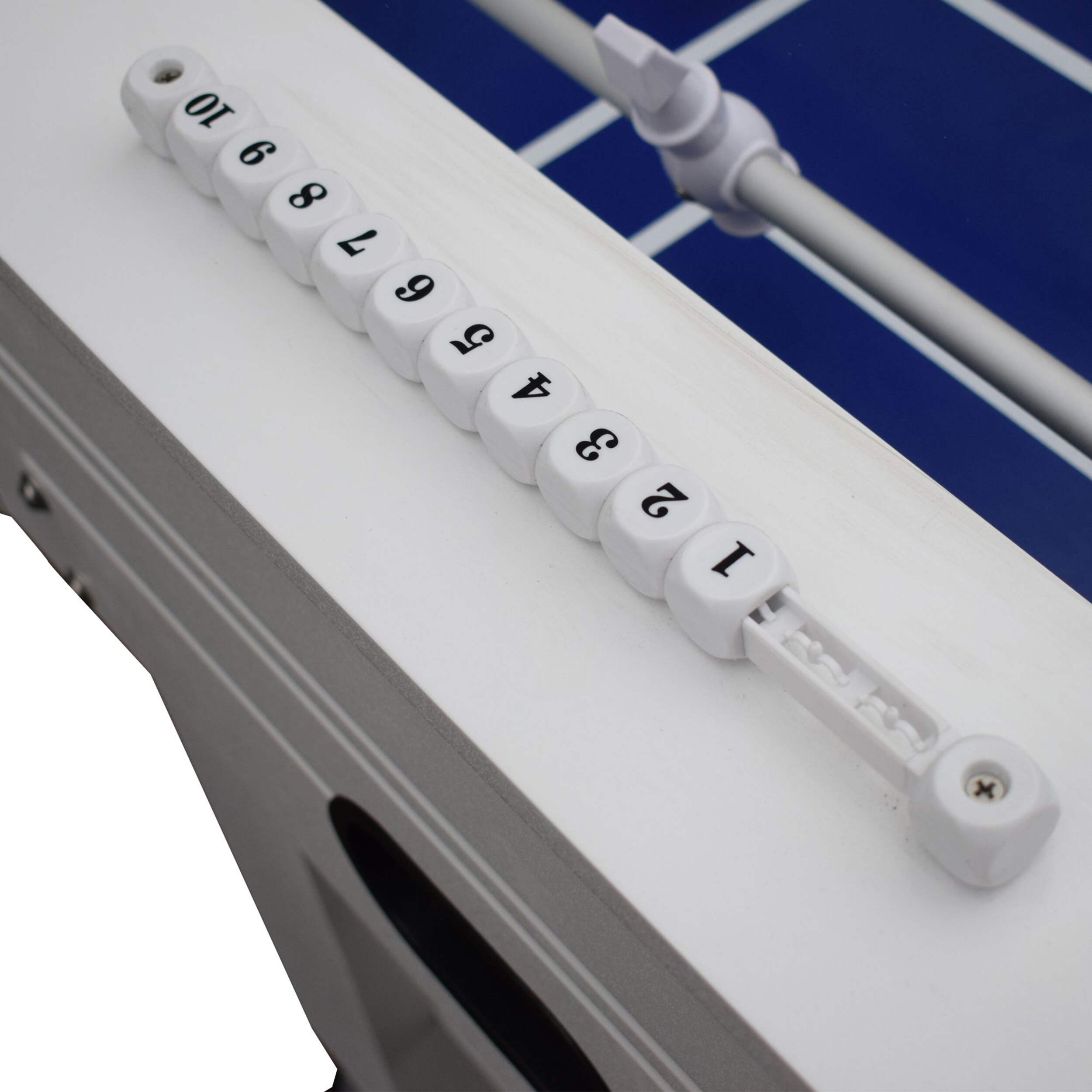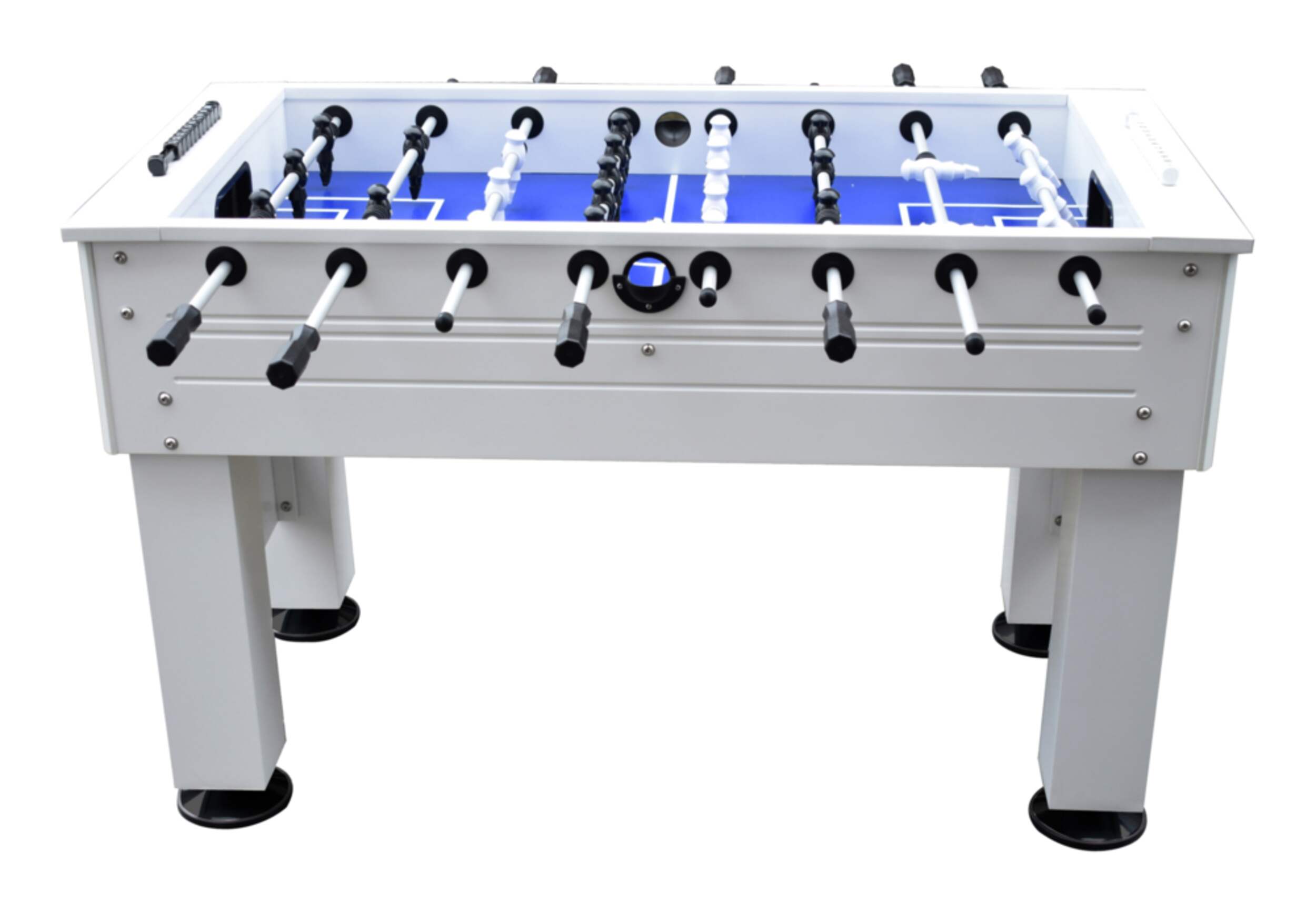 A perfect addition to your patio, pool or yard, this stylish foosball table is loaded with high-quality features. Every component is designed to withstand the elements, including a waterproof frame and rust-proof aluminum rods. Ergonomic handles ensure hours of play without straining your hands. Bring the tournament into your backyard with the Highlander's sturdy, cross-supported surface. This brilliant blue play area blends beautifully with a glossy white cabinet, creating a dazzling look that delights the eyes and elevates the action. The Highlander also comes equipped with integrated leg levelers and a cross-supported surface, ensuring an even playing field. Includes 2- 36mm ABS high quality foosballs and a weather-resistant, nylon cover. 1-year limited warranty.