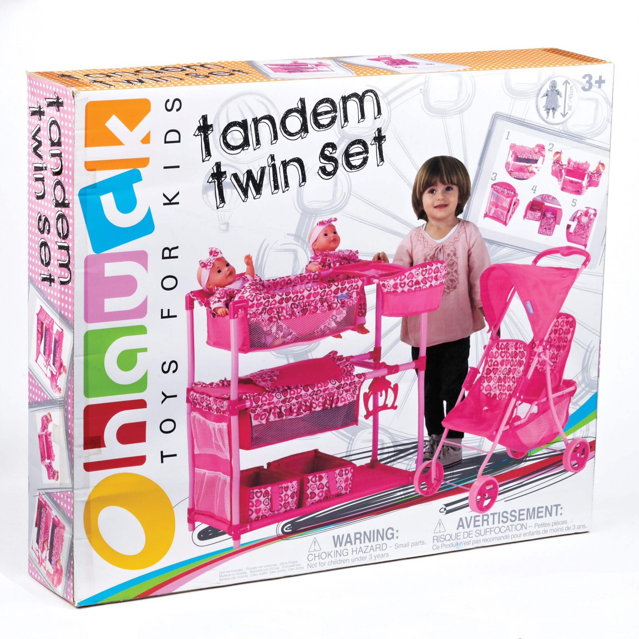 Includes twin bunk beds, high chairs, tandem twin stroller, food trays and hangers