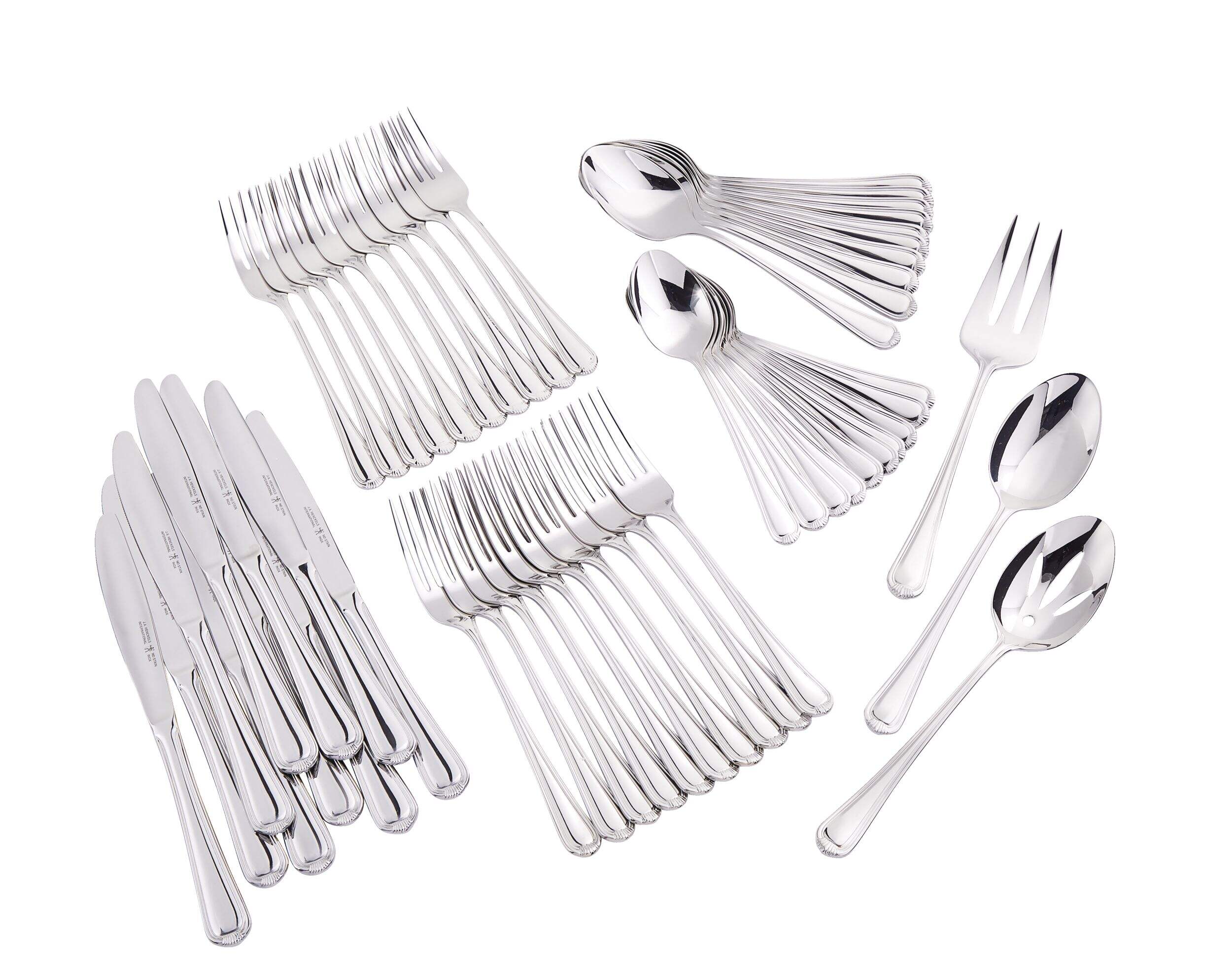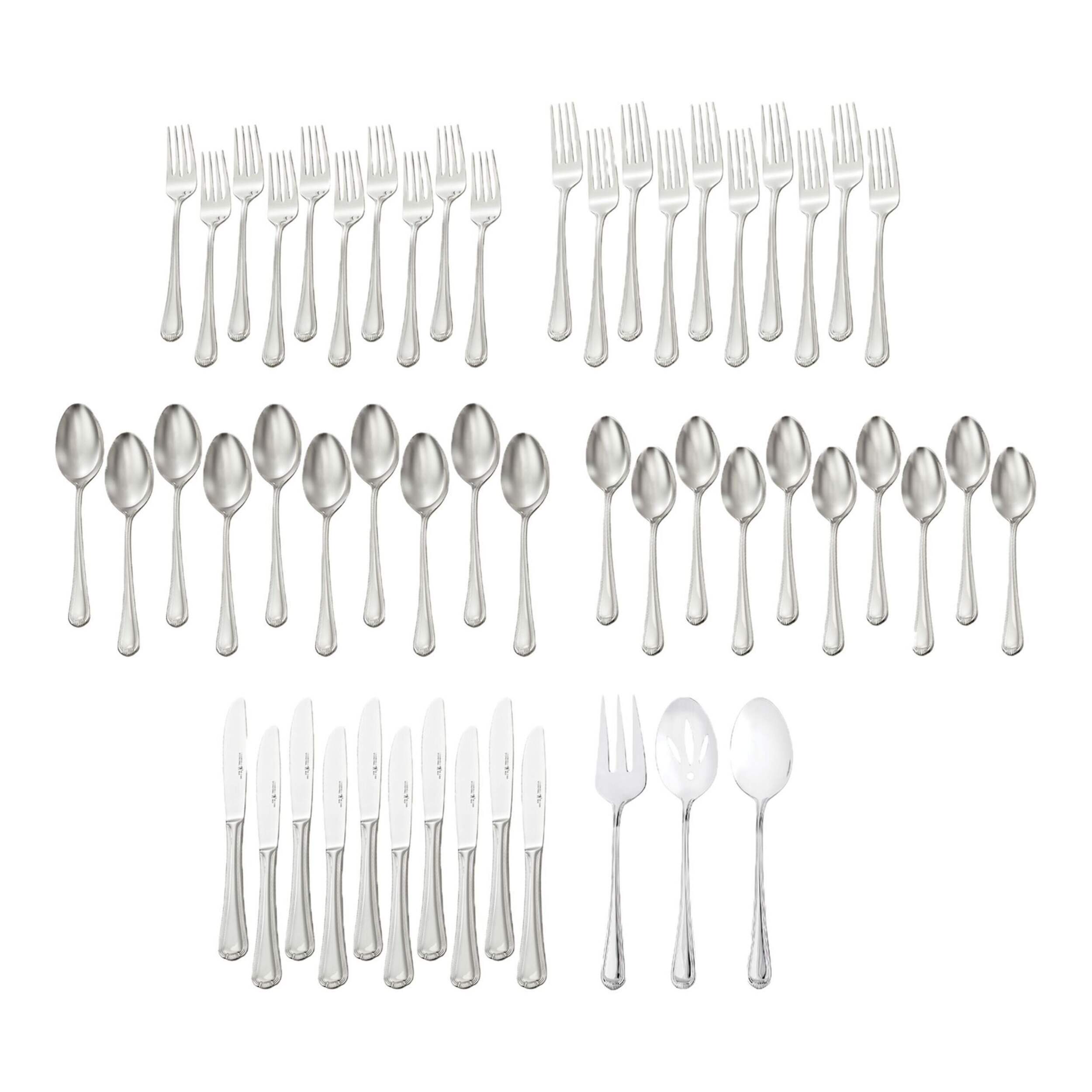 Set includes: 10 dinner forks, 10 dinner knives, 10 salad forks, 10 soup spoons, 10 teaspoons, serving fork, serving spoon and slotted serving spoon