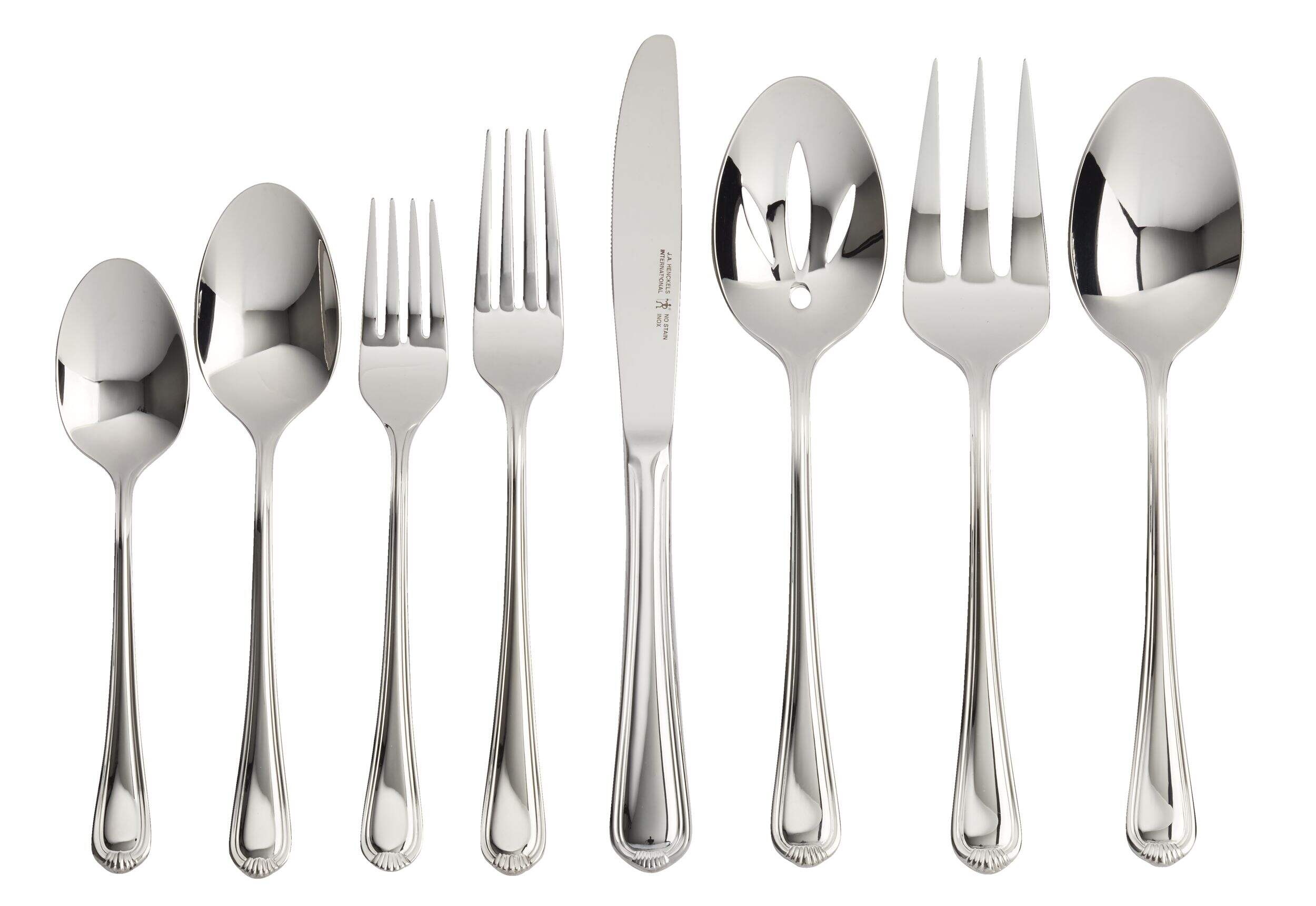 Keep your table set for your next dinner party with this Henckels Alcea Flatware Cutlery Set. Featuring a simple yet elegant Alcea pattern, this flatware set offers a subtle look that pairs beautifully with a range of tableware, place settings and decor, without taking attention away from the food or conversation. Featuring a durable stainless steel construction, this flatware set includes cutlery for 10 place settings and three serving pieces, so you have everything you need for both casual brunches or formal dinners.