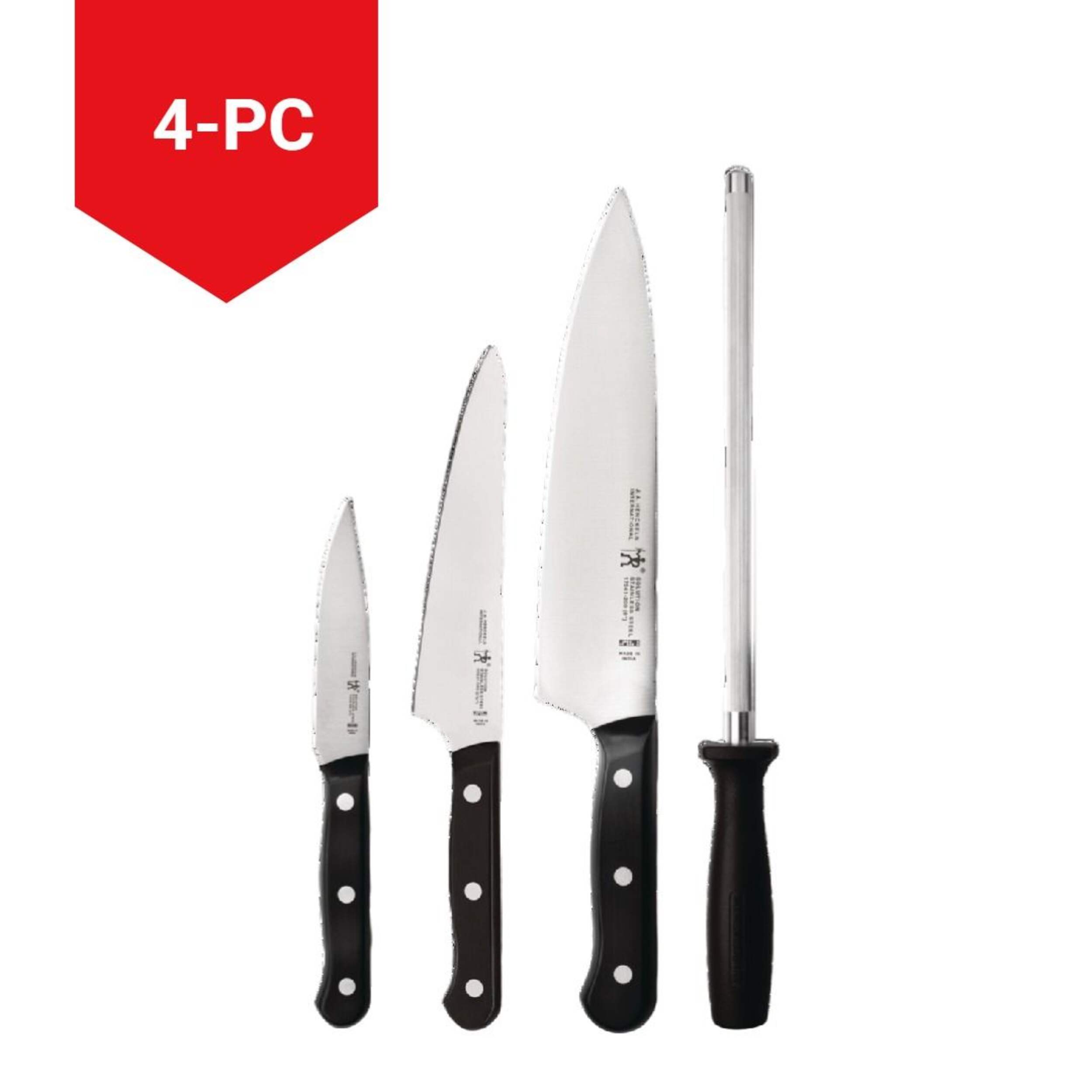 Includes: 4" (10.2 cm) paring knife, 5" (12.7 cm) prep knife, 8" (20.3 cm) chef's knife and 9" (23 cm) sharpening steel