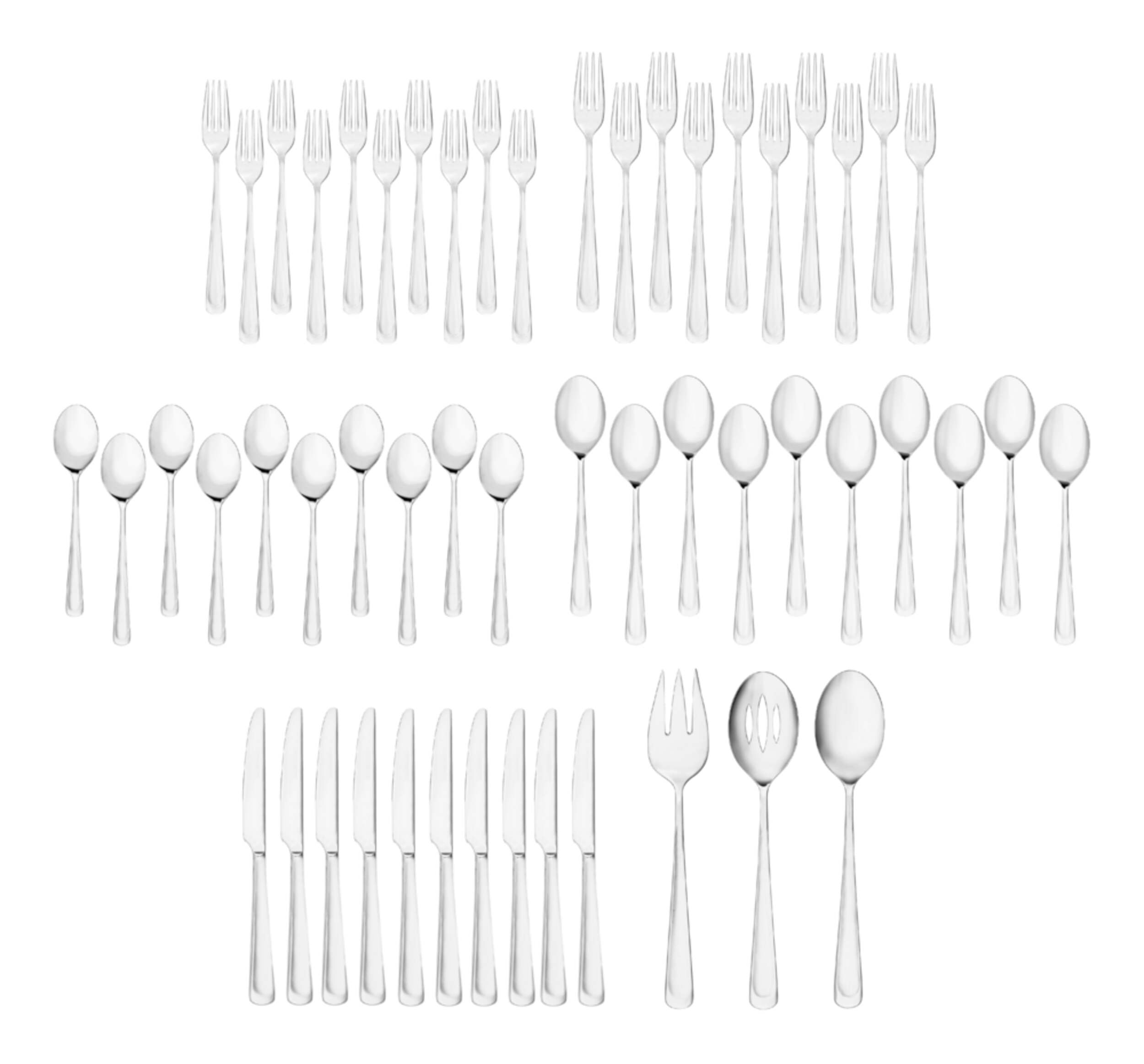 Includes 53 pieces - 10 place settings and 3 serving pieces: 10 dinner forks, 10 dinner knives, 10 salad forks, 10 soup spoons, 10 teaspoons, serving fork, serving spoon and slotted serving spoon