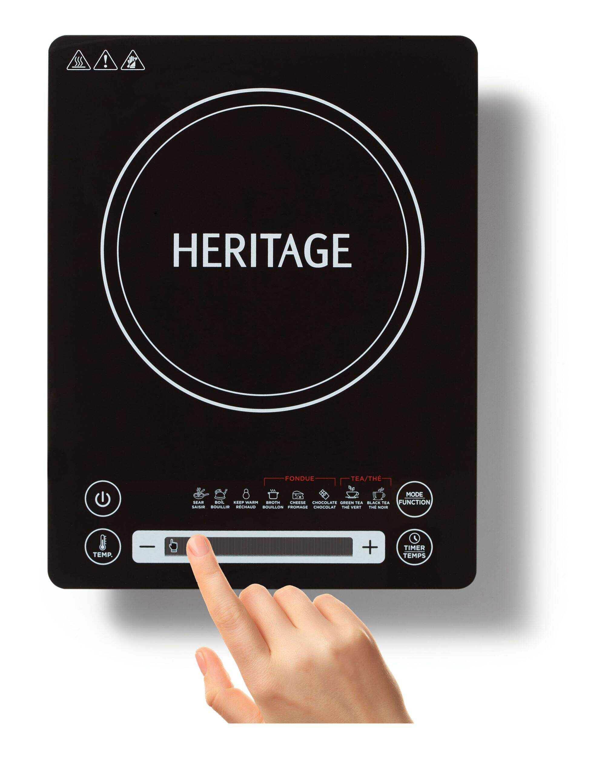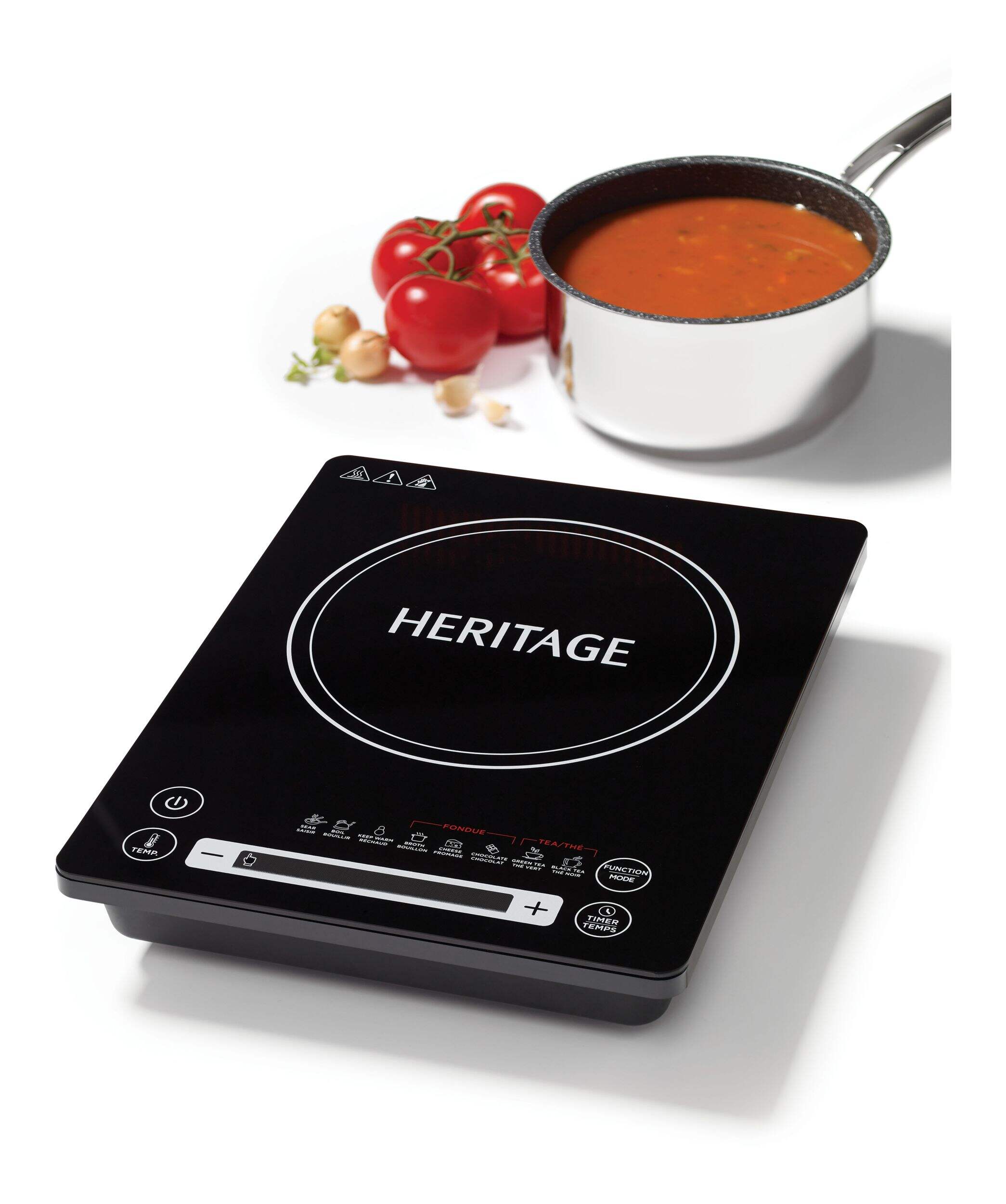 The Heritage portable induction cooktop is the ideal partner for entertaining guests or everyday use. It can easily be carried around for a portable high-powered heating solution. The appliance offers preprogrammed functions for tea and fondue as well as manual temperature controls. The audible error signal and automatic shut-off for pot detection provides peace of mind and safety.