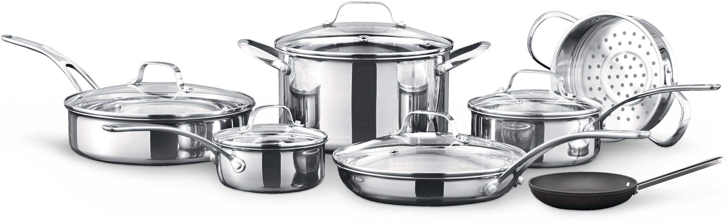 Cook like a pro with the Heritage Elite Clad stainless steel cookware set. This durable set features a try-ply base construction for outstanding heat conductivity and tempered glass lids with steam release vents for hassle-free cooking. It also includes a 6-in The Rock Diamond frypan with the advanced Rock.Tec surface enhancement for superior scratch resistance and outstanding release performance.
