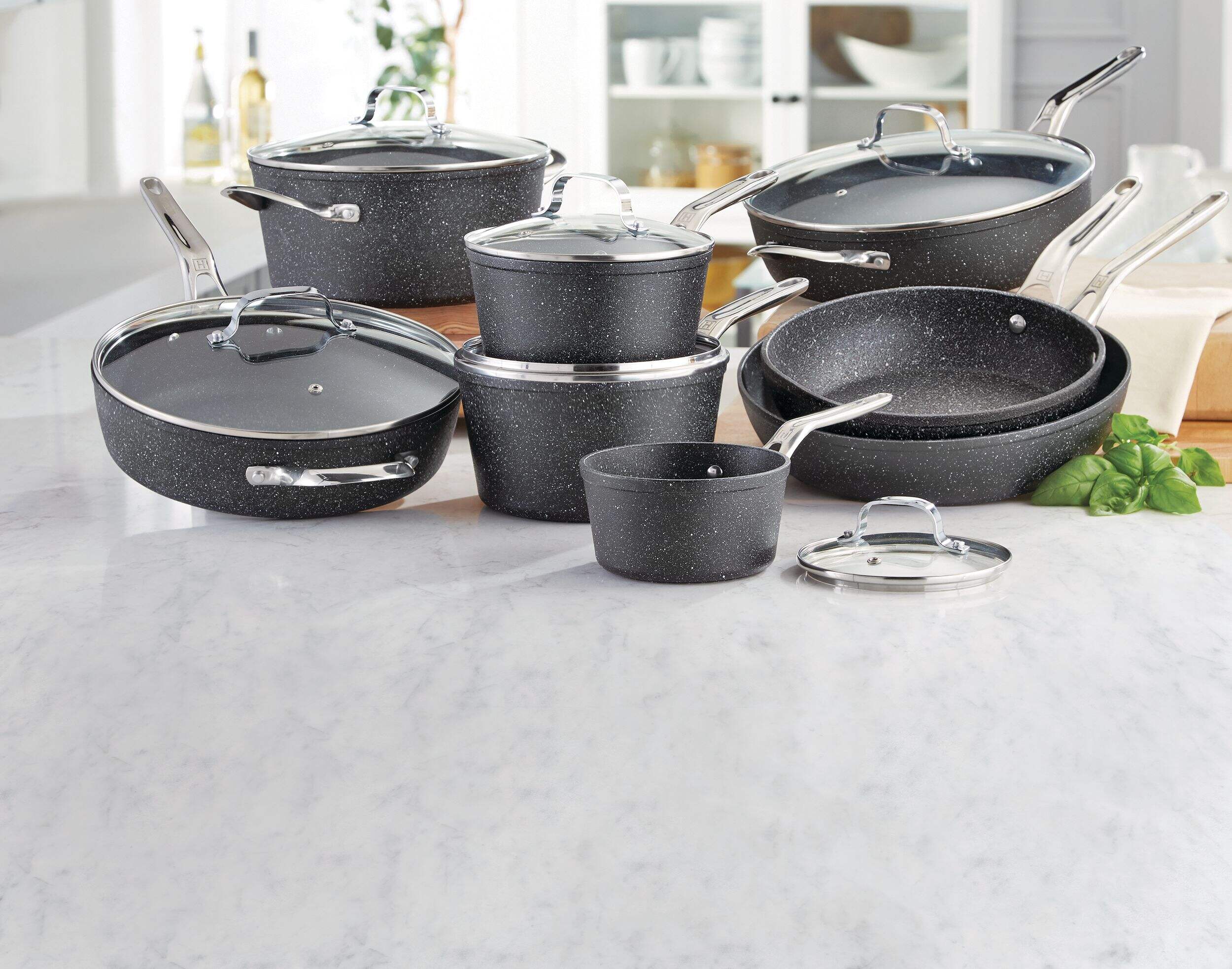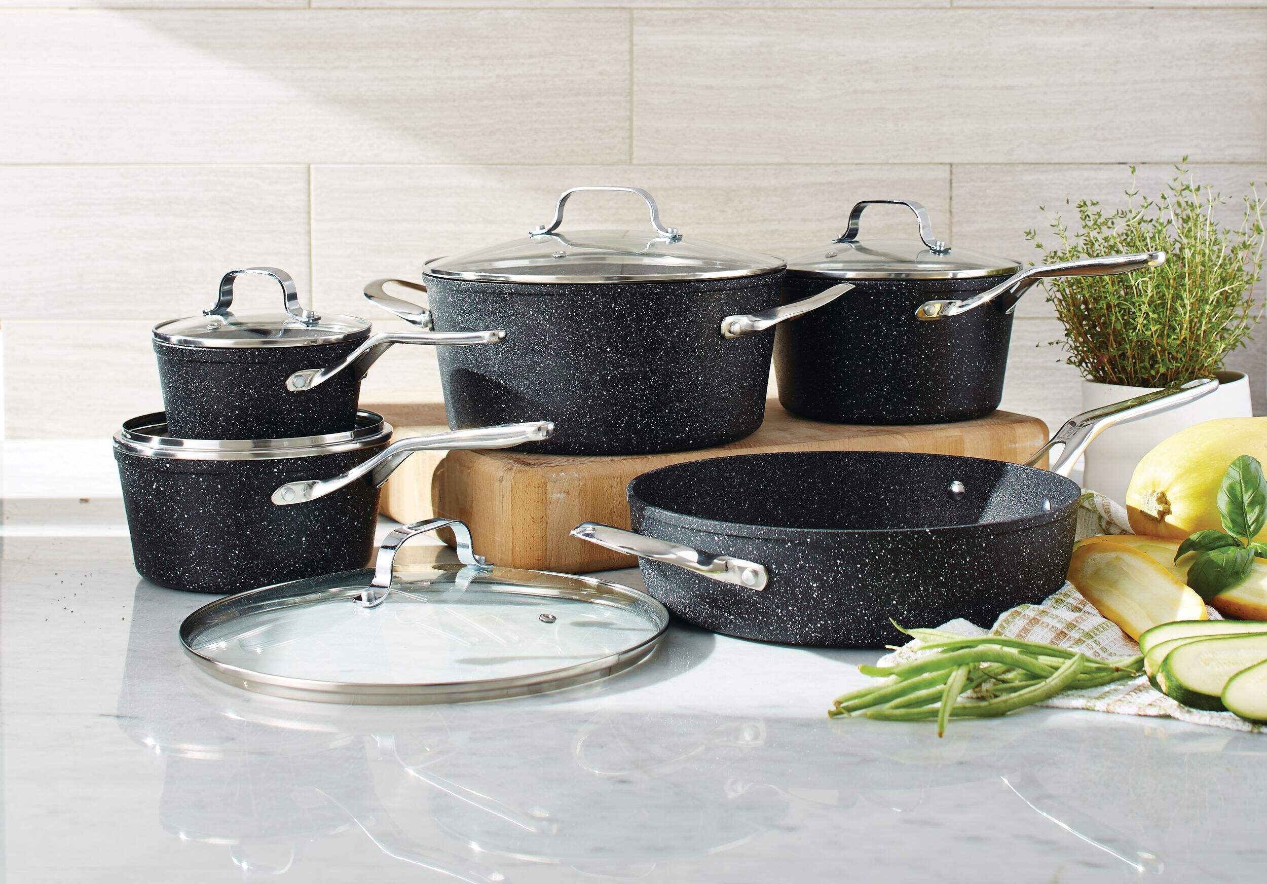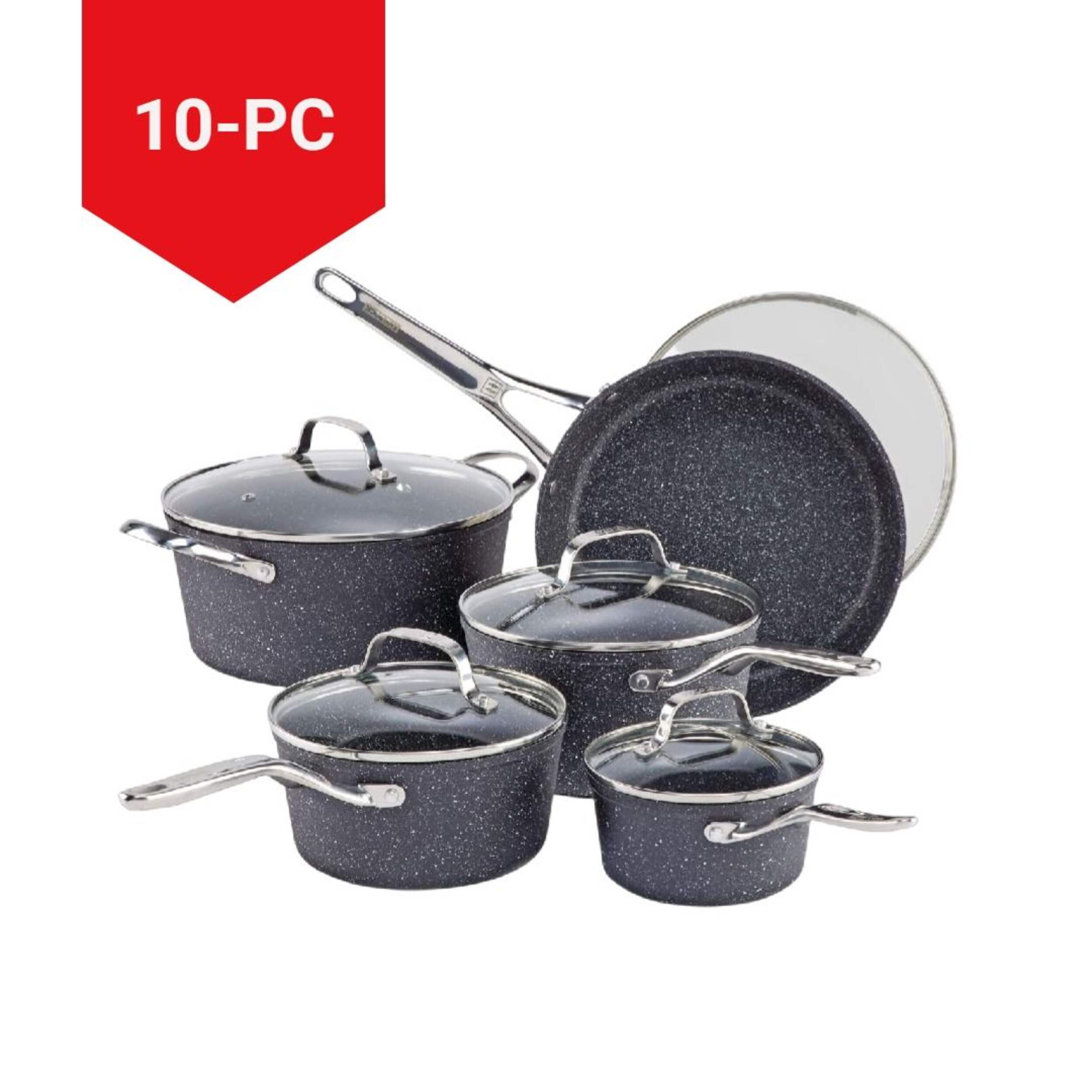The Heritage The Rock Forged Non-Stick Cookware Set is a comprehensive cookware set featuring durable, thick forged aluminum bases and the unique Rock Tec surface. These non-stick pans are three times more non-stick than traditional non-stick cookware, as well as more scratch and wear resistant. This non-stick cookware boasts great heat distribution for evenly cooked dishes and cleans up in a breeze once used.