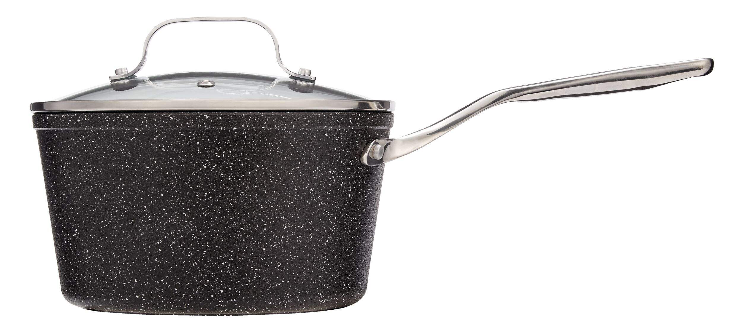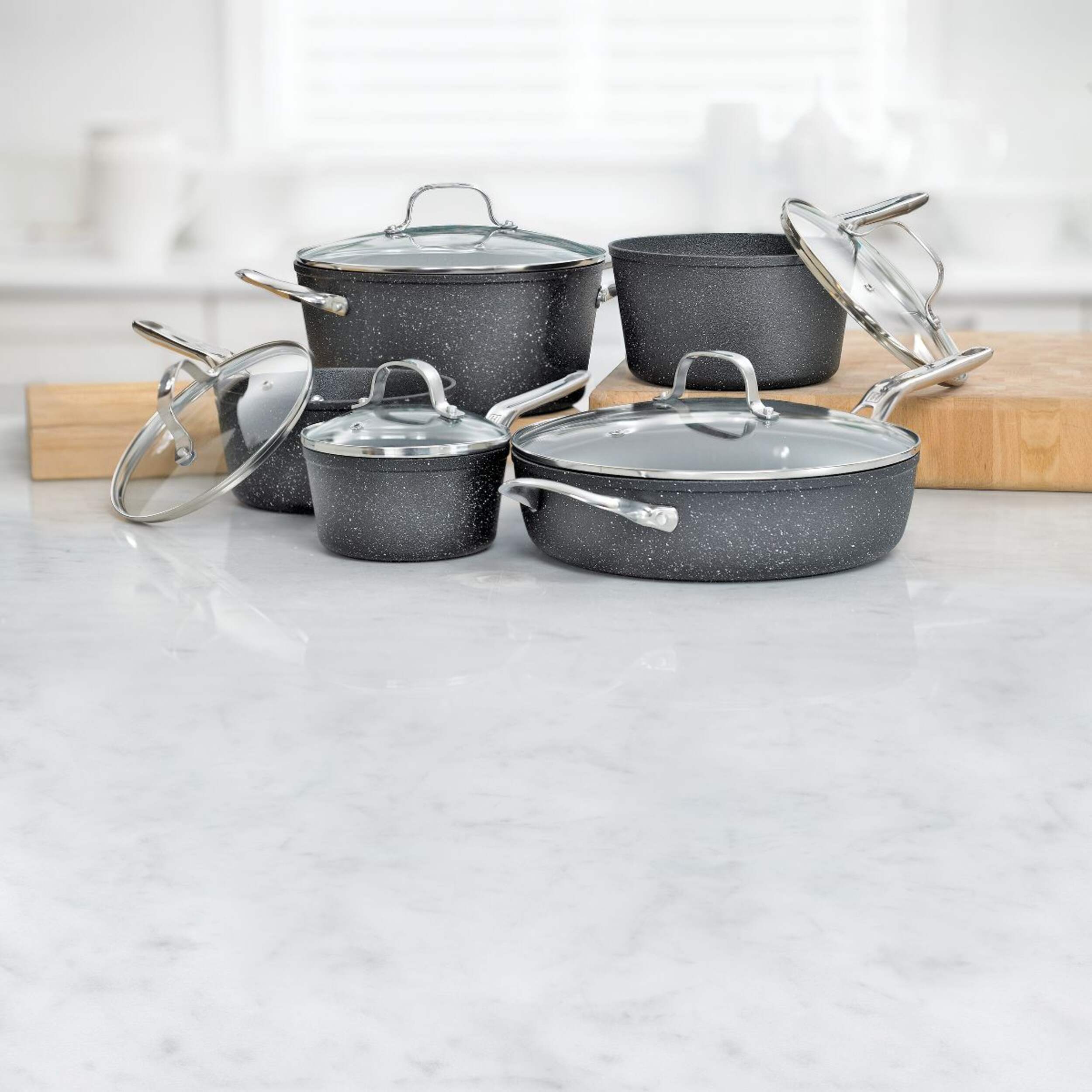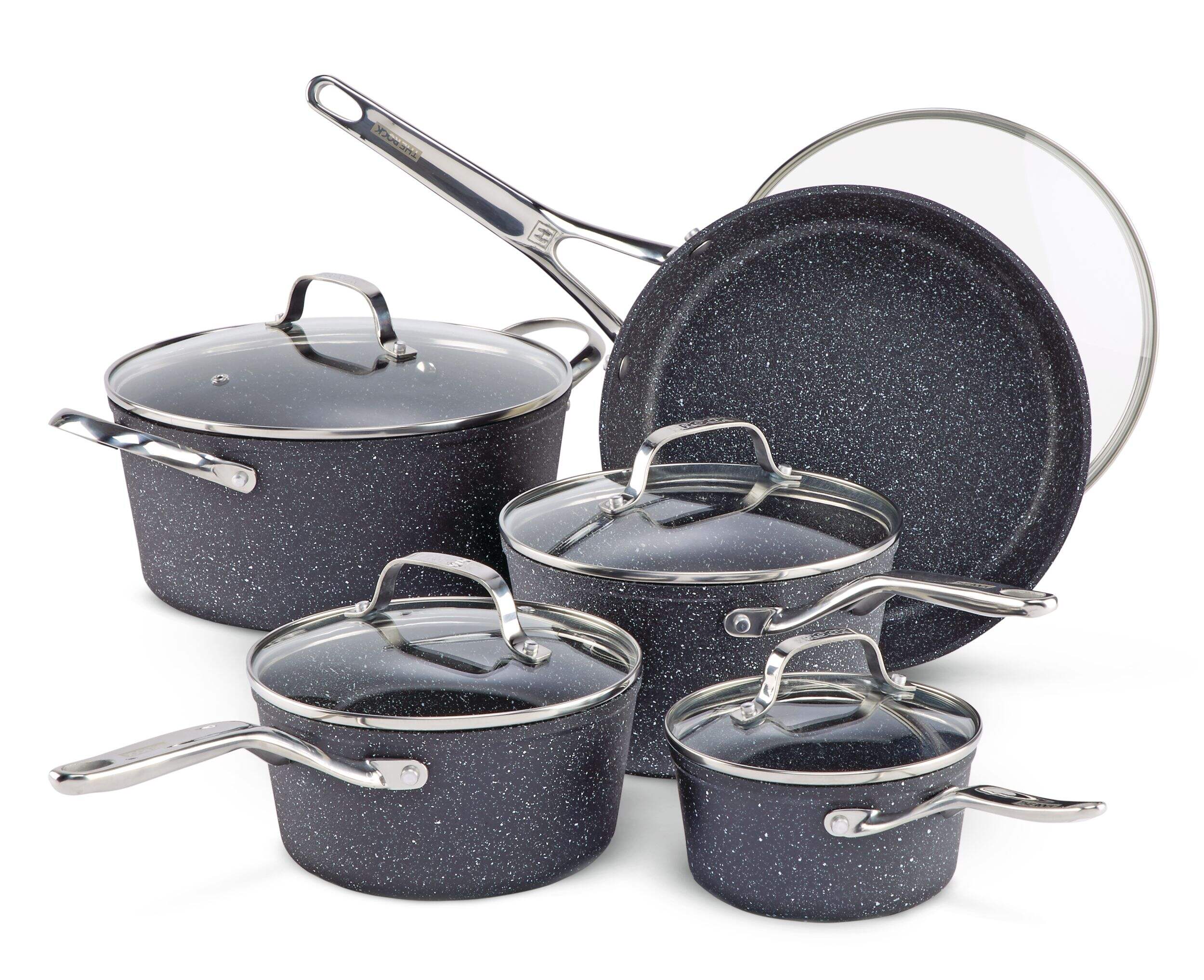 The Heritage The Rock Forged Non-Stick Cookware Set is a comprehensive cookware set featuring durable, thick forged aluminum bases and the unique Rock Tec surface. These non-stick pans are three times more non-stick than traditional non-stick cookware, as well as more scratch and wear resistant. This non-stick cookware boasts great heat distribution for evenly cooked dishes and cleans up in a breeze once used.