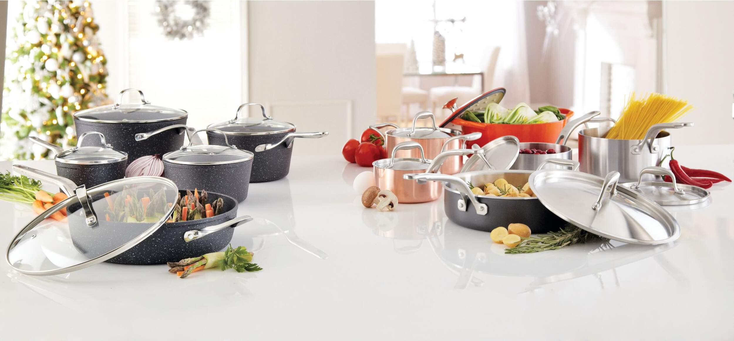 Set includes: 1, 2 and 3 qt (0.9, 1.8 and 2.8 L) covered saucepans, 6 qt (5.5 L) covered stockpot and 10" (26 cm) covered frying pan