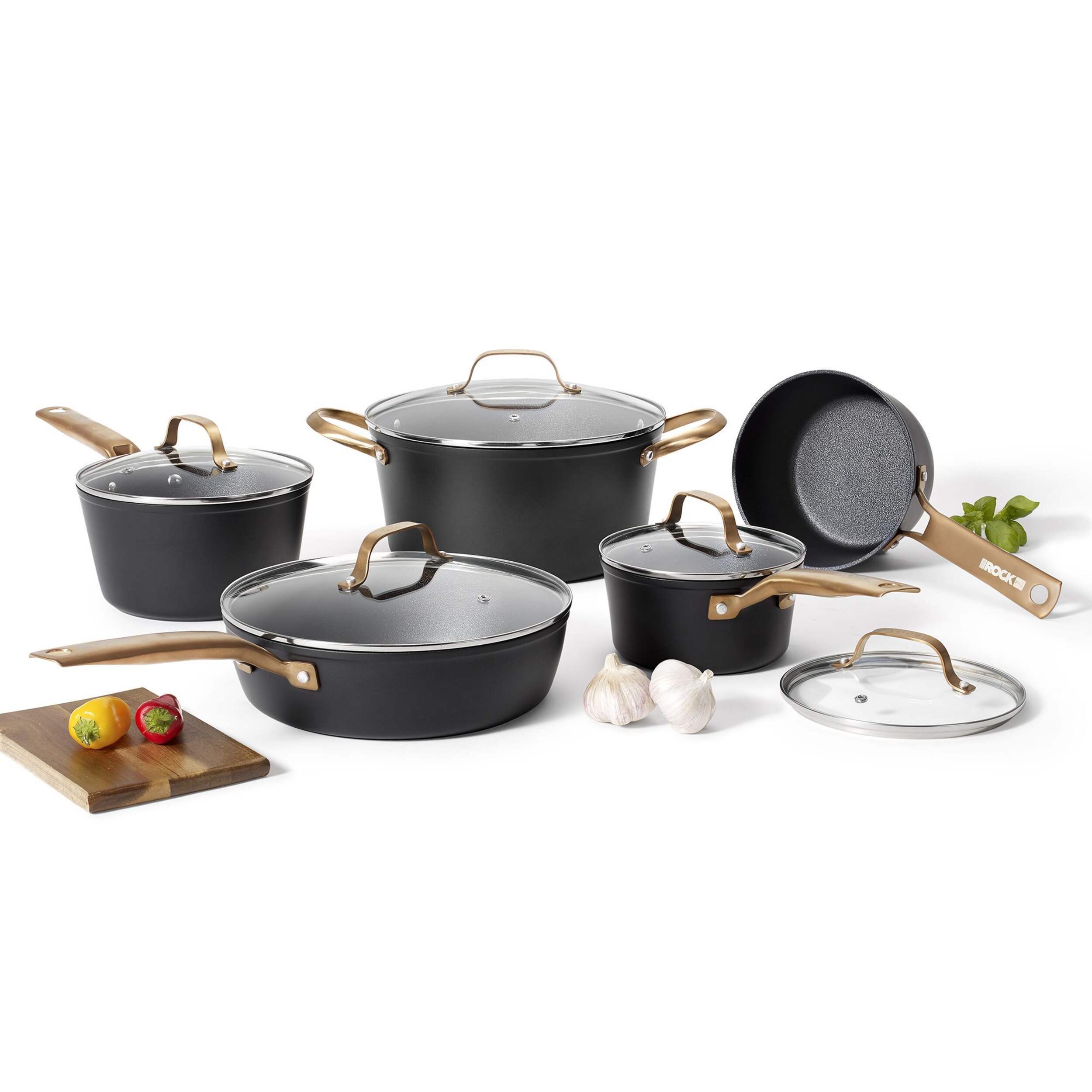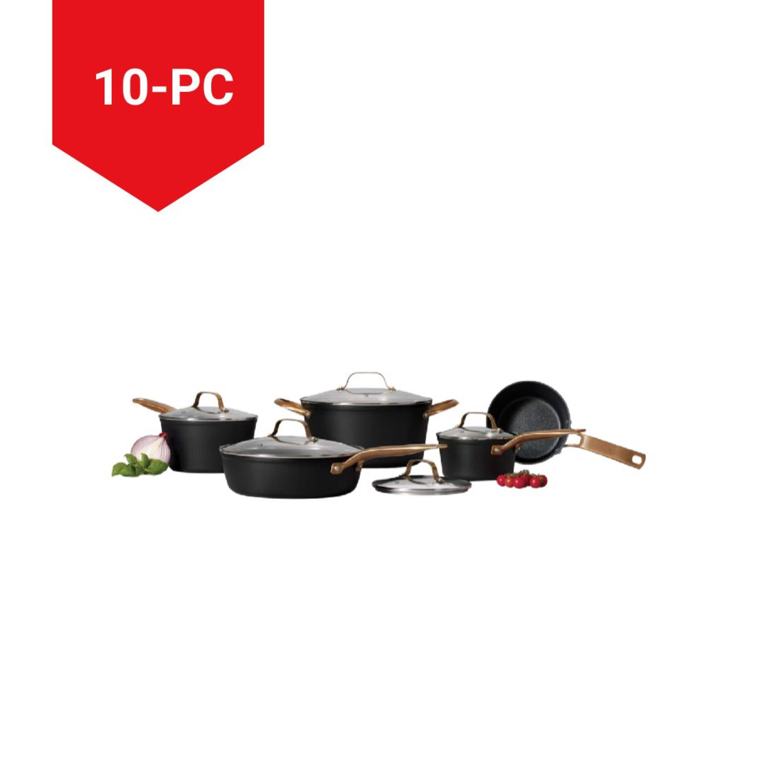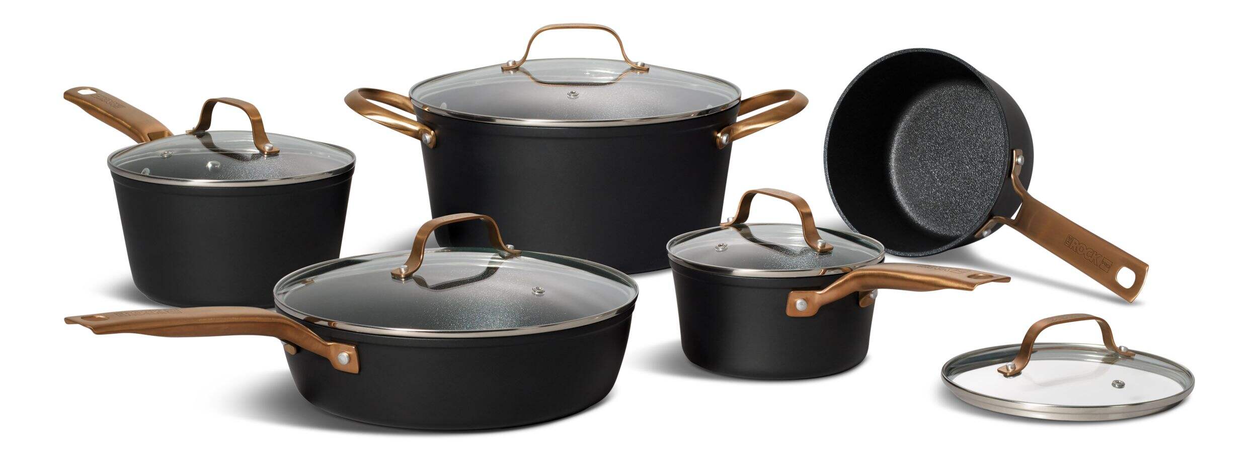 The Heritage Rock PRO 10-piece Cookware Set delivers outstanding performance and durability. The included pieces feature forged aluminum bases reinforced with titanium for superior scratch resistance and non-stick release. In sum, this versatile cookware set includes everything needed to prepare meals on any stovetop.
