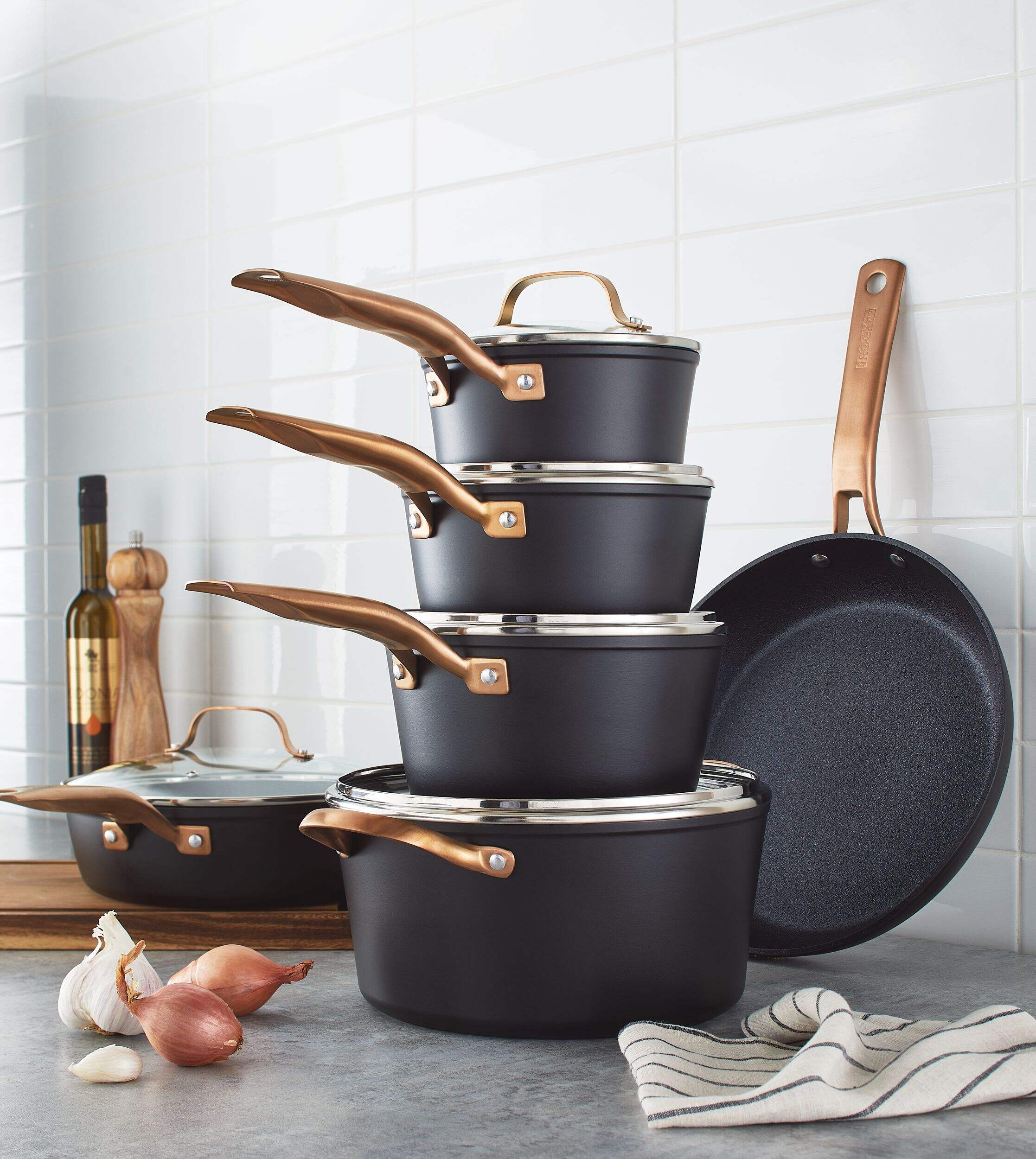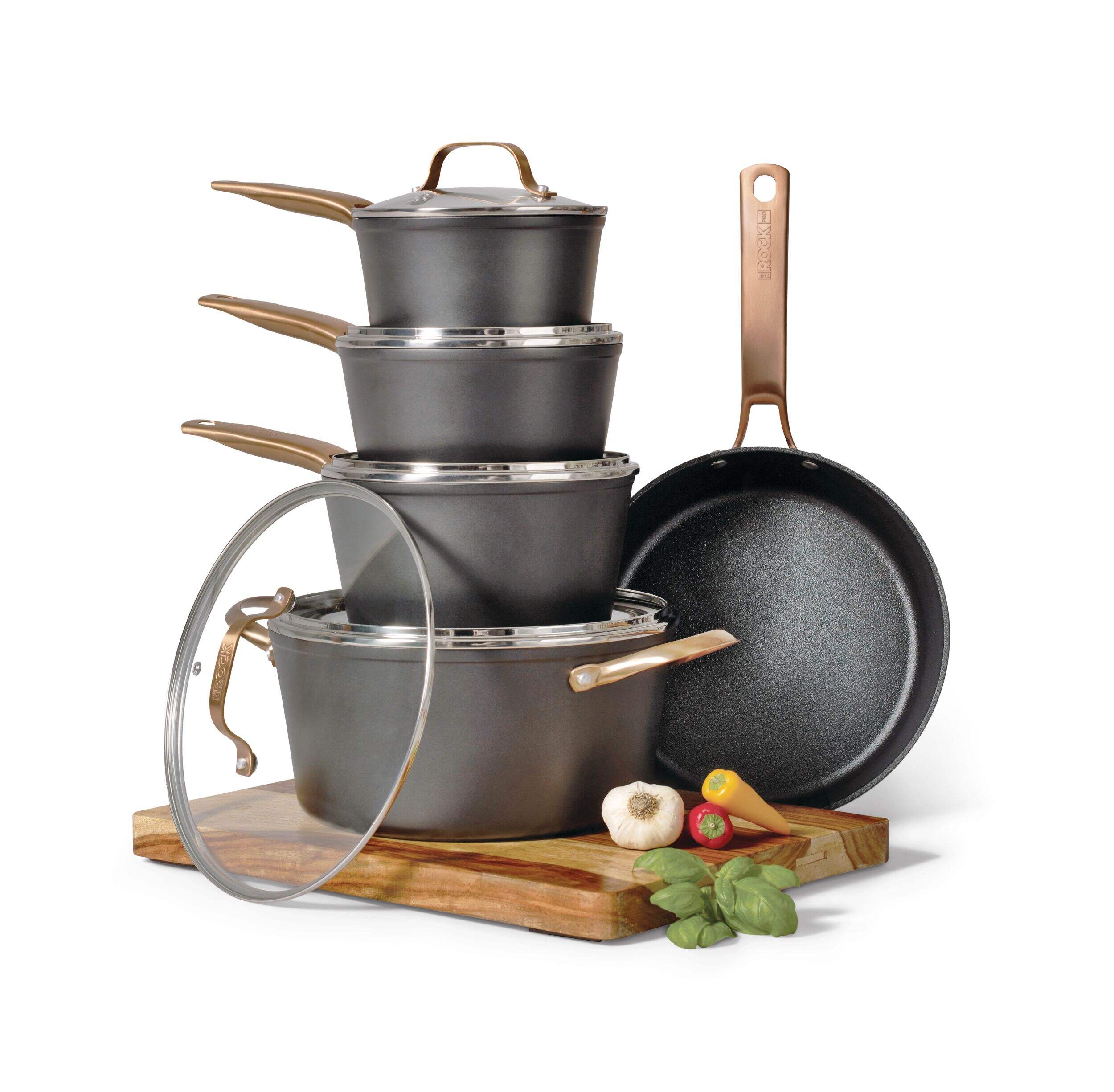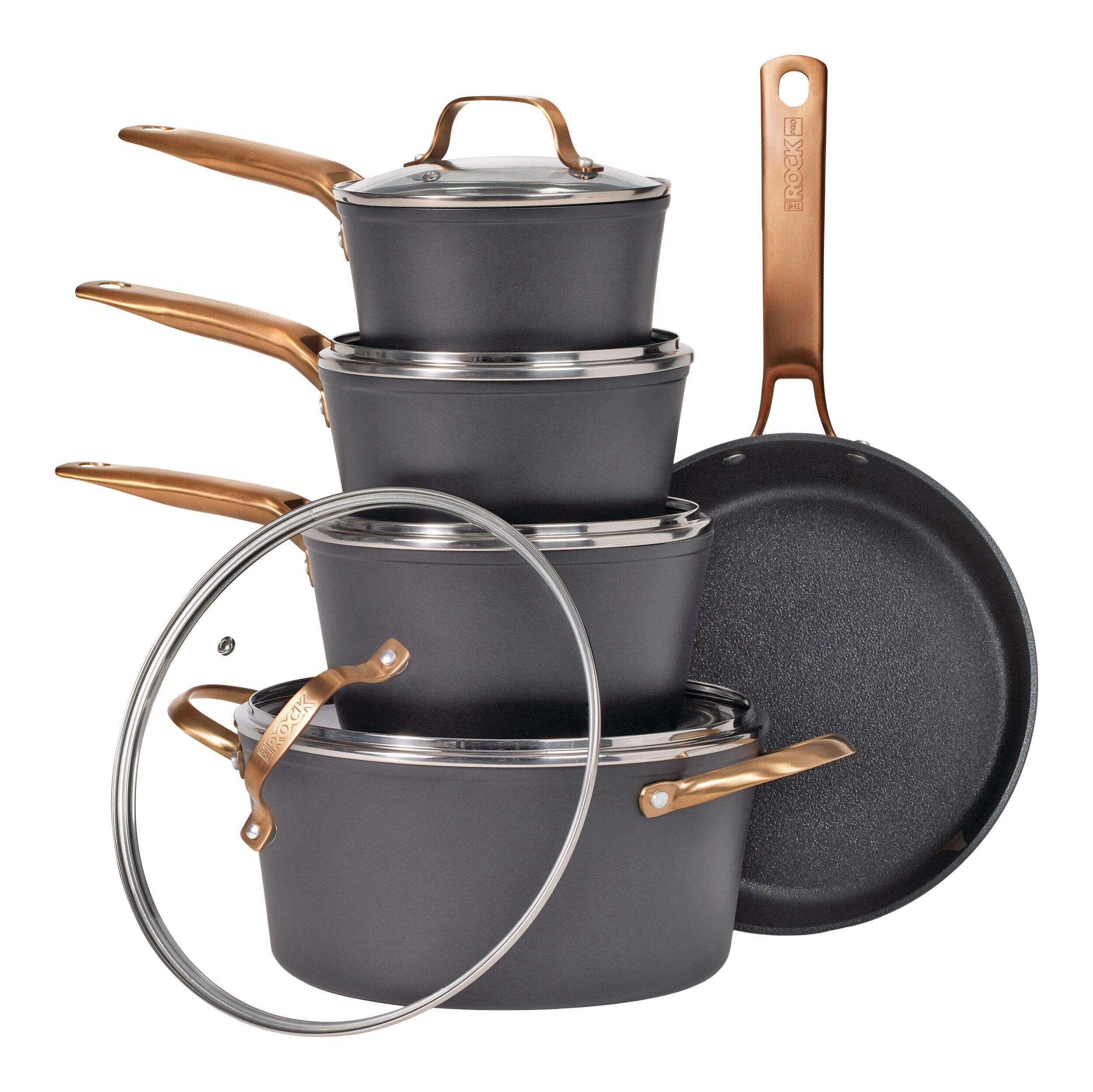 The Heritage Rock PRO 10-piece Cookware Set delivers outstanding performance and durability. The included pieces feature forged aluminum bases reinforced with titanium for superior scratch resistance and non-stick release. In sum, this versatile cookware set includes everything needed to prepare meals on any stovetop.