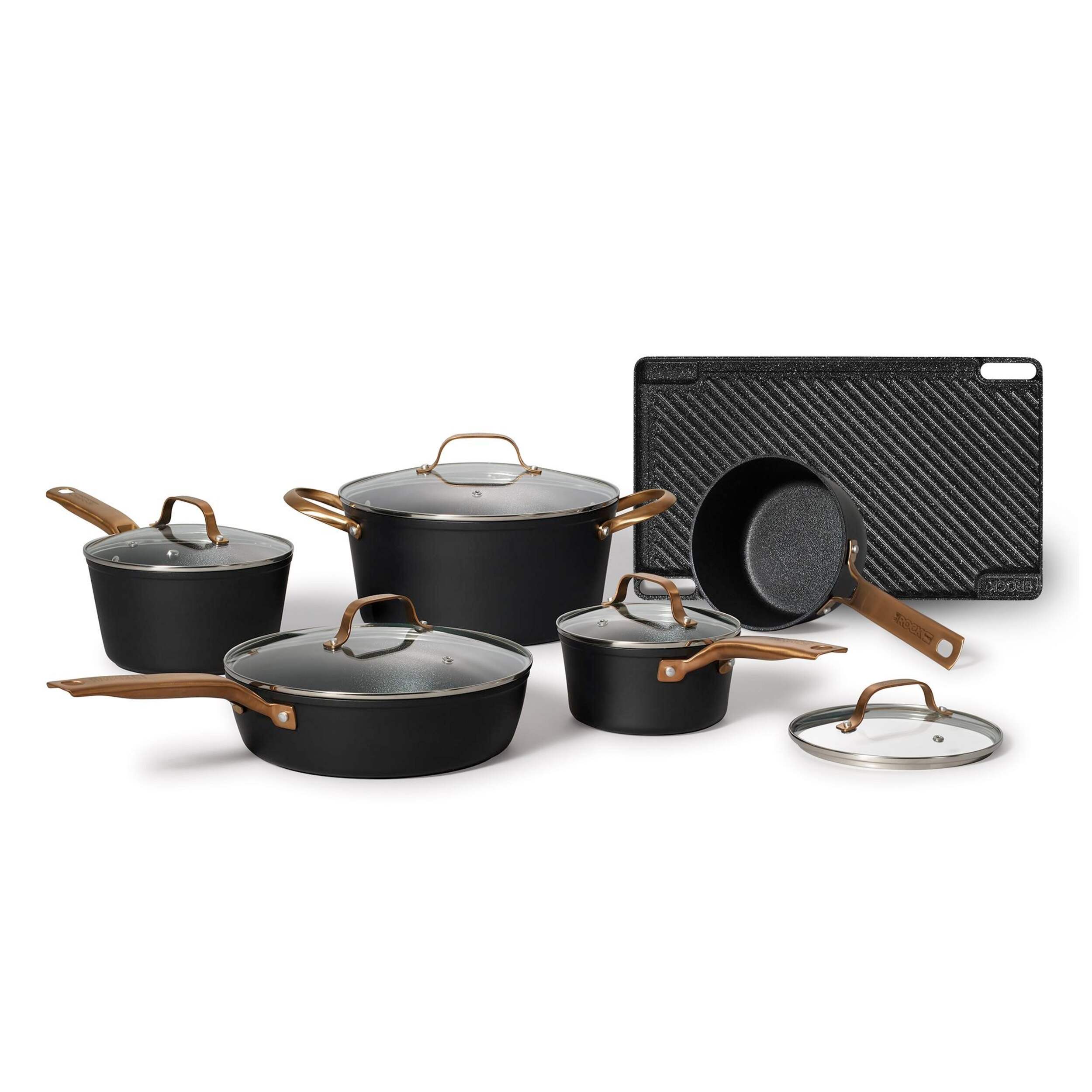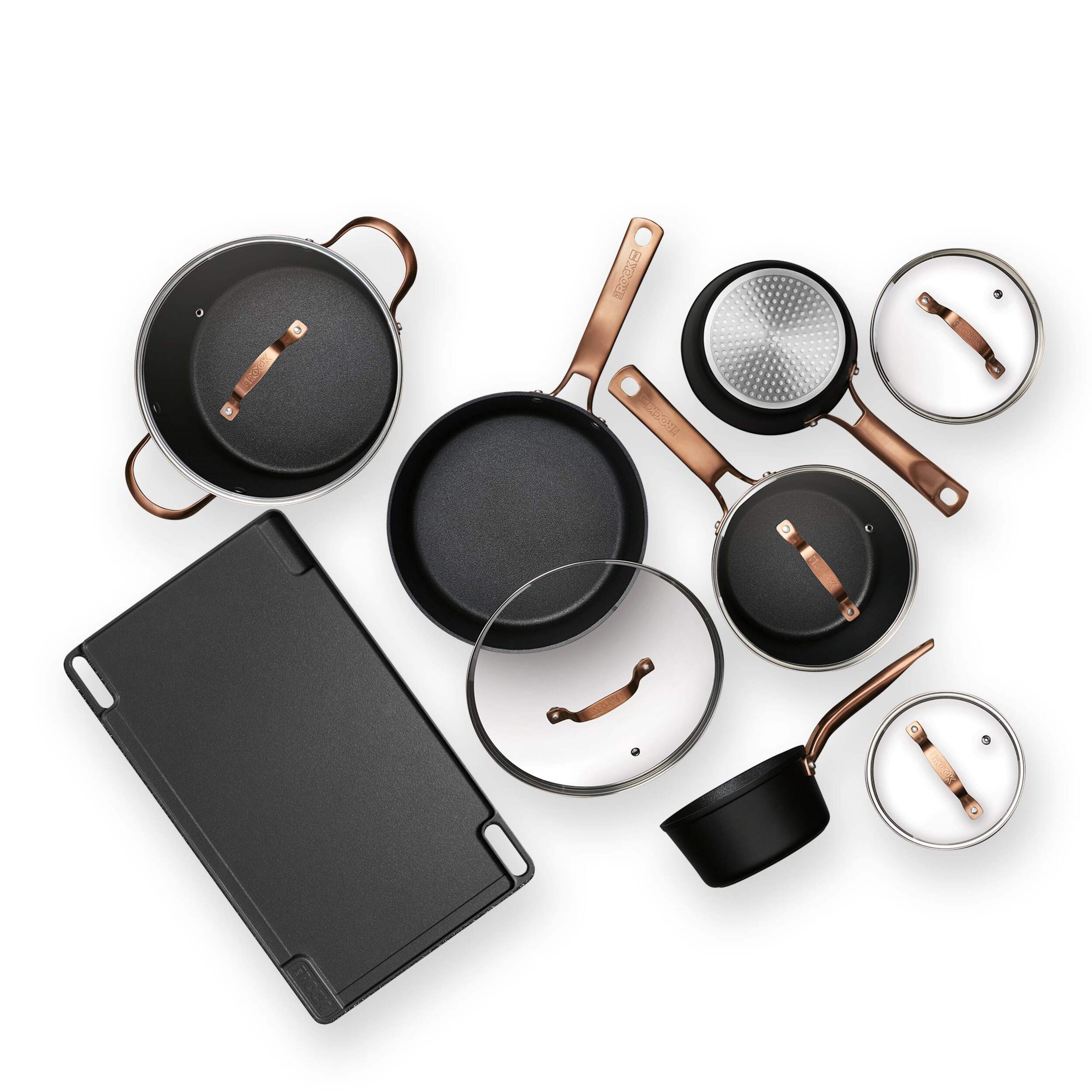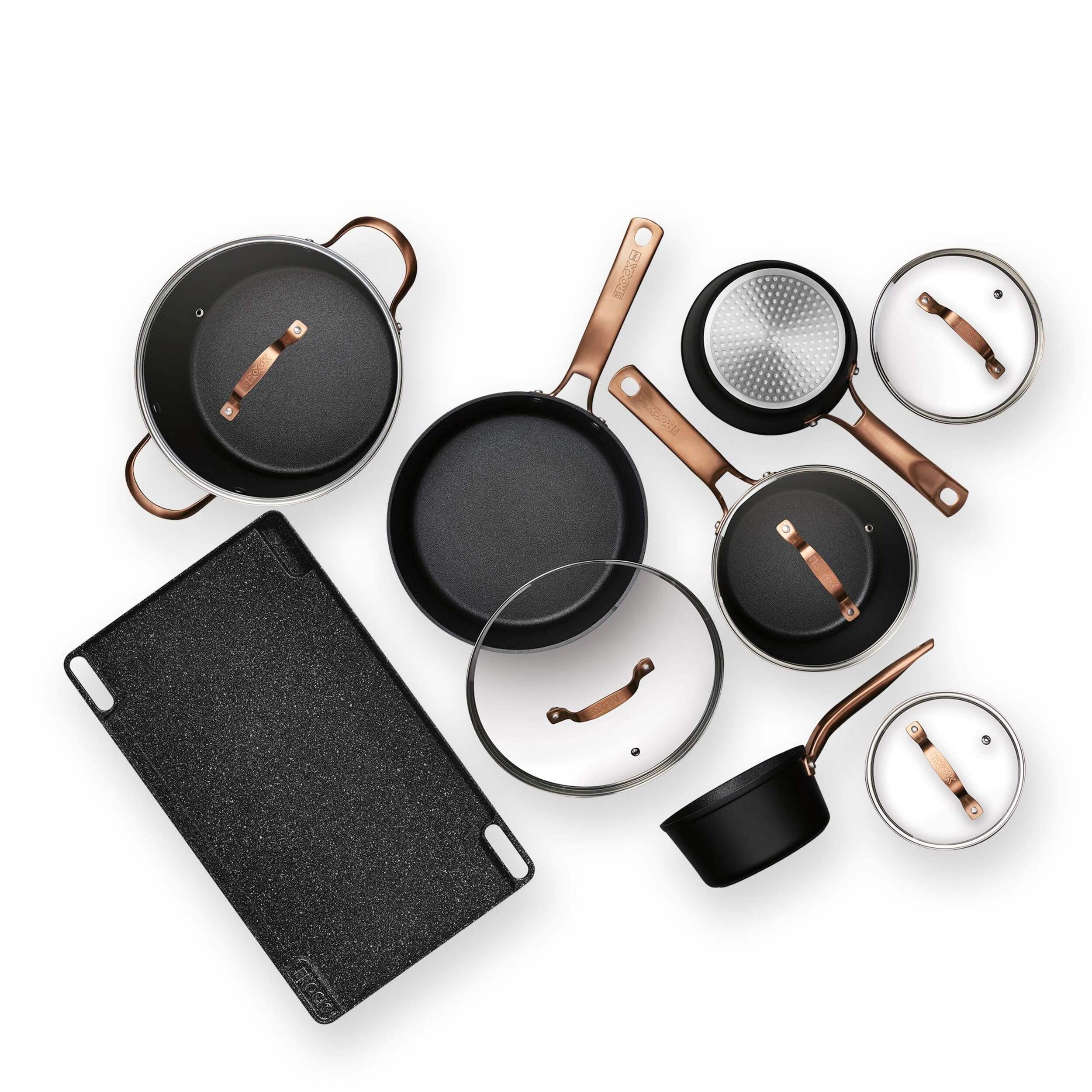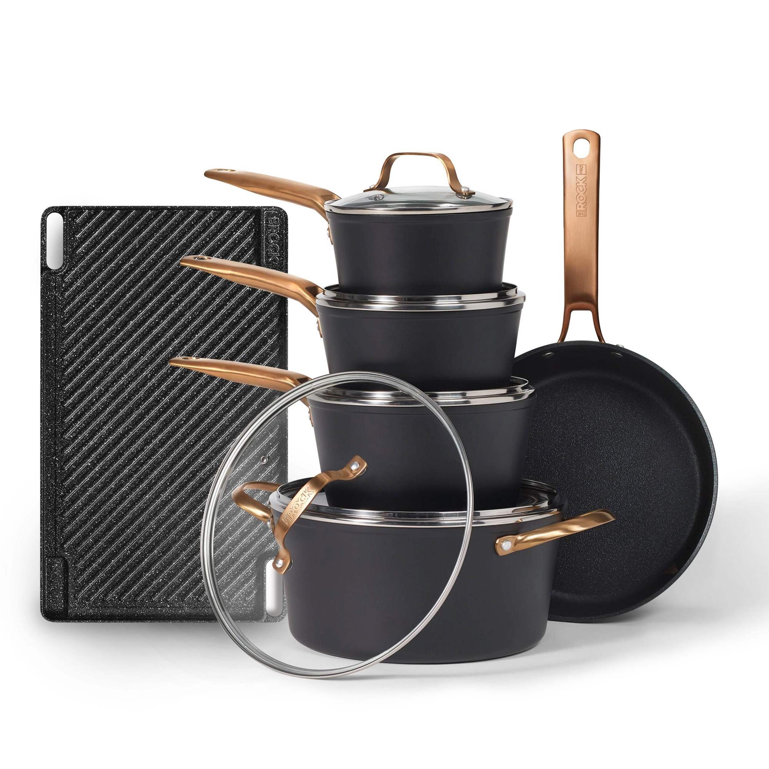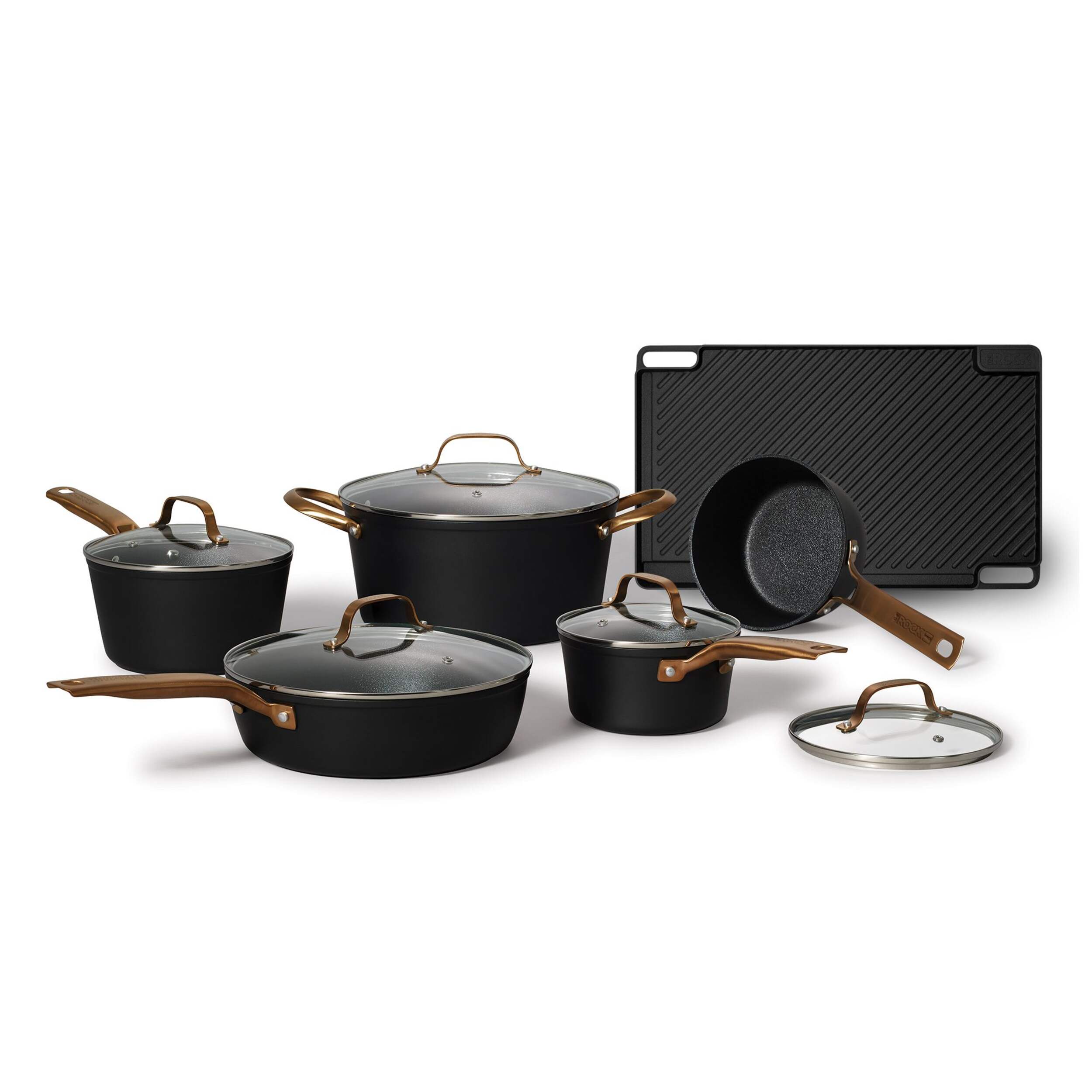 The set includes a frying pan and four pots in graduated sizes, all with lids, and a bonus reversible griddle