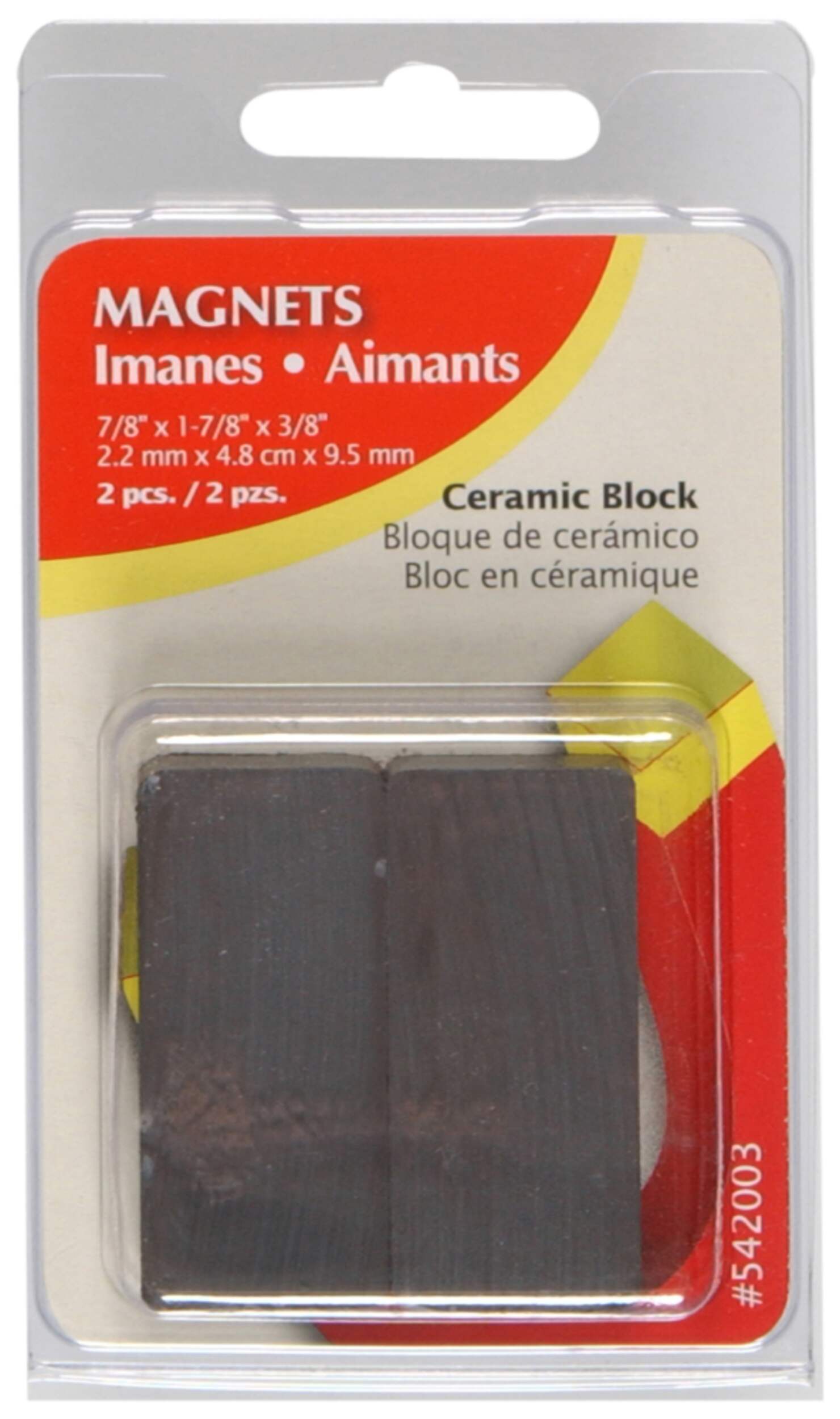The Hillman Heavy Duty Ceramic Block Magnet, 1-7/8 x 7/8 x 3/8-in, provides strength and durability for a variety of uses. The 1 7/8 by 7/8 by 3/8 inch magnet adheres easily to most metal surfaces, making it ideal for holding notes, photos, and reminders on the fridge. It can also attach tools, hardware, or accessories to toolboxes, project boards, or garage walls, keeping everyday items handy and organized. The ceramic coating protects the magnet from corrosion, so it will hold up to years of use around your home.