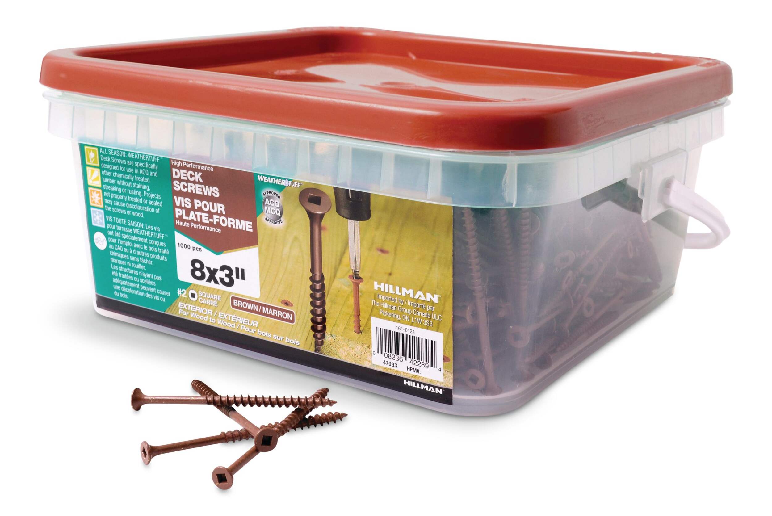 Hillman Pro-fast Premium Deck Screws are engineered for superior performance in all exterior wood and decking projects. Featuring a no-strip star drive, countersinking blades, and a no-split twist shank, these screws require no pre-drilling, making installation quick and efficient. The subtle brown finish blends seamlessly with treated wood for a cohesive look. With 1,000 screws per pack, you'll have plenty for large-scale jobs. Trust Hillman for reliable, long-lasting decking solutions.
