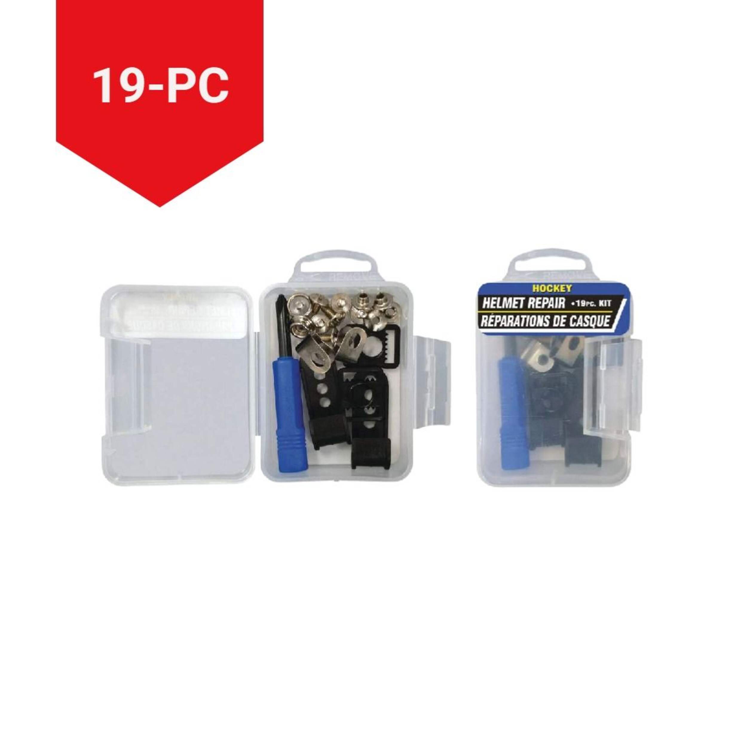 The Hockey Helmet Repair Kit provides a quick solution to fix minor damages. This 19-piece set helps make repairs to helmets when you're on the go The kit includes a hard plastic tool box for easy storage and transportation, a screwdriver, and assorted helmet screws and buckle parts. The tools are designed for convenience and ease of use.