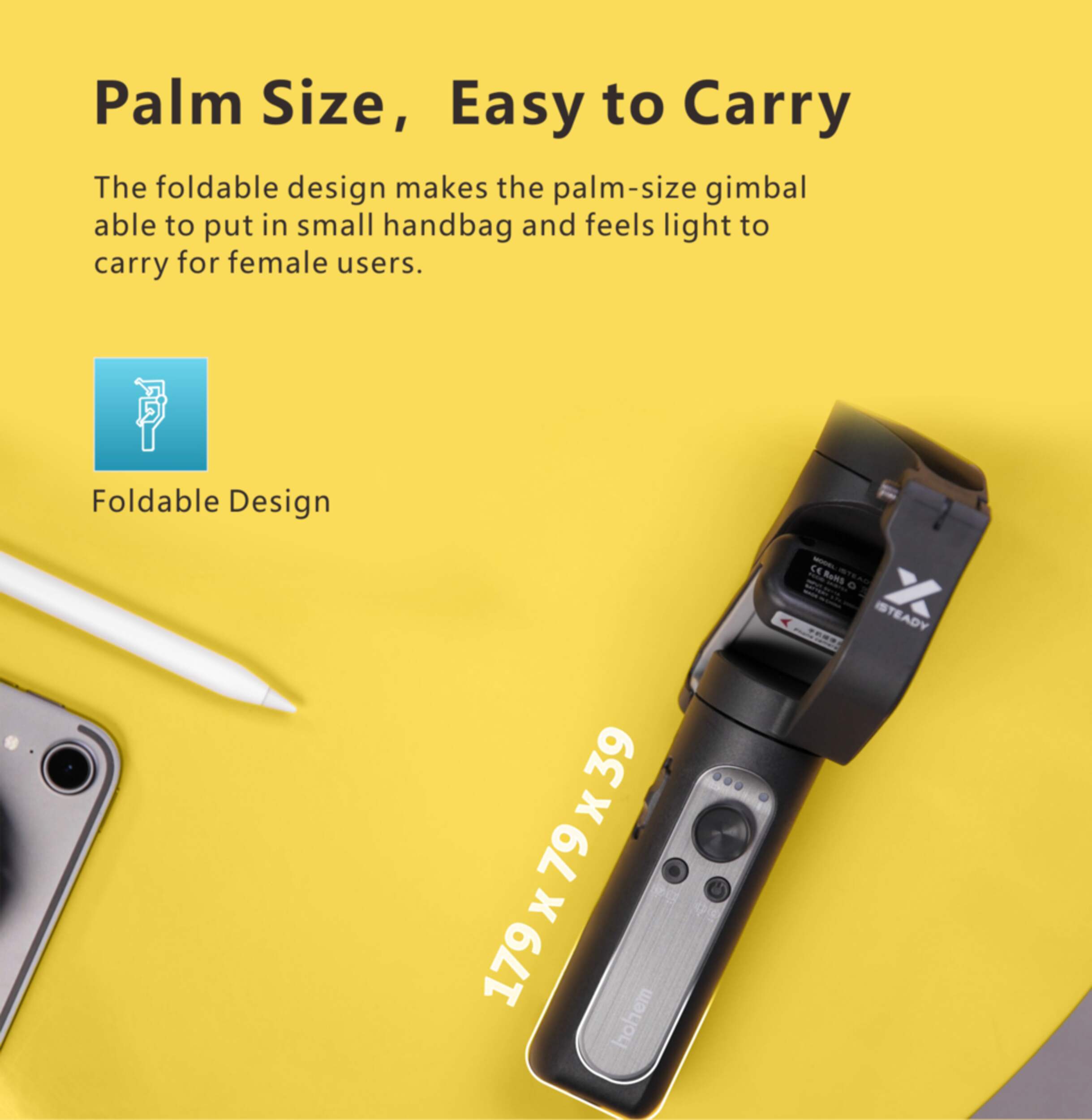 Hohem iSteadyX 3-Axis Palm Gimbal is the ultra-light weighted smartphone gimbal stabilizer that folds to fit in your pocket, with straightforward user operation made for everyone, and an all-functional App offered to unlock possibility