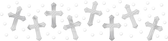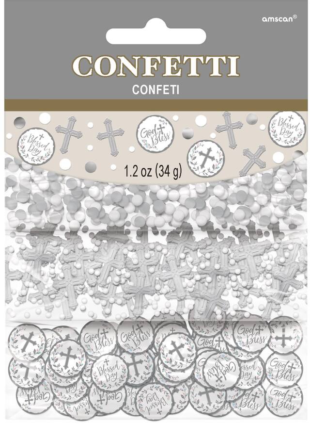 White & Silver Holy Day Confetti features silver trefoil crosses and white /silver coins that read God Bless and Blessed Day