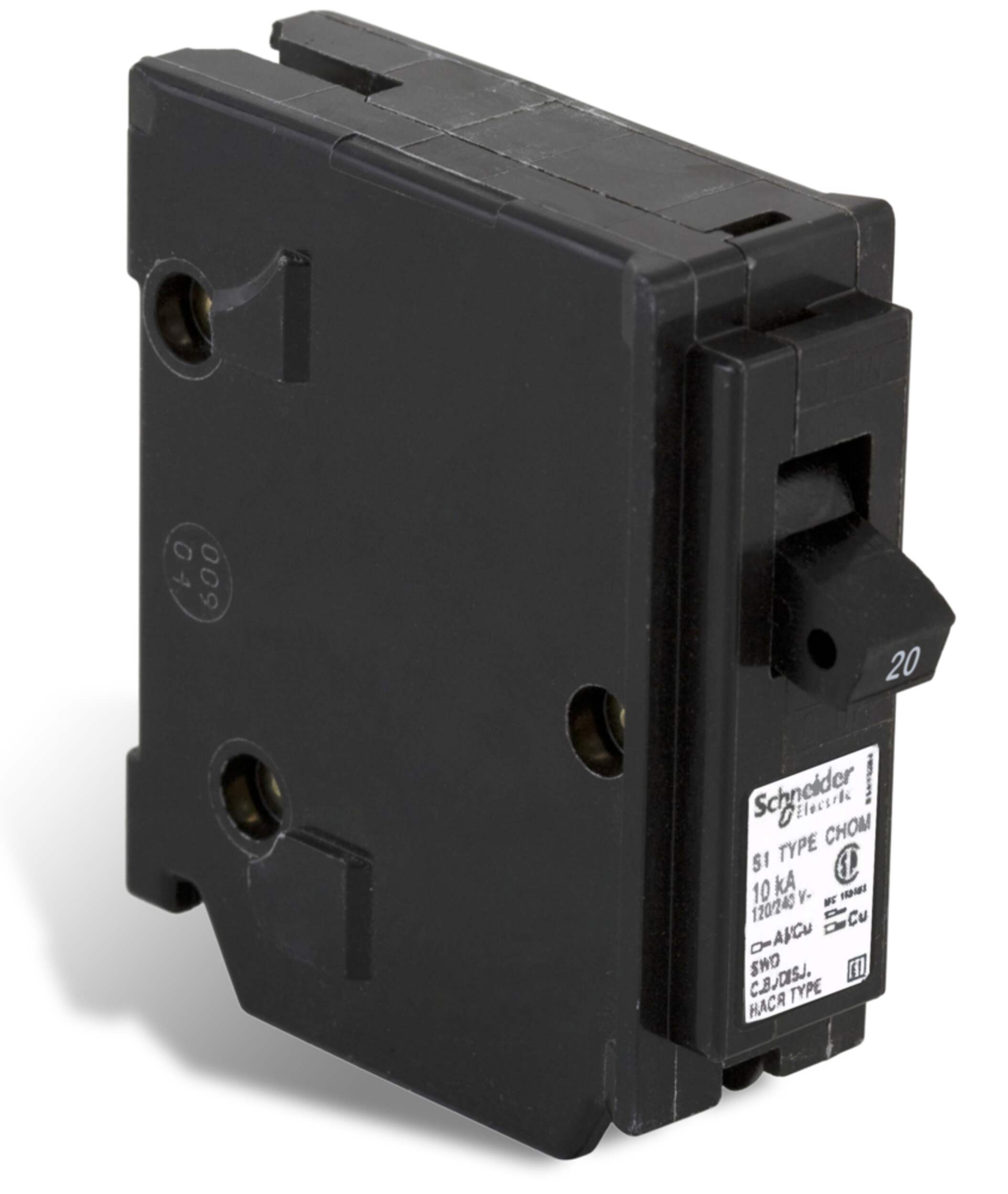 CHOM Homeline miniature circuit breakers are engineered and designed for fast installation and superior circuit protection. Homeline circuit breakers are designed to plug into Homeline load centers to provide circuit protection. This circuit breaker provides standard circuit protection and is HACR rated. This 1 pole circuit breaker with plug in mounting is rated 20 A at 120/240 VAC. CHOM breakers provide 10 kA breaking capacity. The electrical connection is a clamp terminal that will accept 2 wires. The clamp terminal will accept a wire range of 14 AWG to 8 AWG copper or aluminum wire. This circuit breaker has a height of 3.13 inches, a width of 1.0 inch and depth of 2.98 inches. CHOM Homeline miniature circuit breakers are CSA certified. They are contractor packed.