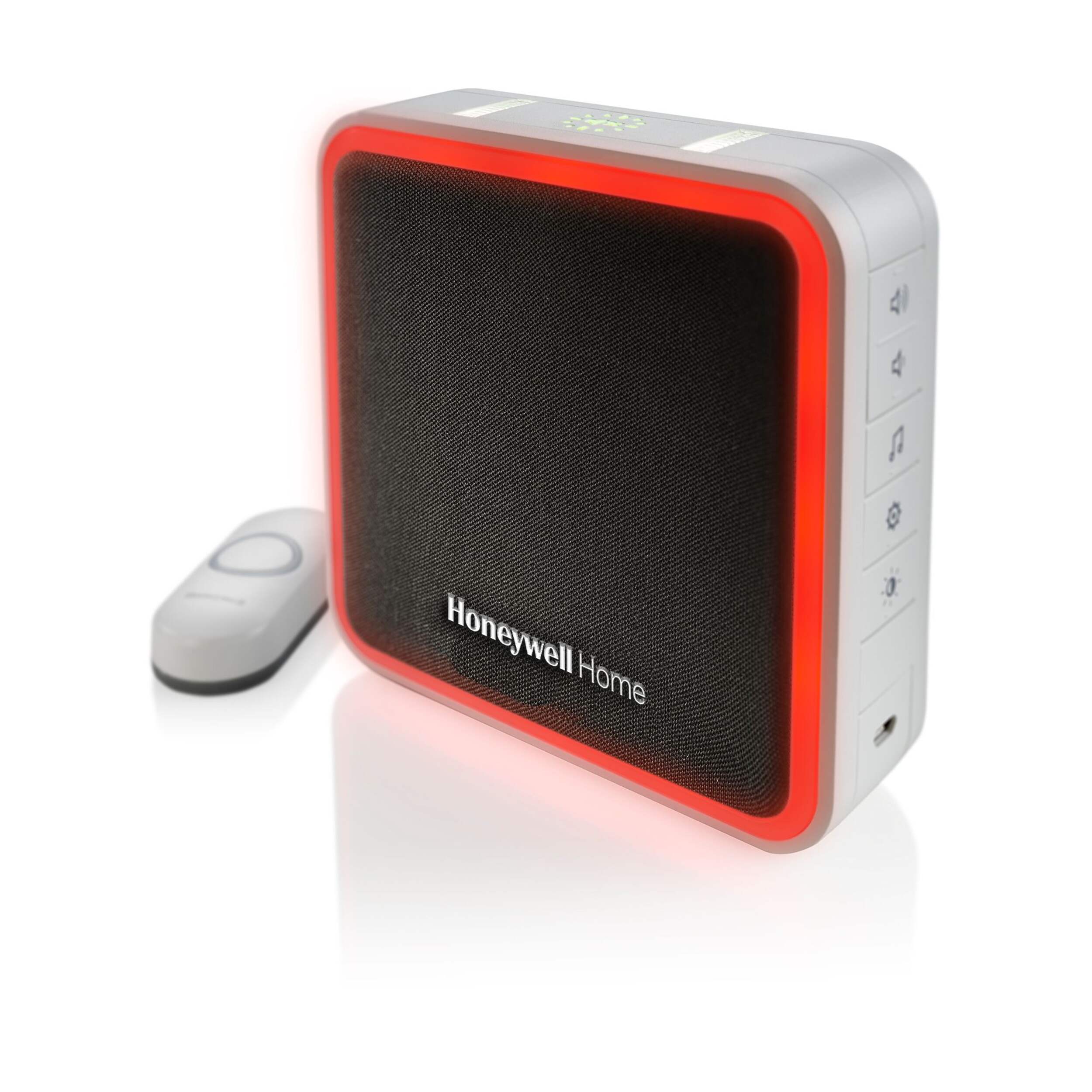 Never miss a delivery or visit again. The Honeywell Series 9 Portable Doorbell and Push Button Set represents the finest in Honeywell design with innovative features ranging from downloadable tunes and custom visual alerts to the peace and quiet of a mute timer. Featuring a noise output (90 dB) that's capable of reaching up to 450 ft, this wireless doorbell uses Honeywell ActivLink that's able to connect with up to six transmitters simultaneously. This would include: additional push buttons, awareness devices, door contacts and motion sensors. This wireless doorbell comes with an illuminated halo and LED strobe lights, as well as eight preinstalled tunes. Customization is enhanced even more with the ability to download an MP3 and use if as your personal doorbell tune.