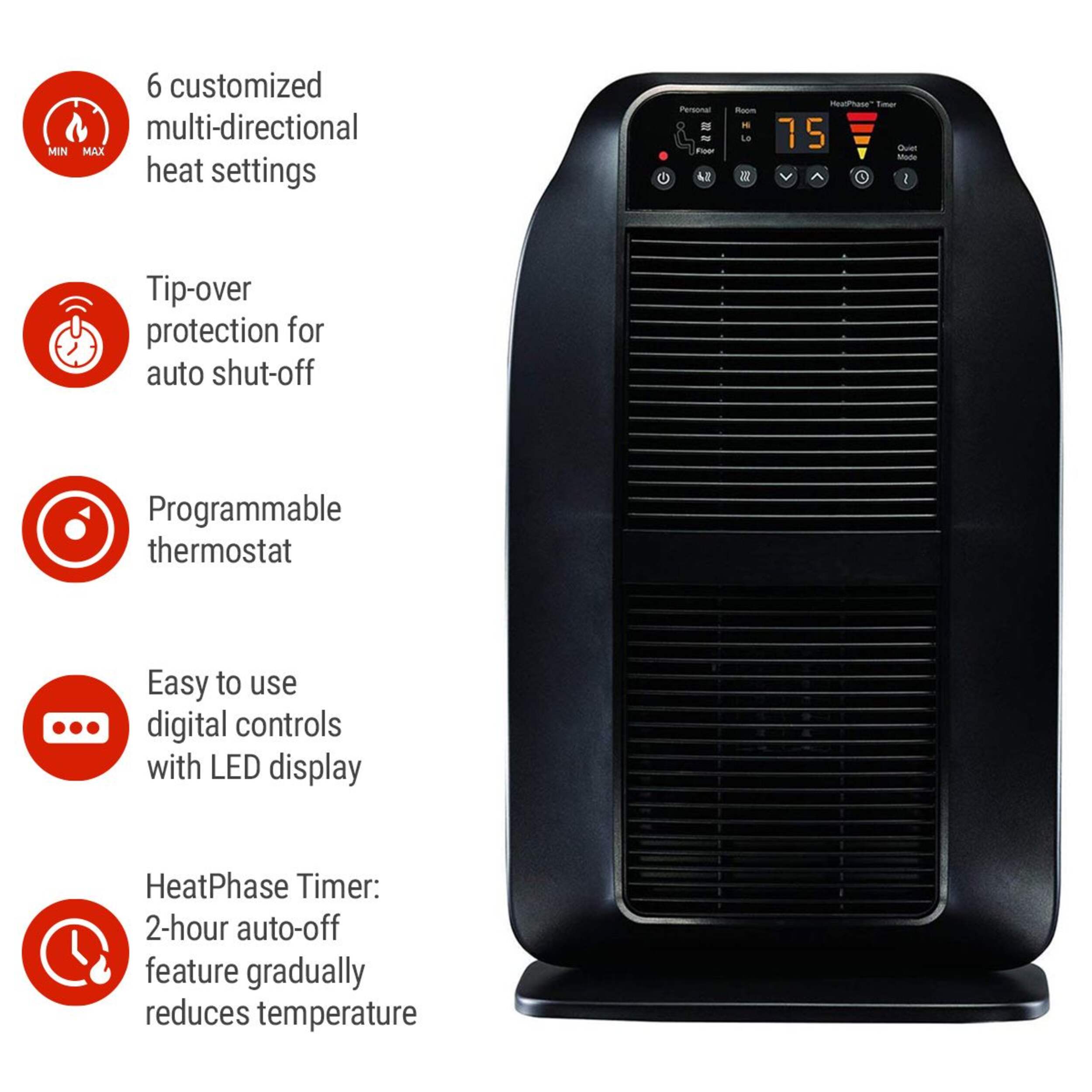 • HeatPhase™ Timer has a 2-hour auto-off feature that gradually transitions the room temperature from warmer to cooler
