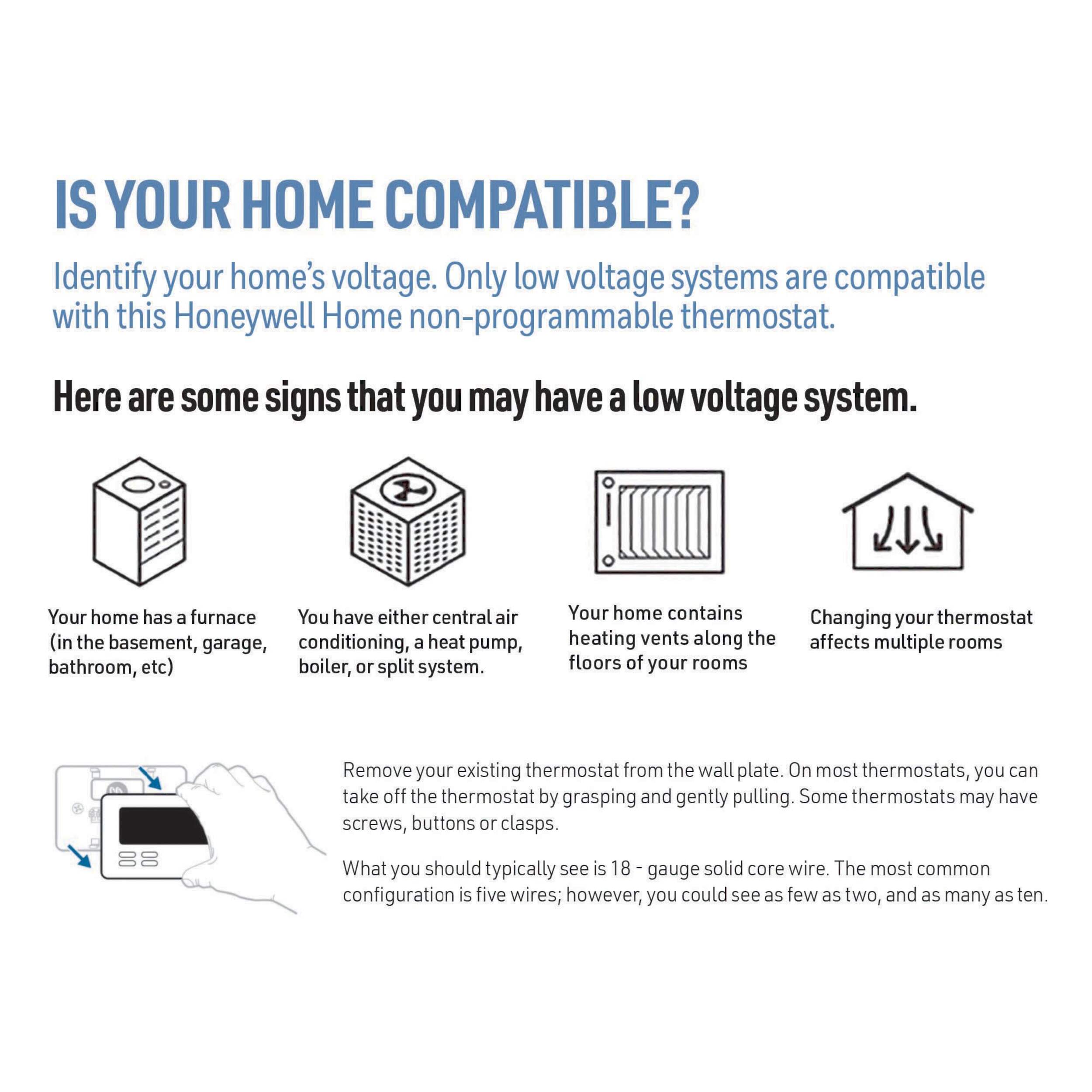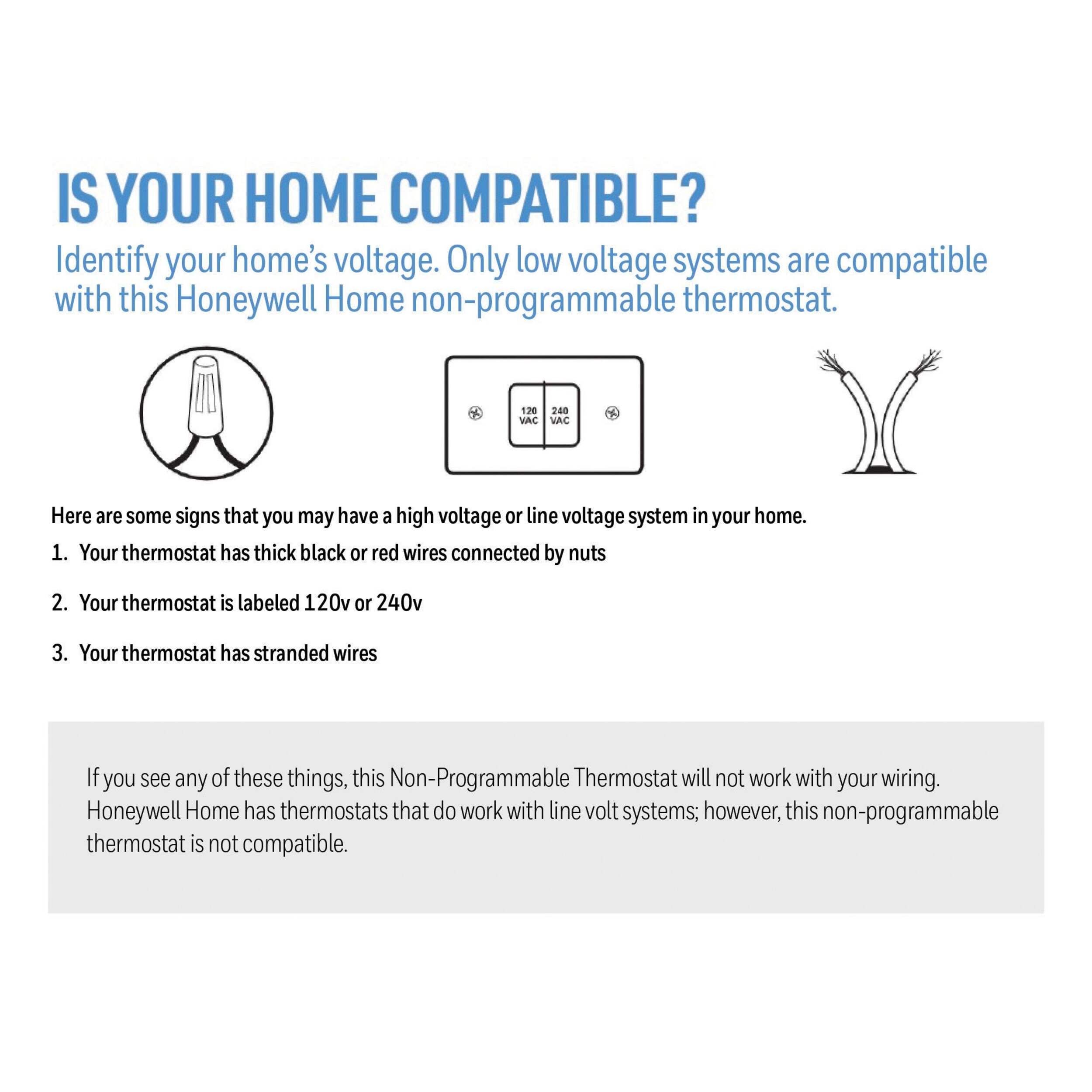 Does NOT work with electric baseboard heat (120-240 V), heat pumps with backup, or multi-stage heating/cooling systems