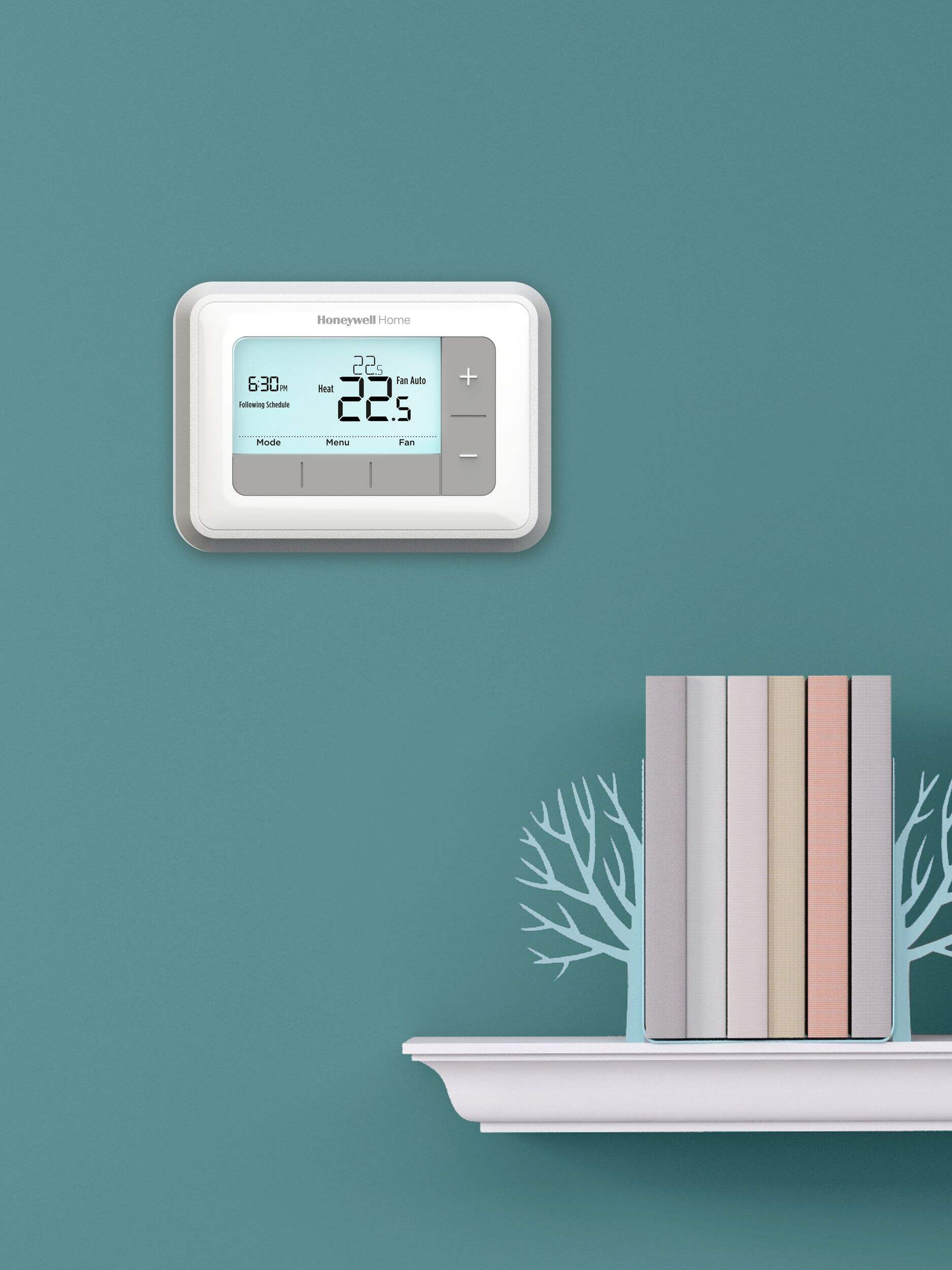 The Honeywell Home T4 5-1-1 Day Programmable Thermostat offers precise temperature control and flexible scheduling, allowing you to set different temperatures for weekdays, Saturdays, and Sundays. Designed to manage your heating and cooling systems efficiently, this thermostat adapts to your home’s needs with smart response technology, learning how long it takes to reach your desired temperature and adjusting accordingly. With a large backlit display and simple push-button controls, it's easy to operate, and the adaptive intelligent recovery system ensures you're comfortable at the right time.