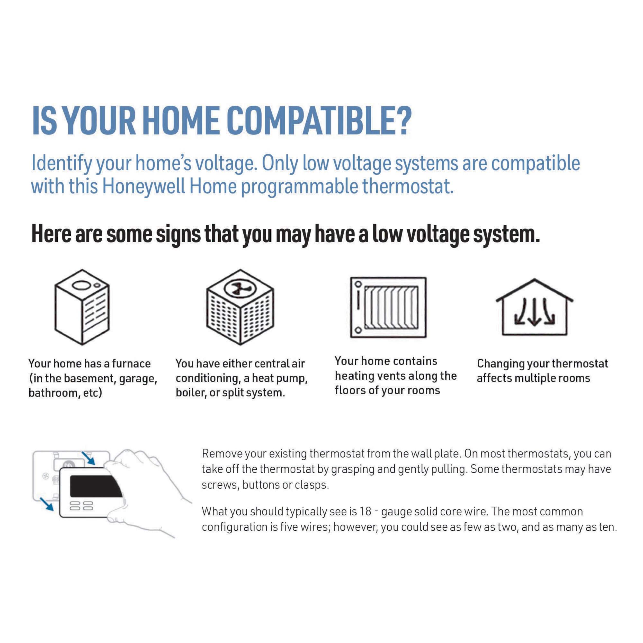 COMPATIBLE WITH: Forced air (gas, oil or electric), hot water and steam, and heat pumps with electric backup. Does NOT work with electric baseboard heat (120-240V)