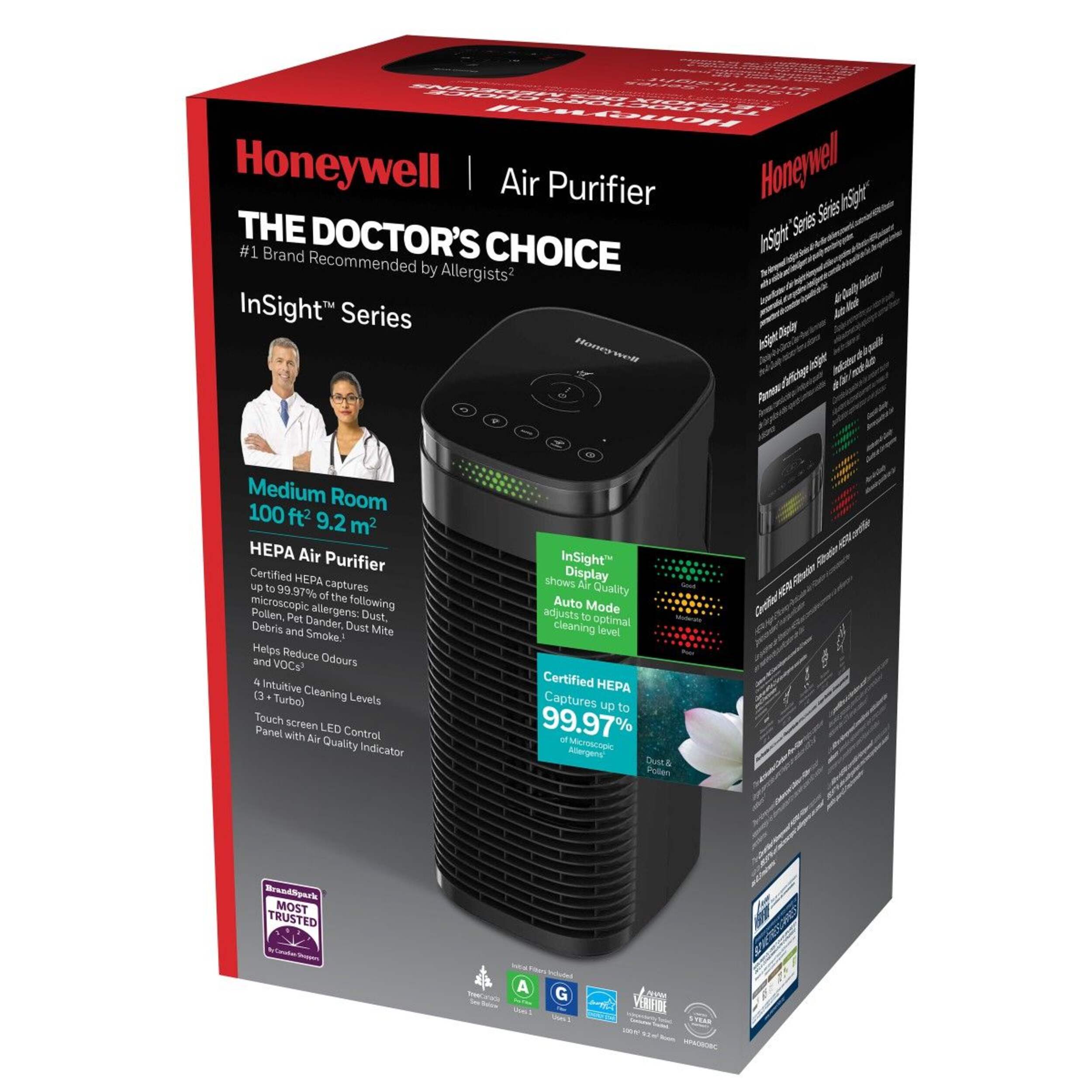 The Honeywell InSight™ Series HEPA Compact Tower Air Purifier delivers cleaner, fresher air in medium-sized rooms up to 100 sq. ft.² Designed with an Intelligent Air Quality Sensor, it continuously monitors indoor air quality, providing real-time feedback through a colour-coded display panel. The compact design combines modern aesthetics with functionality, ensuring optimal air purification while winning recognition with a Good Design Award.