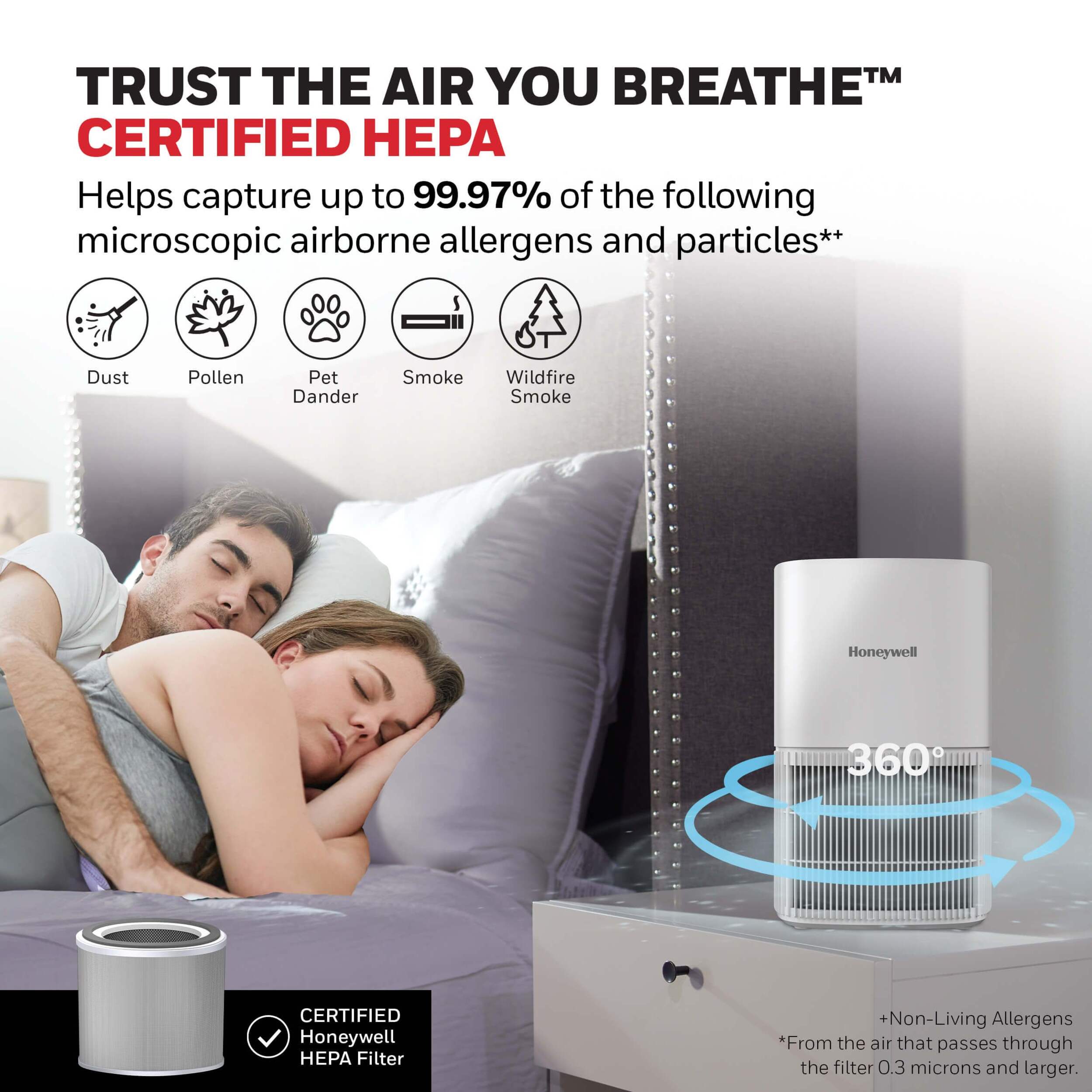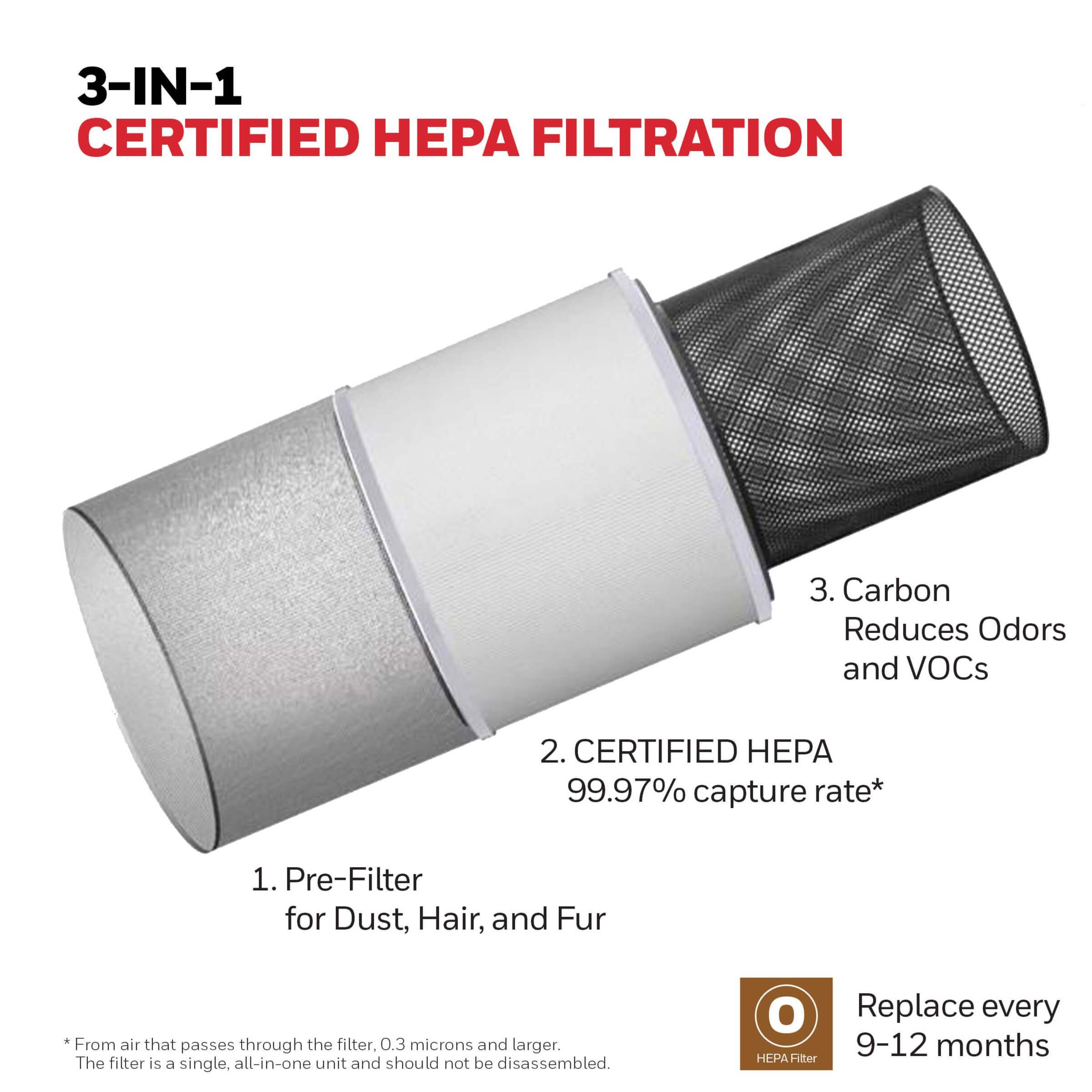 True HEPA filter captures up to 99.97% of microscopic airborne allergens and particles, including dust, pollen, pet dander, dust mite debris, smoke, and wildfire smoke