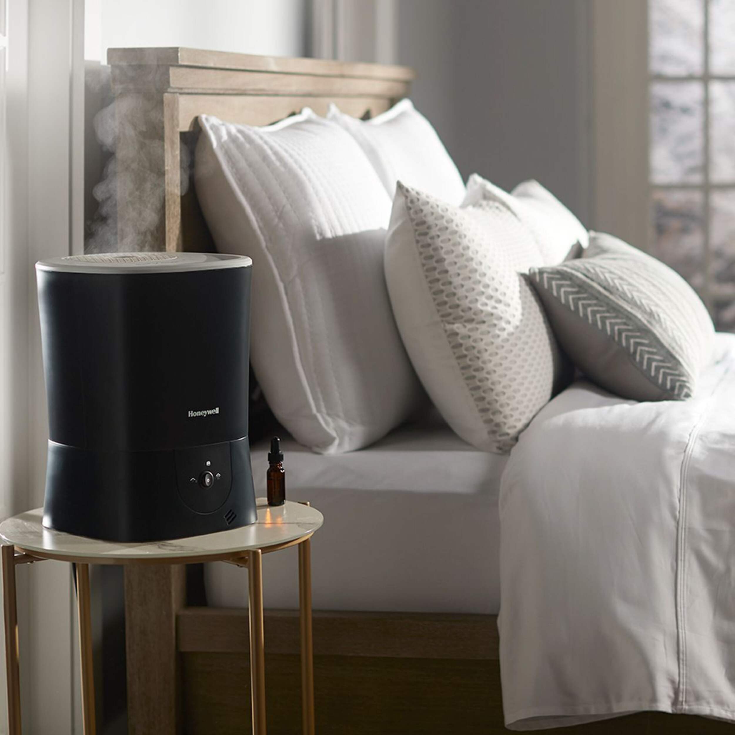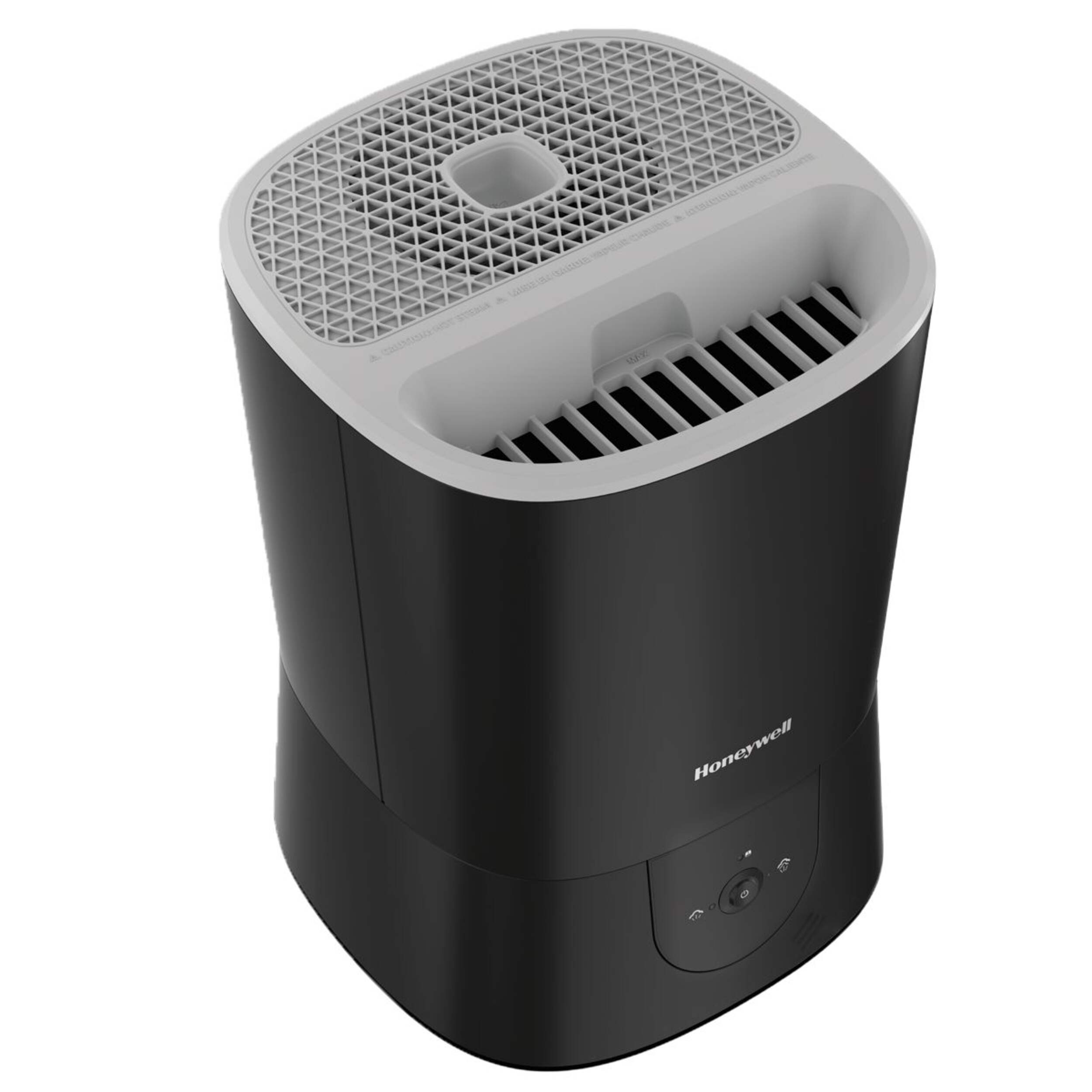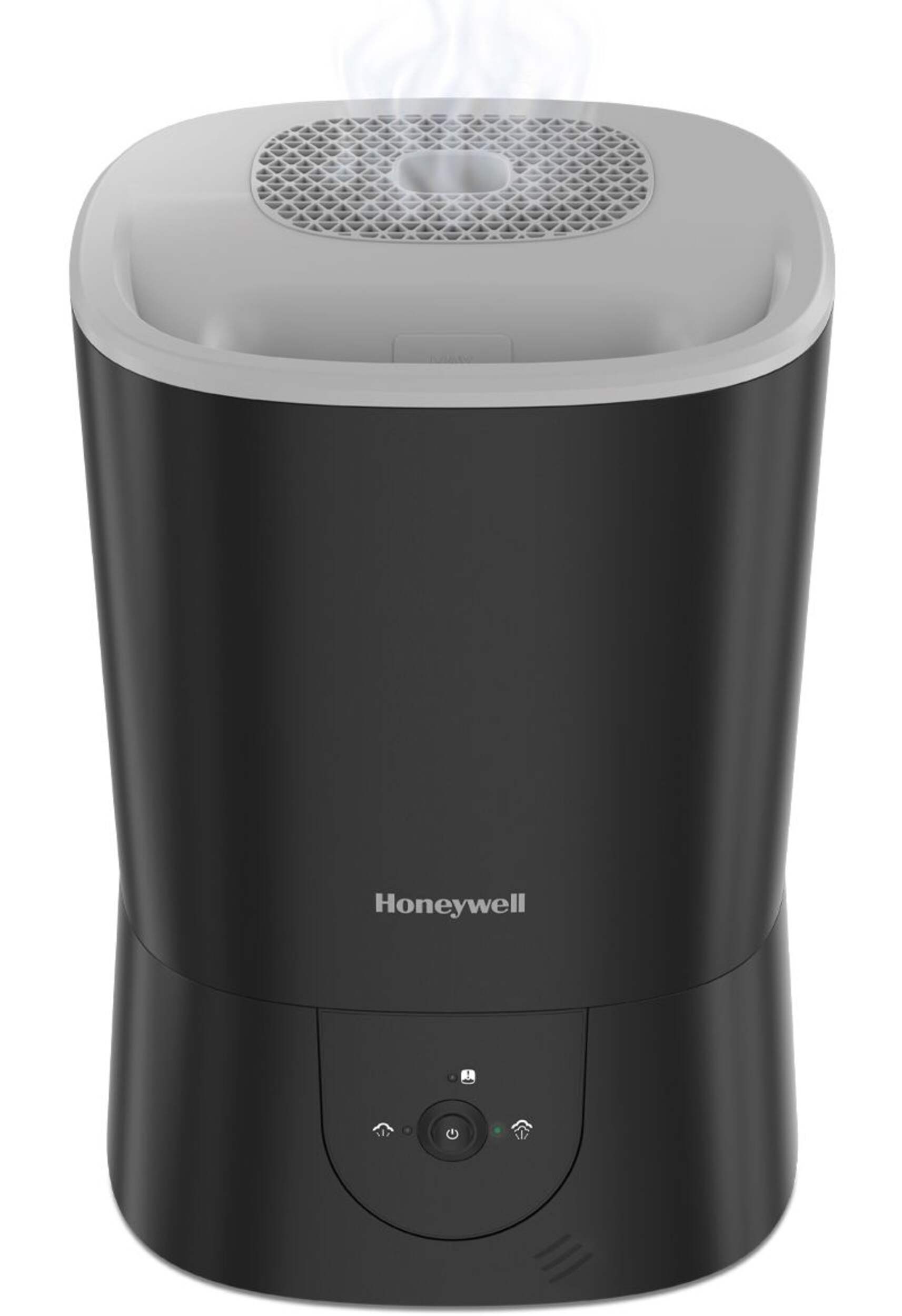 The filter-free Honeywell HWM440BC Warm Mist Humidifier produces warm visible mist in under a minute, bringing rapid relief to dry indoor spaces. This mist air humidifier features two comfort settings to suit your preference, while the auto shut-off ensures safety when the tank is empty. With a 1.5-gallon tank capacity and a top fill design, it's easy to fill and clean. Ideal for large rooms, it runs up to 24 hours per filling, making it perfect for a good night's sleep when the air is dry, during allergy season, or when you're feeling unwell.