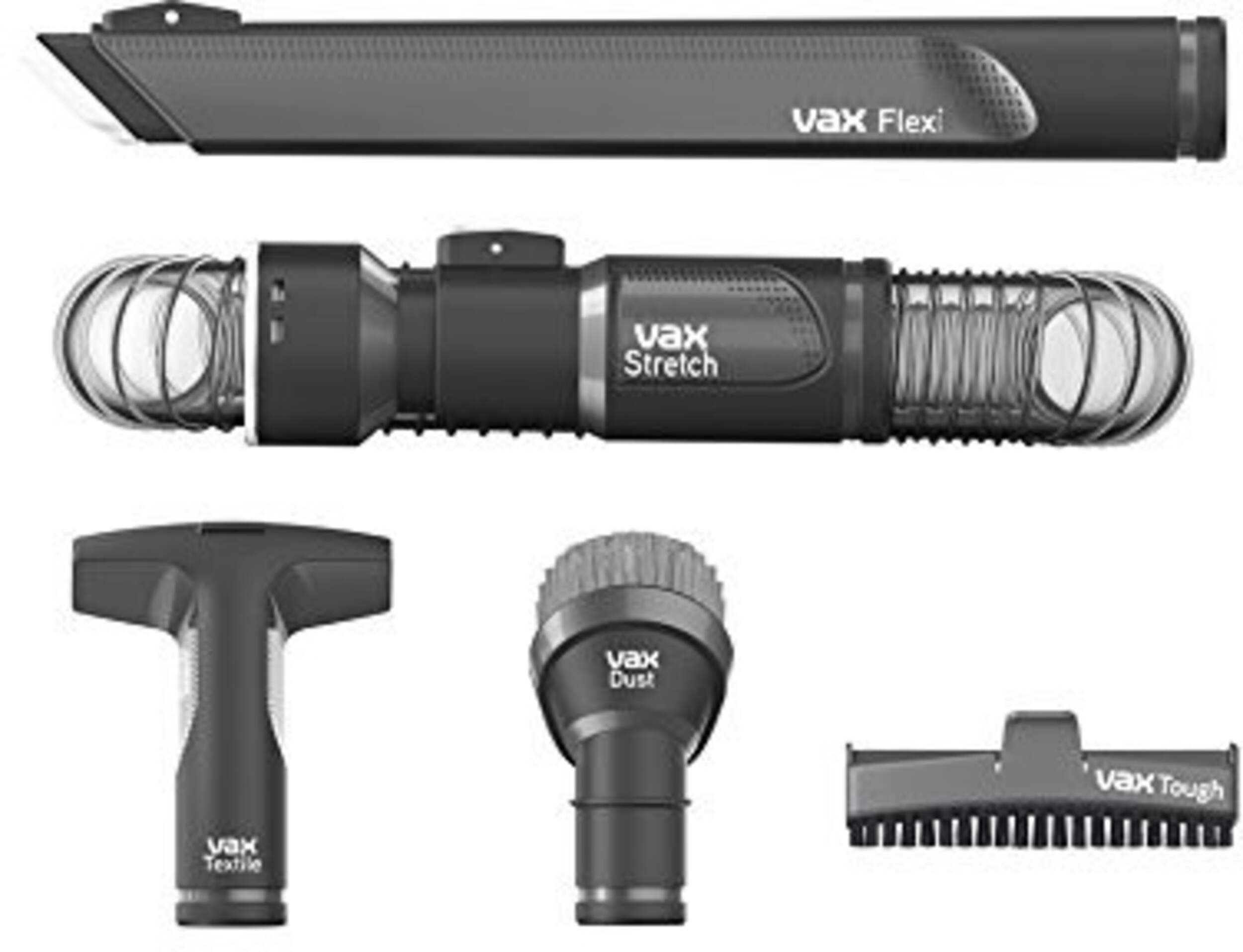 Includes Flexi crevice tool, textile tool, tough dirt tool dust brush and stretch hose
