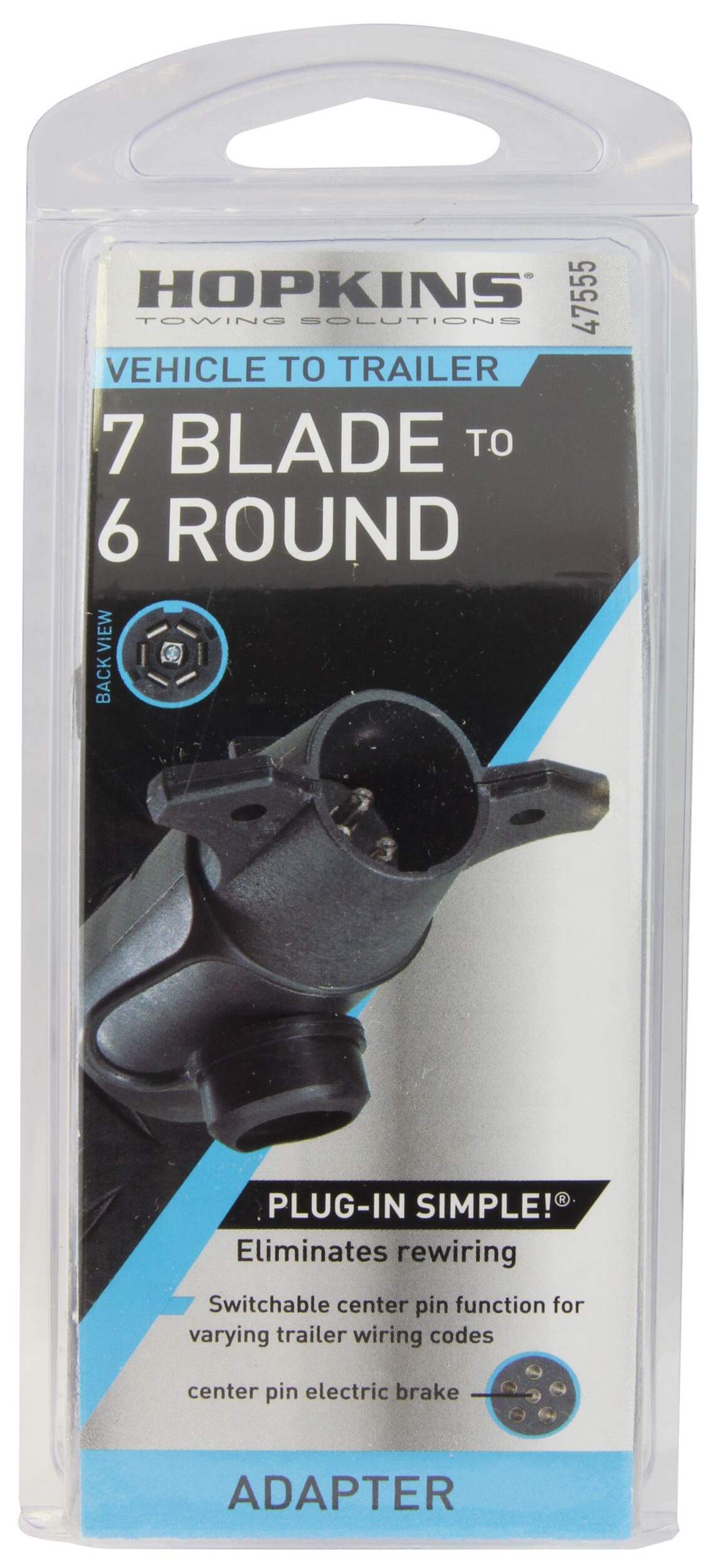 The 47555 7 Blade to 6 Pole Round adapter allows you to adapt down from a 7 Blade connector to a 6 Pole round trailer side connector without having to rewire the truck or trailer. This adapter also allows you to open it and change the pin locations for auxiliary and electric brakes making it the perfect adapter for either 6 Pole Round wiring code. An included dust cover adds an extra layer of weatherproofing for long lasting performance.