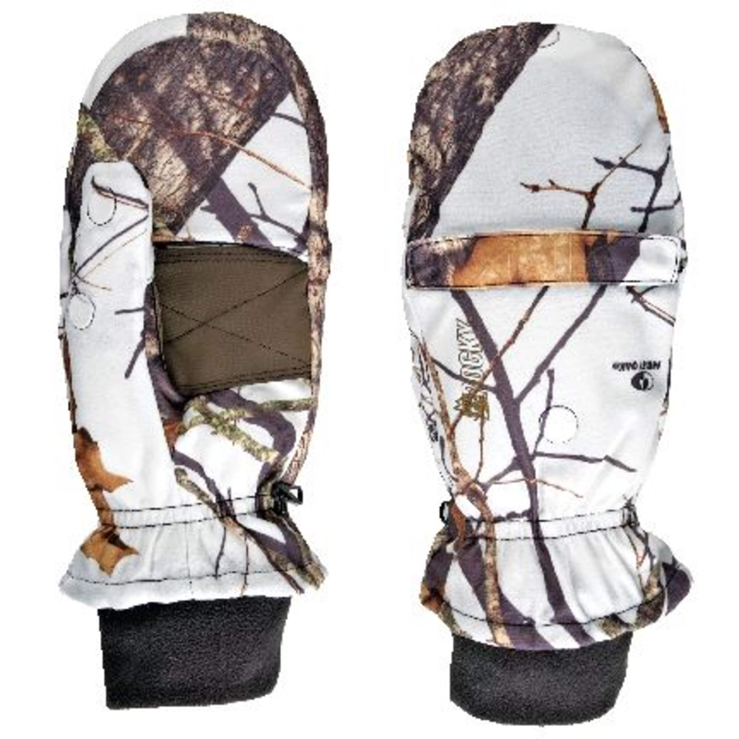 Hot Shot Insulated Touch-Screen Flip Mittens/Gloves for Hunting come in Rocky Snow Camo. These mitts feature a magnetic clasp to securely flip and cover your fingers. Designed with a digital palm for an improved grip, they also boast a fleece lining and storm cuff for added warmth. Each pair includes a zippered pouch on the back for hand warmers, sold separately. Available in various sizes, these mitts offer a blend of comfort and functional design.