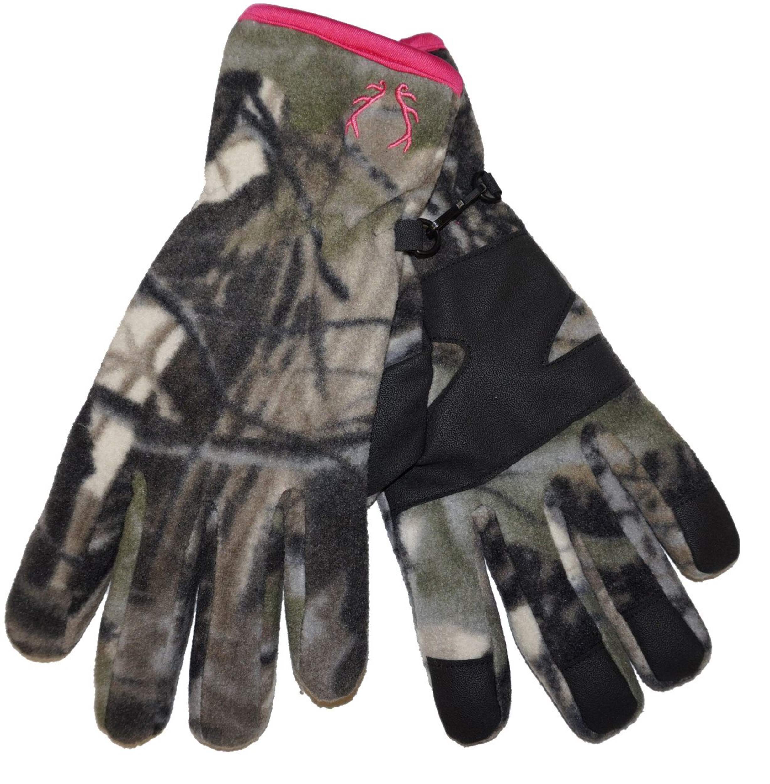 These insulated fleece hunting gloves will keep your hands cozy and warm without bulk. Made with soft camo fleece and thinsulate lining, the gloves keep heat in while the non-slip PU palm and fingertips allow a sure grip on your gear. The pink cuff binding adds a dash of color perfect for chilly mornings in the blind.