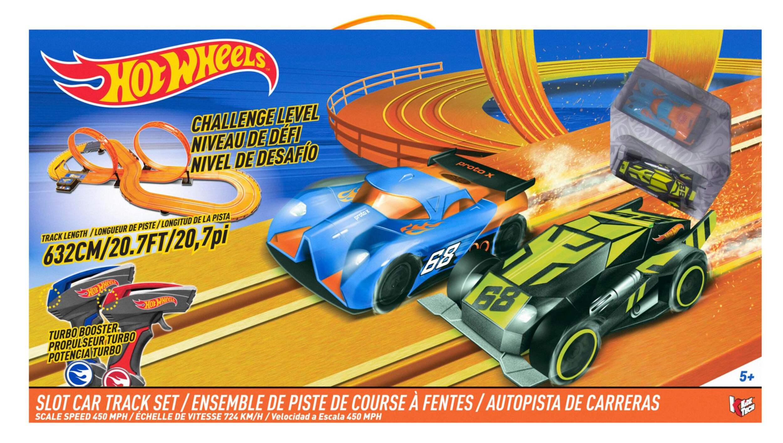 Set includes track, (2) 3.5" Hot Wheels vehicles with working headlights, 2 wired controllers with Turbo Booster and (1) AC adaptor