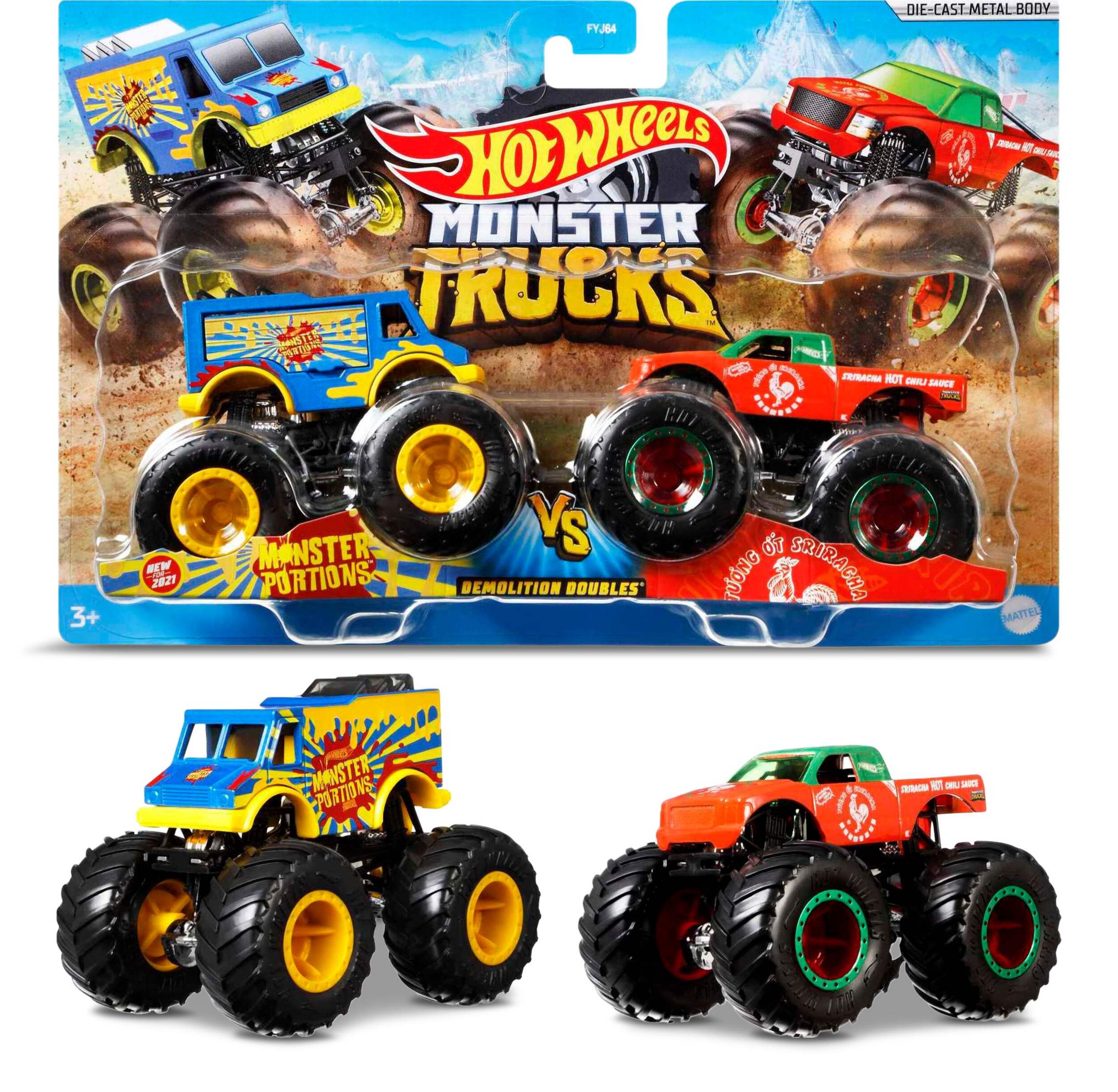The Hot Wheels® Monster Trucks 1:64 Scale Demolition Doubles™ trucks stand by to smash their arch-rivals! These two-packs of Monster Trucks squaring-off for epic crash attacks are purposely paired for head-to-head battles with their GIANT wheels and big personalities! Every package includes two opponents and the package provides stats for each including name, truck type, strength, unique crash attack and motor-vation for great storytelling fun! Each sold separately, subject to availability. Colors and decorations may vary.