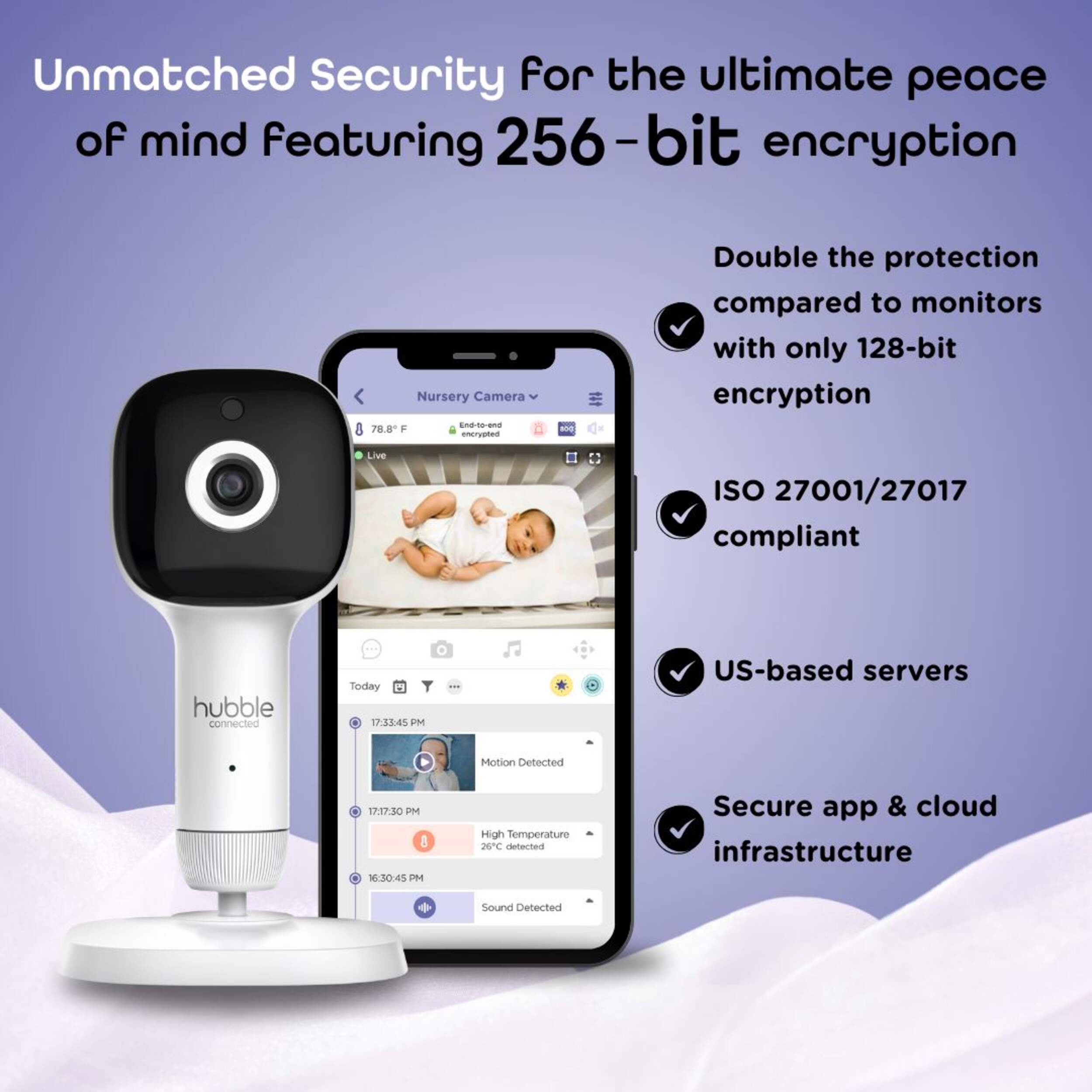 Experience the game-changing Hubble Connected SkyVision AI Pro Smart Baby Monitor, designed to deliver unrivaled safety, convenience, and entertainment for both babies and parents.Hubble SkyVision AI Pro. Delivering Advanced Protection with a Tender Touch.Patented Dual Mode MonitoringFull HD Overhead and Flexible Views. See your baby with crystal-clear Full HD video from the crib mount for a true overhead view or use the desktop mount for flexible monitoring anywhere in the nursery.;AI-Powered Notifications powered by Hubble AI. Hubble Advanced AI technology detects covered faces, rollovers, and crying, sending alerts only when your baby truly needs you.;5” HD Touch Parent Unit and App Viewing. Monitor in real time on the included HD touch display with or without Wi-Fi, or stream from anywhere on your smartphone using the HubbleClub app.; Built-In Sleep Trainer and Soother. Help your baby develop healthy sleep habits with gentle light cues and calming sounds designed for day and night routines.; Clear Day and Night Vision. Enjoy a sharp, detailed view of your baby around the clock with automatic infrared night vision.; Secure and Reliable Connection.Advanced 256-bit encryption safeguards your video and audio streams so only you can see and hear your baby.